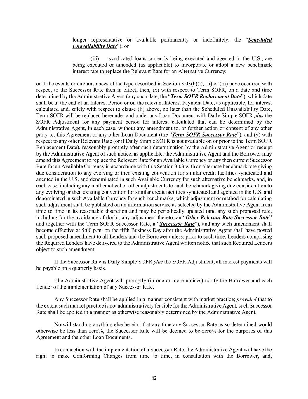 82 longer representative or available permanently or indefinitely, the “Scheduled Unavailability Date”); or (iii) syndicated loans currently being executed and agented in the U.S., are being executed or amended (as applicable) to incorporate or adopt a new benchmark interest rate to replace the Relevant Rate for an Alternative Currency; or if the events or circumstances of the type described in Section 3.03(b)(i), (ii) or (iii) have occurred with respect to the Successor Rate then in effect, then, (x) with respect to Term SOFR, on a date and time determined by the Administrative Agent (any such date, the “Term SOFR Replacement Date”), which date shall be at the end of an Interest Period or on the relevant Interest Payment Date, as applicable, for interest calculated and, solely with respect to clause (ii) above, no later than the Scheduled Unavailability Date, Term SOFR will be replaced hereunder and under any Loan Document with Daily Simple SOFR plus the SOFR Adjustment for any payment period for interest calculated that can be determined by the Administrative Agent, in each case, without any amendment to, or further action or consent of any other party to, this Agreement or any other Loan Document (the “Term SOFR Successor Rate”), and (y) with respect to any other Relevant Rate (or if Daily Simple SOFR is not available on or prior to the Term SOFR Replacement Date), reasonably promptly after such determination by the Administrative Agent or receipt by the Administrative Agent of such notice, as applicable, the Administrative Agent and the Borrower may amend this Agreement to replace the Relevant Rate for an Available Currency or any then current Successor Rate for an Available Currency in accordance with this Section 3.03 with an alternate benchmark rate giving due consideration to any evolving or then existing convention for similar credit facilities syndicated and agented in the U.S. and denominated in such Available Currency for such alternative benchmarks, and, in each case, including any mathematical or other adjustments to such benchmark giving due consideration to any evolving or then existing convention for similar credit facilities syndicated and agented in the U.S. and denominated in such Available Currency for such benchmarks, which adjustment or method for calculating such adjustment shall be published on an information service as selected by the Administrative Agent from time to time in its reasonable discretion and may be periodically updated (and any such proposed rate, including for the avoidance of doubt, any adjustment thereto, an “Other Relevant Rate Successor Rate” and together with the Term SOFR Successor Rate, a “Successor Rate”), and any such amendment shall become effective at 5:00 p.m. on the fifth Business Day after the Administrative Agent shall have posted such proposed amendment to all Lenders and the Borrower unless, prior to such time, Lenders comprising the Required Lenders have delivered to the Administrative Agent written notice that such Required Lenders object to such amendment. If the Successor Rate is Daily Simple SOFR plus the SOFR Adjustment, all interest payments will be payable on a quarterly basis. The Administrative Agent will promptly (in one or more notices) notify the Borrower and each Lender of the implementation of any Successor Rate. Any Successor Rate shall be applied in a manner consistent with market practice; provided that to the extent such market practice is not administratively feasible for the Administrative Agent, such Successor Rate shall be applied in a manner as otherwise reasonably determined by the Administrative Agent. Notwithstanding anything else herein, if at any time any Successor Rate as so determined would otherwise be less than zero%, the Successor Rate will be deemed to be zero% for the purposes of this Agreement and the other Loan Documents. In connection with the implementation of a Successor Rate, the Administrative Agent will have the right to make Conforming Changes from time to time, in consultation with the Borrower, and,