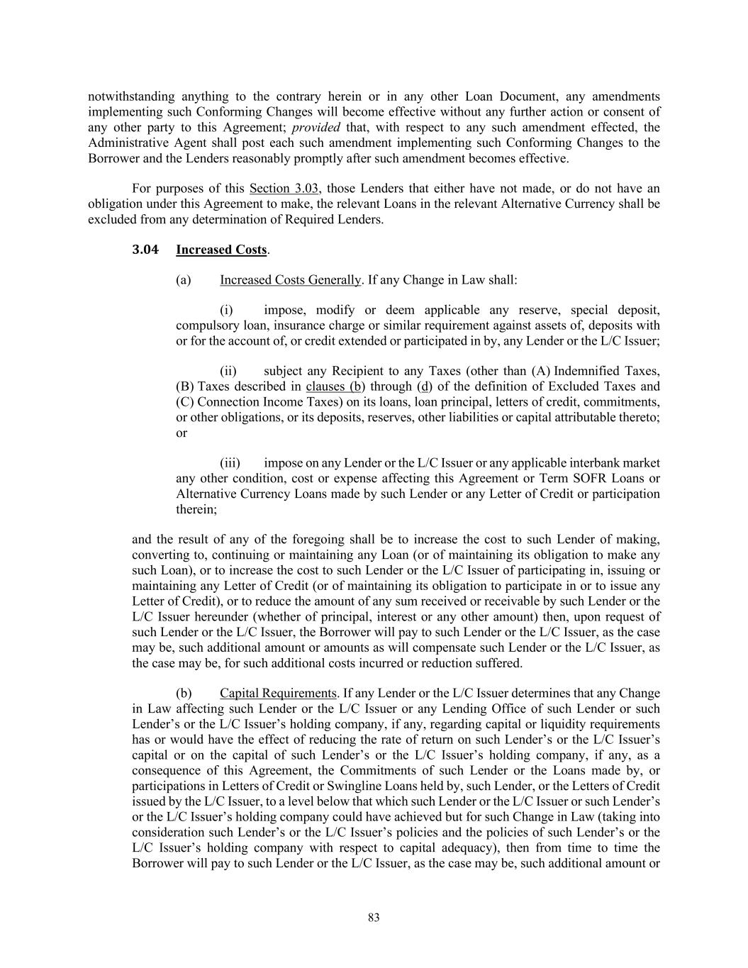 83 notwithstanding anything to the contrary herein or in any other Loan Document, any amendments implementing such Conforming Changes will become effective without any further action or consent of any other party to this Agreement; provided that, with respect to any such amendment effected, the Administrative Agent shall post each such amendment implementing such Conforming Changes to the Borrower and the Lenders reasonably promptly after such amendment becomes effective. For purposes of this Section 3.03, those Lenders that either have not made, or do not have an obligation under this Agreement to make, the relevant Loans in the relevant Alternative Currency shall be excluded from any determination of Required Lenders. 3.04 Increased Costs. (a) Increased Costs Generally. If any Change in Law shall: (i) impose, modify or deem applicable any reserve, special deposit, compulsory loan, insurance charge or similar requirement against assets of, deposits with or for the account of, or credit extended or participated in by, any Lender or the L/C Issuer; (ii) subject any Recipient to any Taxes (other than (A) Indemnified Taxes, (B) Taxes described in clauses (b) through (d) of the definition of Excluded Taxes and (C) Connection Income Taxes) on its loans, loan principal, letters of credit, commitments, or other obligations, or its deposits, reserves, other liabilities or capital attributable thereto; or (iii) impose on any Lender or the L/C Issuer or any applicable interbank market any other condition, cost or expense affecting this Agreement or Term SOFR Loans or Alternative Currency Loans made by such Lender or any Letter of Credit or participation therein; and the result of any of the foregoing shall be to increase the cost to such Lender of making, converting to, continuing or maintaining any Loan (or of maintaining its obligation to make any such Loan), or to increase the cost to such Lender or the L/C Issuer of participating in, issuing or maintaining any Letter of Credit (or of maintaining its obligation to participate in or to issue any Letter of Credit), or to reduce the amount of any sum received or receivable by such Lender or the L/C Issuer hereunder (whether of principal, interest or any other amount) then, upon request of such Lender or the L/C Issuer, the Borrower will pay to such Lender or the L/C Issuer, as the case may be, such additional amount or amounts as will compensate such Lender or the L/C Issuer, as the case may be, for such additional costs incurred or reduction suffered. (b) Capital Requirements. If any Lender or the L/C Issuer determines that any Change in Law affecting such Lender or the L/C Issuer or any Lending Office of such Lender or such Lender’s or the L/C Issuer’s holding company, if any, regarding capital or liquidity requirements has or would have the effect of reducing the rate of return on such Lender’s or the L/C Issuer’s capital or on the capital of such Lender’s or the L/C Issuer’s holding company, if any, as a consequence of this Agreement, the Commitments of such Lender or the Loans made by, or participations in Letters of Credit or Swingline Loans held by, such Lender, or the Letters of Credit issued by the L/C Issuer, to a level below that which such Lender or the L/C Issuer or such Lender’s or the L/C Issuer’s holding company could have achieved but for such Change in Law (taking into consideration such Lender’s or the L/C Issuer’s policies and the policies of such Lender’s or the L/C Issuer’s holding company with respect to capital adequacy), then from time to time the Borrower will pay to such Lender or the L/C Issuer, as the case may be, such additional amount or