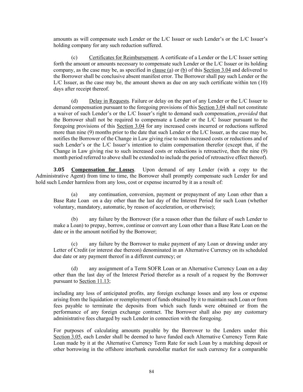 84 amounts as will compensate such Lender or the L/C Issuer or such Lender’s or the L/C Issuer’s holding company for any such reduction suffered. (c) Certificates for Reimbursement. A certificate of a Lender or the L/C Issuer setting forth the amount or amounts necessary to compensate such Lender or the L/C Issuer or its holding company, as the case may be, as specified in clause (a) or (b) of this Section 3.04 and delivered to the Borrower shall be conclusive absent manifest error. The Borrower shall pay such Lender or the L/C Issuer, as the case may be, the amount shown as due on any such certificate within ten (10) days after receipt thereof. (d) Delay in Requests. Failure or delay on the part of any Lender or the L/C Issuer to demand compensation pursuant to the foregoing provisions of this Section 3.04 shall not constitute a waiver of such Lender’s or the L/C Issuer’s right to demand such compensation, provided that the Borrower shall not be required to compensate a Lender or the L/C Issuer pursuant to the foregoing provisions of this Section 3.04 for any increased costs incurred or reductions suffered more than nine (9) months prior to the date that such Lender or the L/C Issuer, as the case may be, notifies the Borrower of the Change in Law giving rise to such increased costs or reductions and of such Lender’s or the L/C Issuer’s intention to claim compensation therefor (except that, if the Change in Law giving rise to such increased costs or reductions is retroactive, then the nine (9) month period referred to above shall be extended to include the period of retroactive effect thereof). 3.05 Compensation for Losses. Upon demand of any Lender (with a copy to the Administrative Agent) from time to time, the Borrower shall promptly compensate such Lender for and hold such Lender harmless from any loss, cost or expense incurred by it as a result of: (a) any continuation, conversion, payment or prepayment of any Loan other than a Base Rate Loan on a day other than the last day of the Interest Period for such Loan (whether voluntary, mandatory, automatic, by reason of acceleration, or otherwise); (b) any failure by the Borrower (for a reason other than the failure of such Lender to make a Loan) to prepay, borrow, continue or convert any Loan other than a Base Rate Loan on the date or in the amount notified by the Borrower; (c) any failure by the Borrower to make payment of any Loan or drawing under any Letter of Credit (or interest due thereon) denominated in an Alternative Currency on its scheduled due date or any payment thereof in a different currency; or (d) any assignment of a Term SOFR Loan or an Alternative Currency Loan on a day other than the last day of the Interest Period therefor as a result of a request by the Borrower pursuant to Section 11.13; including any loss of anticipated profits, any foreign exchange losses and any loss or expense arising from the liquidation or reemployment of funds obtained by it to maintain such Loan or from fees payable to terminate the deposits from which such funds were obtained or from the performance of any foreign exchange contract. The Borrower shall also pay any customary administrative fees charged by such Lender in connection with the foregoing. For purposes of calculating amounts payable by the Borrower to the Lenders under this Section 3.05, each Lender shall be deemed to have funded each Alternative Currency Term Rate Loan made by it at the Alternative Currency Term Rate for such Loan by a matching deposit or other borrowing in the offshore interbank eurodollar market for such currency for a comparable