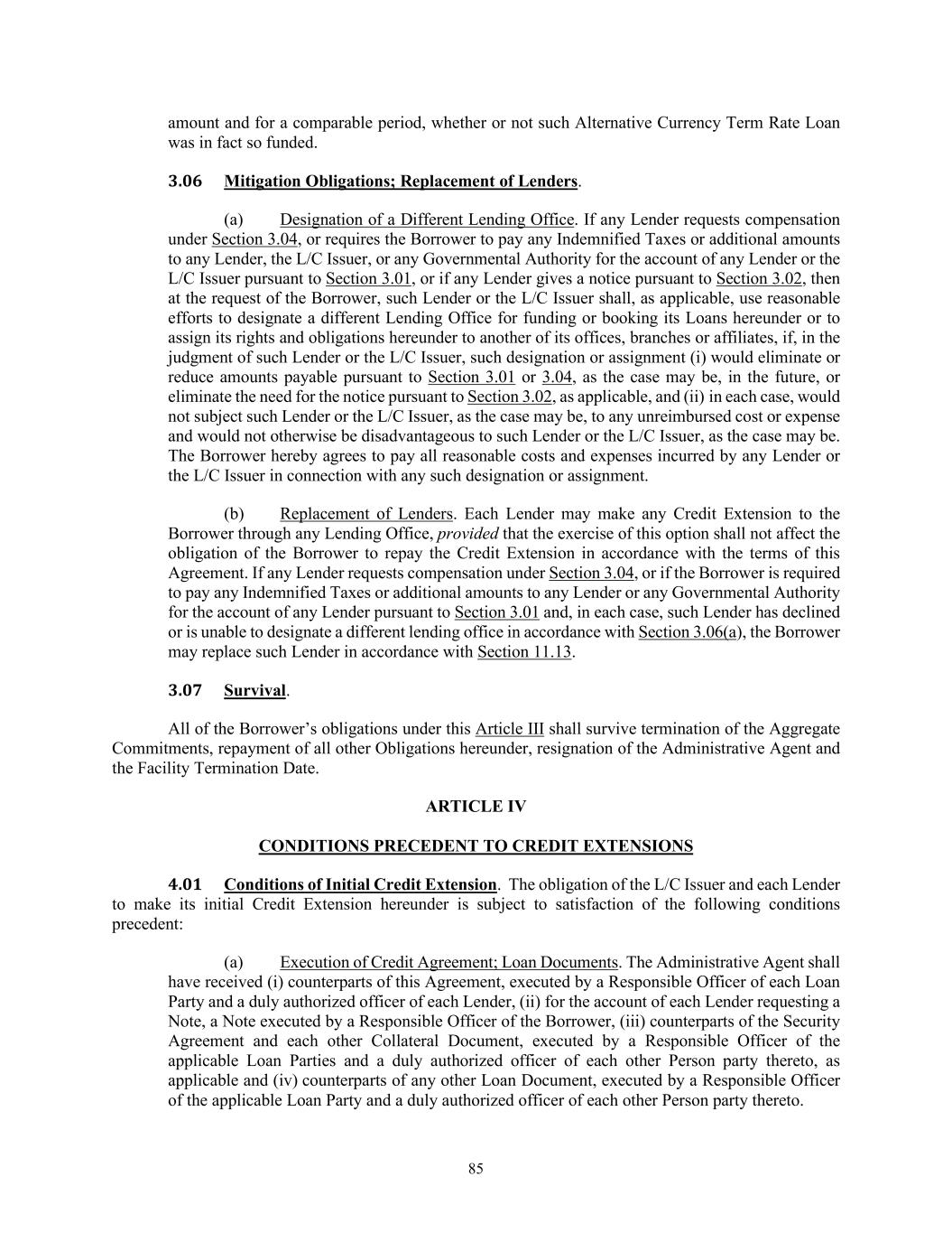 85 amount and for a comparable period, whether or not such Alternative Currency Term Rate Loan was in fact so funded. 3.06 Mitigation Obligations; Replacement of Lenders. (a) Designation of a Different Lending Office. If any Lender requests compensation under Section 3.04, or requires the Borrower to pay any Indemnified Taxes or additional amounts to any Lender, the L/C Issuer, or any Governmental Authority for the account of any Lender or the L/C Issuer pursuant to Section 3.01, or if any Lender gives a notice pursuant to Section 3.02, then at the request of the Borrower, such Lender or the L/C Issuer shall, as applicable, use reasonable efforts to designate a different Lending Office for funding or booking its Loans hereunder or to assign its rights and obligations hereunder to another of its offices, branches or affiliates, if, in the judgment of such Lender or the L/C Issuer, such designation or assignment (i) would eliminate or reduce amounts payable pursuant to Section 3.01 or 3.04, as the case may be, in the future, or eliminate the need for the notice pursuant to Section 3.02, as applicable, and (ii) in each case, would not subject such Lender or the L/C Issuer, as the case may be, to any unreimbursed cost or expense and would not otherwise be disadvantageous to such Lender or the L/C Issuer, as the case may be. The Borrower hereby agrees to pay all reasonable costs and expenses incurred by any Lender or the L/C Issuer in connection with any such designation or assignment. (b) Replacement of Lenders. Each Lender may make any Credit Extension to the Borrower through any Lending Office, provided that the exercise of this option shall not affect the obligation of the Borrower to repay the Credit Extension in accordance with the terms of this Agreement. If any Lender requests compensation under Section 3.04, or if the Borrower is required to pay any Indemnified Taxes or additional amounts to any Lender or any Governmental Authority for the account of any Lender pursuant to Section 3.01 and, in each case, such Lender has declined or is unable to designate a different lending office in accordance with Section 3.06(a), the Borrower may replace such Lender in accordance with Section 11.13. 3.07 Survival. All of the Borrower’s obligations under this Article III shall survive termination of the Aggregate Commitments, repayment of all other Obligations hereunder, resignation of the Administrative Agent and the Facility Termination Date. ARTICLE IV CONDITIONS PRECEDENT TO CREDIT EXTENSIONS 4.01 Conditions of Initial Credit Extension. The obligation of the L/C Issuer and each Lender to make its initial Credit Extension hereunder is subject to satisfaction of the following conditions precedent: (a) Execution of Credit Agreement; Loan Documents. The Administrative Agent shall have received (i) counterparts of this Agreement, executed by a Responsible Officer of each Loan Party and a duly authorized officer of each Lender, (ii) for the account of each Lender requesting a Note, a Note executed by a Responsible Officer of the Borrower, (iii) counterparts of the Security Agreement and each other Collateral Document, executed by a Responsible Officer of the applicable Loan Parties and a duly authorized officer of each other Person party thereto, as applicable and (iv) counterparts of any other Loan Document, executed by a Responsible Officer of the applicable Loan Party and a duly authorized officer of each other Person party thereto.