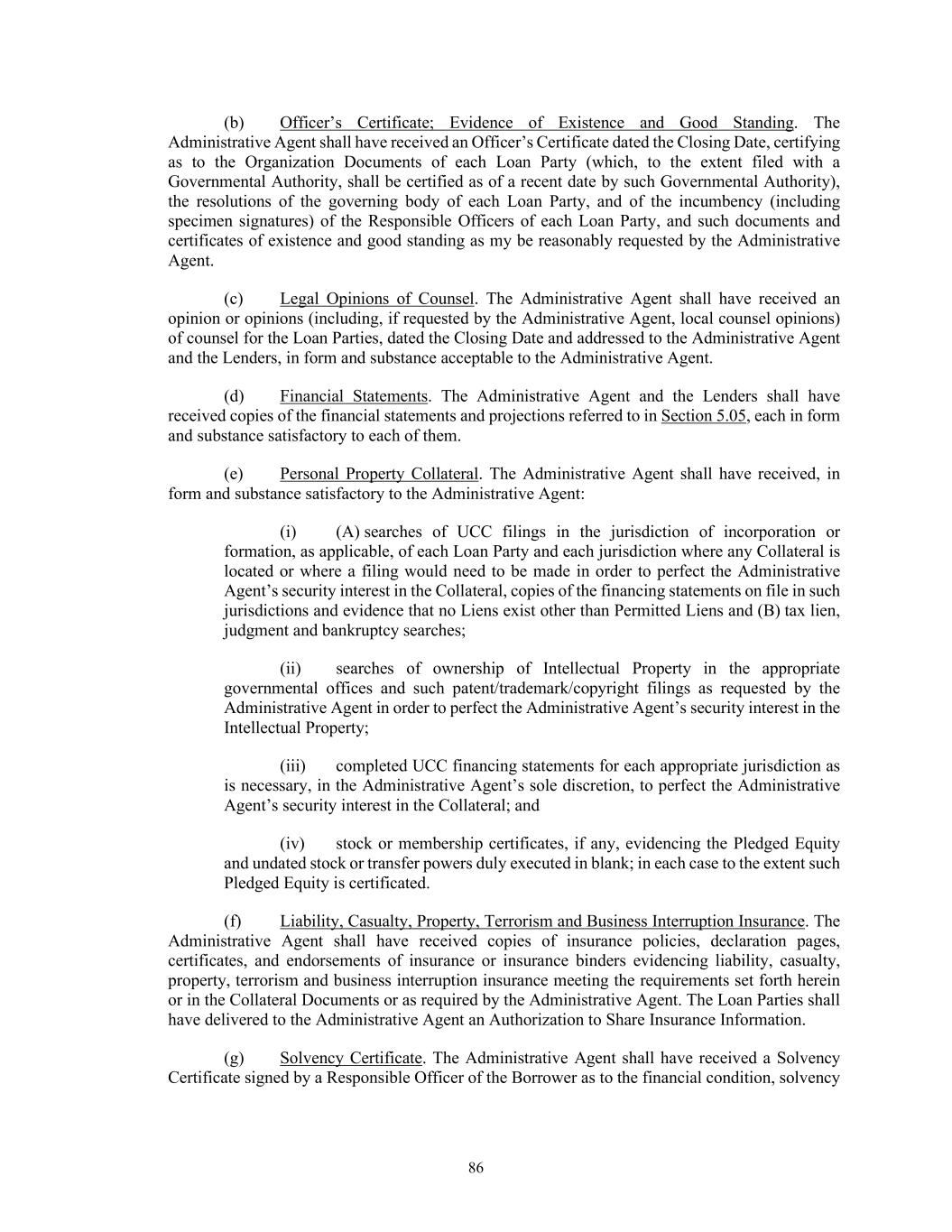 86 (b) Officer’s Certificate; Evidence of Existence and Good Standing. The Administrative Agent shall have received an Officer’s Certificate dated the Closing Date, certifying as to the Organization Documents of each Loan Party (which, to the extent filed with a Governmental Authority, shall be certified as of a recent date by such Governmental Authority), the resolutions of the governing body of each Loan Party, and of the incumbency (including specimen signatures) of the Responsible Officers of each Loan Party, and such documents and certificates of existence and good standing as my be reasonably requested by the Administrative Agent. (c) Legal Opinions of Counsel. The Administrative Agent shall have received an opinion or opinions (including, if requested by the Administrative Agent, local counsel opinions) of counsel for the Loan Parties, dated the Closing Date and addressed to the Administrative Agent and the Lenders, in form and substance acceptable to the Administrative Agent. (d) Financial Statements. The Administrative Agent and the Lenders shall have received copies of the financial statements and projections referred to in Section 5.05, each in form and substance satisfactory to each of them. (e) Personal Property Collateral. The Administrative Agent shall have received, in form and substance satisfactory to the Administrative Agent: (i) (A) searches of UCC filings in the jurisdiction of incorporation or formation, as applicable, of each Loan Party and each jurisdiction where any Collateral is located or where a filing would need to be made in order to perfect the Administrative Agent’s security interest in the Collateral, copies of the financing statements on file in such jurisdictions and evidence that no Liens exist other than Permitted Liens and (B) tax lien, judgment and bankruptcy searches; (ii) searches of ownership of Intellectual Property in the appropriate governmental offices and such patent/trademark/copyright filings as requested by the Administrative Agent in order to perfect the Administrative Agent’s security interest in the Intellectual Property; (iii) completed UCC financing statements for each appropriate jurisdiction as is necessary, in the Administrative Agent’s sole discretion, to perfect the Administrative Agent’s security interest in the Collateral; and (iv) stock or membership certificates, if any, evidencing the Pledged Equity and undated stock or transfer powers duly executed in blank; in each case to the extent such Pledged Equity is certificated. (f) Liability, Casualty, Property, Terrorism and Business Interruption Insurance. The Administrative Agent shall have received copies of insurance policies, declaration pages, certificates, and endorsements of insurance or insurance binders evidencing liability, casualty, property, terrorism and business interruption insurance meeting the requirements set forth herein or in the Collateral Documents or as required by the Administrative Agent. The Loan Parties shall have delivered to the Administrative Agent an Authorization to Share Insurance Information. (g) Solvency Certificate. The Administrative Agent shall have received a Solvency Certificate signed by a Responsible Officer of the Borrower as to the financial condition, solvency