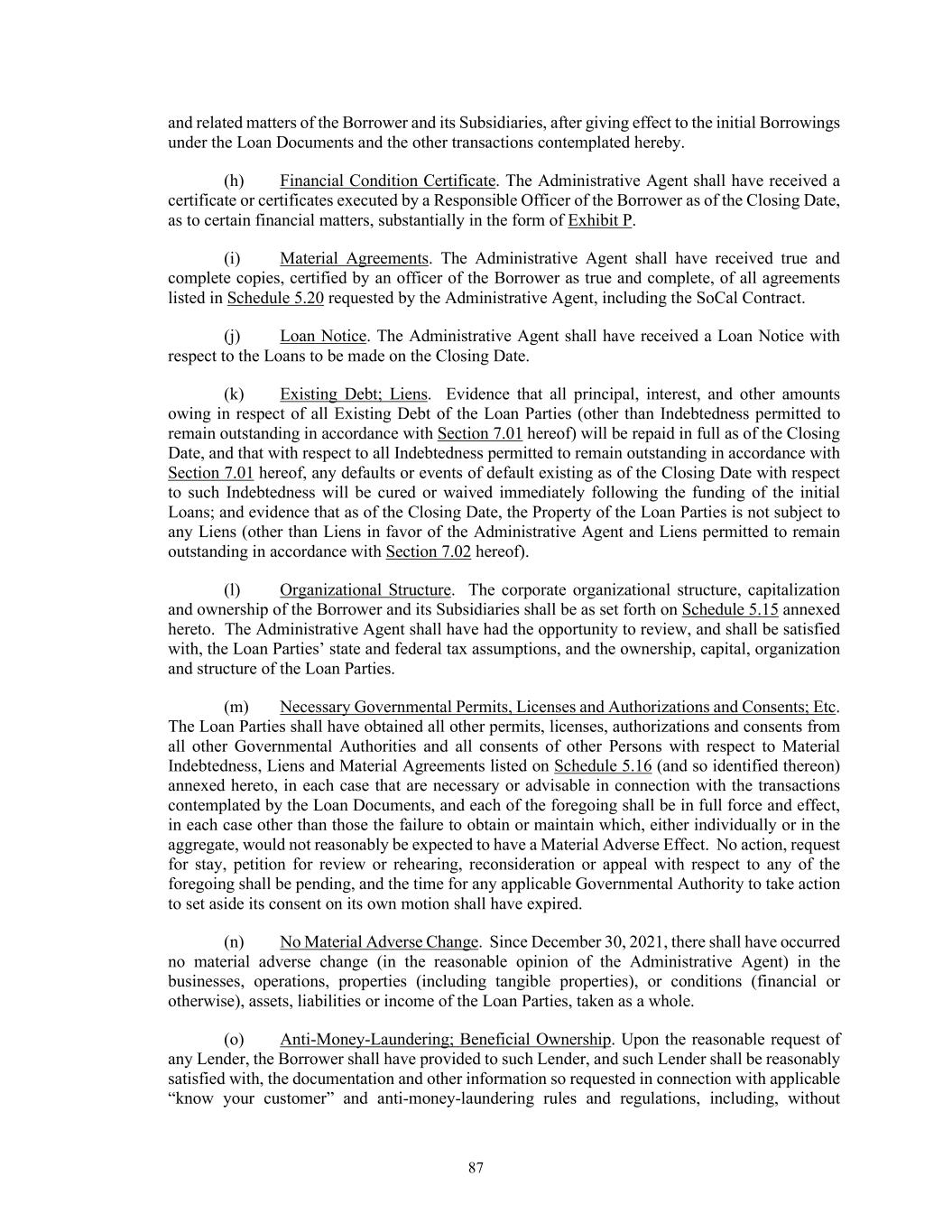 87 and related matters of the Borrower and its Subsidiaries, after giving effect to the initial Borrowings under the Loan Documents and the other transactions contemplated hereby. (h) Financial Condition Certificate. The Administrative Agent shall have received a certificate or certificates executed by a Responsible Officer of the Borrower as of the Closing Date, as to certain financial matters, substantially in the form of Exhibit P. (i) Material Agreements. The Administrative Agent shall have received true and complete copies, certified by an officer of the Borrower as true and complete, of all agreements listed in Schedule 5.20 requested by the Administrative Agent, including the SoCal Contract. (j) Loan Notice. The Administrative Agent shall have received a Loan Notice with respect to the Loans to be made on the Closing Date. (k) Existing Debt; Liens. Evidence that all principal, interest, and other amounts owing in respect of all Existing Debt of the Loan Parties (other than Indebtedness permitted to remain outstanding in accordance with Section 7.01 hereof) will be repaid in full as of the Closing Date, and that with respect to all Indebtedness permitted to remain outstanding in accordance with Section 7.01 hereof, any defaults or events of default existing as of the Closing Date with respect to such Indebtedness will be cured or waived immediately following the funding of the initial Loans; and evidence that as of the Closing Date, the Property of the Loan Parties is not subject to any Liens (other than Liens in favor of the Administrative Agent and Liens permitted to remain outstanding in accordance with Section 7.02 hereof). (l) Organizational Structure. The corporate organizational structure, capitalization and ownership of the Borrower and its Subsidiaries shall be as set forth on Schedule 5.15 annexed hereto. The Administrative Agent shall have had the opportunity to review, and shall be satisfied with, the Loan Parties’ state and federal tax assumptions, and the ownership, capital, organization and structure of the Loan Parties. (m) Necessary Governmental Permits, Licenses and Authorizations and Consents; Etc. The Loan Parties shall have obtained all other permits, licenses, authorizations and consents from all other Governmental Authorities and all consents of other Persons with respect to Material Indebtedness, Liens and Material Agreements listed on Schedule 5.16 (and so identified thereon) annexed hereto, in each case that are necessary or advisable in connection with the transactions contemplated by the Loan Documents, and each of the foregoing shall be in full force and effect, in each case other than those the failure to obtain or maintain which, either individually or in the aggregate, would not reasonably be expected to have a Material Adverse Effect. No action, request for stay, petition for review or rehearing, reconsideration or appeal with respect to any of the foregoing shall be pending, and the time for any applicable Governmental Authority to take action to set aside its consent on its own motion shall have expired. (n) No Material Adverse Change. Since December 30, 2021, there shall have occurred no material adverse change (in the reasonable opinion of the Administrative Agent) in the businesses, operations, properties (including tangible properties), or conditions (financial or otherwise), assets, liabilities or income of the Loan Parties, taken as a whole. (o) Anti-Money-Laundering; Beneficial Ownership. Upon the reasonable request of any Lender, the Borrower shall have provided to such Lender, and such Lender shall be reasonably satisfied with, the documentation and other information so requested in connection with applicable “know your customer” and anti-money-laundering rules and regulations, including, without