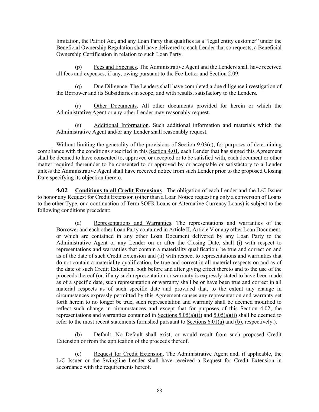 88 limitation, the Patriot Act, and any Loan Party that qualifies as a “legal entity customer” under the Beneficial Ownership Regulation shall have delivered to each Lender that so requests, a Beneficial Ownership Certification in relation to such Loan Party. (p) Fees and Expenses. The Administrative Agent and the Lenders shall have received all fees and expenses, if any, owing pursuant to the Fee Letter and Section 2.09. (q) Due Diligence. The Lenders shall have completed a due diligence investigation of the Borrower and its Subsidiaries in scope, and with results, satisfactory to the Lenders. (r) Other Documents. All other documents provided for herein or which the Administrative Agent or any other Lender may reasonably request. (s) Additional Information. Such additional information and materials which the Administrative Agent and/or any Lender shall reasonably request. Without limiting the generality of the provisions of Section 9.03(c), for purposes of determining compliance with the conditions specified in this Section 4.01, each Lender that has signed this Agreement shall be deemed to have consented to, approved or accepted or to be satisfied with, each document or other matter required thereunder to be consented to or approved by or acceptable or satisfactory to a Lender unless the Administrative Agent shall have received notice from such Lender prior to the proposed Closing Date specifying its objection thereto. 4.02 Conditions to all Credit Extensions. The obligation of each Lender and the L/C Issuer to honor any Request for Credit Extension (other than a Loan Notice requesting only a conversion of Loans to the other Type, or a continuation of Term SOFR Loans or Alternative Currency Loans) is subject to the following conditions precedent: (a) Representations and Warranties. The representations and warranties of the Borrower and each other Loan Party contained in Article II, Article V or any other Loan Document, or which are contained in any other Loan Document delivered by any Loan Party to the Administrative Agent or any Lender on or after the Closing Date, shall (i) with respect to representations and warranties that contain a materiality qualification, be true and correct on and as of the date of such Credit Extension and (ii) with respect to representations and warranties that do not contain a materiality qualification, be true and correct in all material respects on and as of the date of such Credit Extension, both before and after giving effect thereto and to the use of the proceeds thereof (or, if any such representation or warranty is expressly stated to have been made as of a specific date, such representation or warranty shall be or have been true and correct in all material respects as of such specific date and provided that, to the extent any change in circumstances expressly permitted by this Agreement causes any representation and warranty set forth herein to no longer be true, such representation and warranty shall be deemed modified to reflect such change in circumstances and except that for purposes of this Section 4.02, the representations and warranties contained in Sections 5.05(a)(i)) and 5.05(a)(ii) shall be deemed to refer to the most recent statements furnished pursuant to Sections 6.01(a) and (b), respectively.). (b) Default. No Default shall exist, or would result from such proposed Credit Extension or from the application of the proceeds thereof. (c) Request for Credit Extension. The Administrative Agent and, if applicable, the L/C Issuer or the Swingline Lender shall have received a Request for Credit Extension in accordance with the requirements hereof.