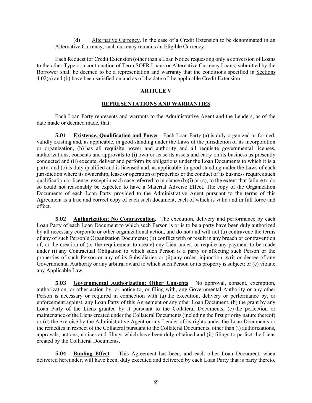 89 (d) Alternative Currency. In the case of a Credit Extension to be denominated in an Alternative Currency, such currency remains an Eligible Currency. Each Request for Credit Extension (other than a Loan Notice requesting only a conversion of Loans to the other Type or a continuation of Term SOFR Loans or Alternative Currency Loans) submitted by the Borrower shall be deemed to be a representation and warranty that the conditions specified in Sections 4.02(a) and (b) have been satisfied on and as of the date of the applicable Credit Extension. ARTICLE V REPRESENTATIONS AND WARRANTIES Each Loan Party represents and warrants to the Administrative Agent and the Lenders, as of the date made or deemed made, that: 5.01 Existence, Qualification and Power. Each Loan Party (a) is duly organized or formed, validly existing and, as applicable, in good standing under the Laws of the jurisdiction of its incorporation or organization, (b) has all requisite power and authority and all requisite governmental licenses, authorizations, consents and approvals to (i) own or lease its assets and carry on its business as presently conducted and (ii) execute, deliver and perform its obligations under the Loan Documents to which it is a party, and (c) is duly qualified and is licensed and, as applicable, in good standing under the Laws of each jurisdiction where its ownership, lease or operation of properties or the conduct of its business requires such qualification or license; except in each case referred to in clause (b)(i) or (c), to the extent that failure to do so could not reasonably be expected to have a Material Adverse Effect. The copy of the Organization Documents of each Loan Party provided to the Administrative Agent pursuant to the terms of this Agreement is a true and correct copy of each such document, each of which is valid and in full force and effect. 5.02 Authorization; No Contravention. The execution, delivery and performance by each Loan Party of each Loan Document to which such Person is or is to be a party have been duly authorized by all necessary corporate or other organizational action, and do not and will not (a) contravene the terms of any of such Person’s Organization Documents; (b) conflict with or result in any breach or contravention of, or the creation of (or the requirement to create) any Lien under, or require any payment to be made under (i) any Contractual Obligation to which such Person is a party or affecting such Person or the properties of such Person or any of its Subsidiaries or (ii) any order, injunction, writ or decree of any Governmental Authority or any arbitral award to which such Person or its property is subject; or (c) violate any Applicable Law. 5.03 Governmental Authorization; Other Consents. No approval, consent, exemption, authorization, or other action by, or notice to, or filing with, any Governmental Authority or any other Person is necessary or required in connection with (a) the execution, delivery or performance by, or enforcement against, any Loan Party of this Agreement or any other Loan Document, (b) the grant by any Loan Party of the Liens granted by it pursuant to the Collateral Documents, (c) the perfection or maintenance of the Liens created under the Collateral Documents (including the first priority nature thereof) or (d) the exercise by the Administrative Agent or any Lender of its rights under the Loan Documents or the remedies in respect of the Collateral pursuant to the Collateral Documents, other than (i) authorizations, approvals, actions, notices and filings which have been duly obtained and (ii) filings to perfect the Liens created by the Collateral Documents. 5.04 Binding Effect. This Agreement has been, and each other Loan Document, when delivered hereunder, will have been, duly executed and delivered by each Loan Party that is party thereto.