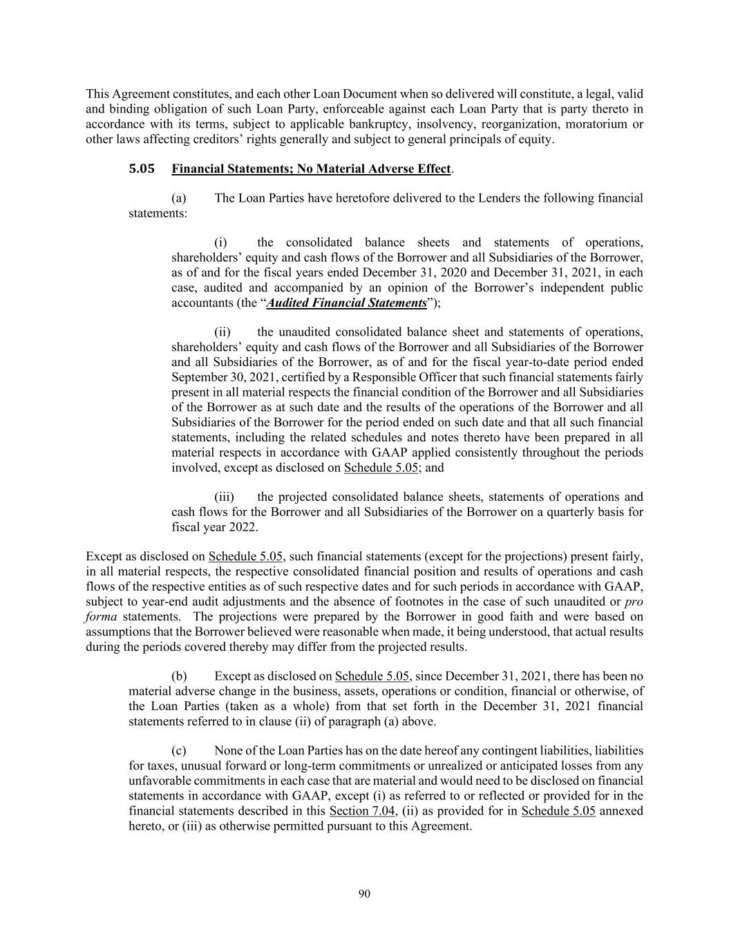 90 This Agreement constitutes, and each other Loan Document when so delivered will constitute, a legal, valid and binding obligation of such Loan Party, enforceable against each Loan Party that is party thereto in accordance with its terms, subject to applicable bankruptcy, insolvency, reorganization, moratorium or other laws affecting creditors’ rights generally and subject to general principals of equity. 5.05 Financial Statements; No Material Adverse Effect. (a) The Loan Parties have heretofore delivered to the Lenders the following financial statements: (i) the consolidated balance sheets and statements of operations, shareholders’ equity and cash flows of the Borrower and all Subsidiaries of the Borrower, as of and for the fiscal years ended December 31, 2020 and December 31, 2021, in each case, audited and accompanied by an opinion of the Borrower’s independent public accountants (the “Audited Financial Statements”); (ii) the unaudited consolidated balance sheet and statements of operations, shareholders’ equity and cash flows of the Borrower and all Subsidiaries of the Borrower and all Subsidiaries of the Borrower, as of and for the fiscal year-to-date period ended September 30, 2021, certified by a Responsible Officer that such financial statements fairly present in all material respects the financial condition of the Borrower and all Subsidiaries of the Borrower as at such date and the results of the operations of the Borrower and all Subsidiaries of the Borrower for the period ended on such date and that all such financial statements, including the related schedules and notes thereto have been prepared in all material respects in accordance with GAAP applied consistently throughout the periods involved, except as disclosed on Schedule 5.05; and (iii) the projected consolidated balance sheets, statements of operations and cash flows for the Borrower and all Subsidiaries of the Borrower on a quarterly basis for fiscal year 2022. Except as disclosed on Schedule 5.05, such financial statements (except for the projections) present fairly, in all material respects, the respective consolidated financial position and results of operations and cash flows of the respective entities as of such respective dates and for such periods in accordance with GAAP, subject to year-end audit adjustments and the absence of footnotes in the case of such unaudited or pro forma statements. The projections were prepared by the Borrower in good faith and were based on assumptions that the Borrower believed were reasonable when made, it being understood, that actual results during the periods covered thereby may differ from the projected results. (b) Except as disclosed on Schedule 5.05, since December 31, 2021, there has been no material adverse change in the business, assets, operations or condition, financial or otherwise, of the Loan Parties (taken as a whole) from that set forth in the December 31, 2021 financial statements referred to in clause (ii) of paragraph (a) above. (c) None of the Loan Parties has on the date hereof any contingent liabilities, liabilities for taxes, unusual forward or long-term commitments or unrealized or anticipated losses from any unfavorable commitments in each case that are material and would need to be disclosed on financial statements in accordance with GAAP, except (i) as referred to or reflected or provided for in the financial statements described in this Section 7.04, (ii) as provided for in Schedule 5.05 annexed hereto, or (iii) as otherwise permitted pursuant to this Agreement.