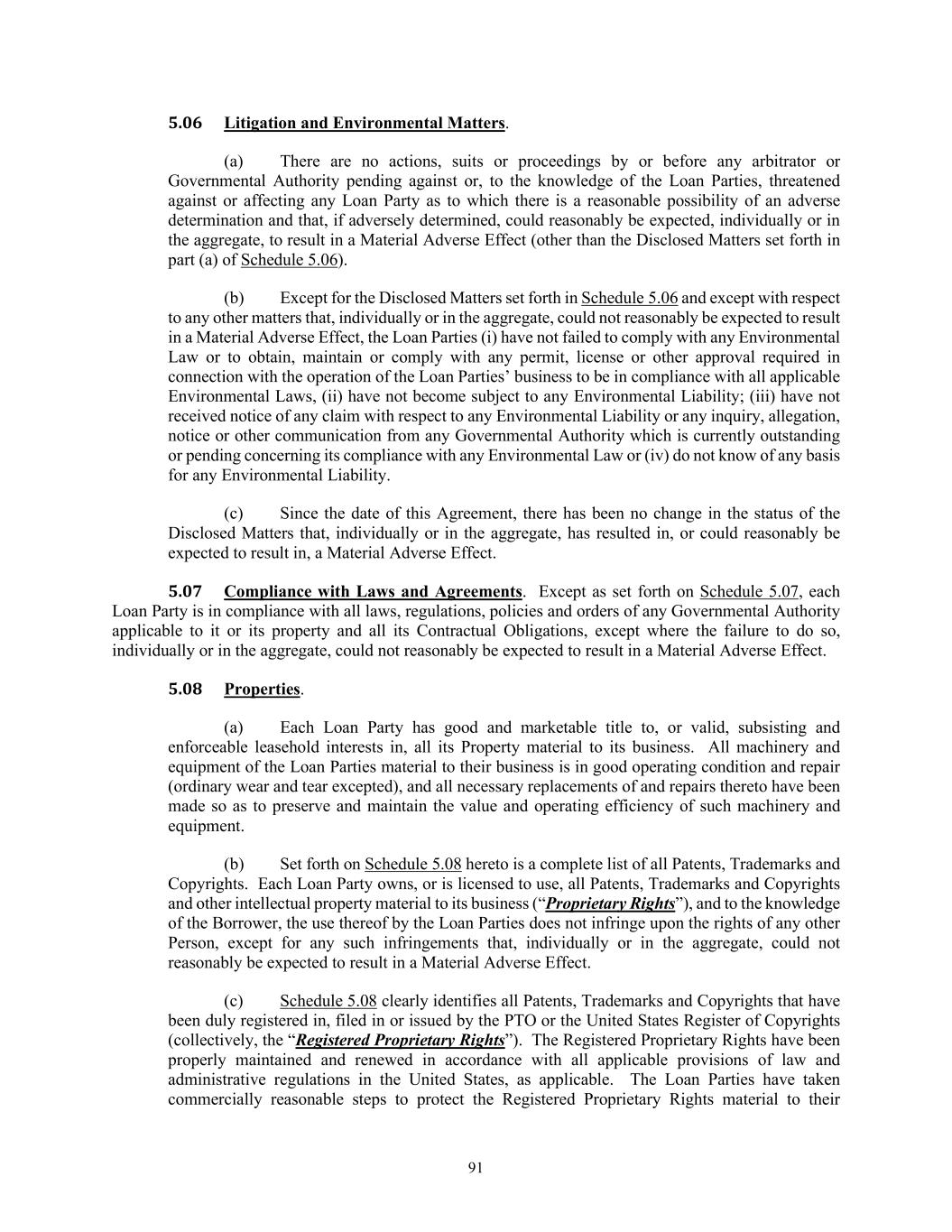 91 5.06 Litigation and Environmental Matters. (a) There are no actions, suits or proceedings by or before any arbitrator or Governmental Authority pending against or, to the knowledge of the Loan Parties, threatened against or affecting any Loan Party as to which there is a reasonable possibility of an adverse determination and that, if adversely determined, could reasonably be expected, individually or in the aggregate, to result in a Material Adverse Effect (other than the Disclosed Matters set forth in part (a) of Schedule 5.06). (b) Except for the Disclosed Matters set forth in Schedule 5.06 and except with respect to any other matters that, individually or in the aggregate, could not reasonably be expected to result in a Material Adverse Effect, the Loan Parties (i) have not failed to comply with any Environmental Law or to obtain, maintain or comply with any permit, license or other approval required in connection with the operation of the Loan Parties’ business to be in compliance with all applicable Environmental Laws, (ii) have not become subject to any Environmental Liability; (iii) have not received notice of any claim with respect to any Environmental Liability or any inquiry, allegation, notice or other communication from any Governmental Authority which is currently outstanding or pending concerning its compliance with any Environmental Law or (iv) do not know of any basis for any Environmental Liability. (c) Since the date of this Agreement, there has been no change in the status of the Disclosed Matters that, individually or in the aggregate, has resulted in, or could reasonably be expected to result in, a Material Adverse Effect. 5.07 Compliance with Laws and Agreements. Except as set forth on Schedule 5.07, each Loan Party is in compliance with all laws, regulations, policies and orders of any Governmental Authority applicable to it or its property and all its Contractual Obligations, except where the failure to do so, individually or in the aggregate, could not reasonably be expected to result in a Material Adverse Effect. 5.08 Properties. (a) Each Loan Party has good and marketable title to, or valid, subsisting and enforceable leasehold interests in, all its Property material to its business. All machinery and equipment of the Loan Parties material to their business is in good operating condition and repair (ordinary wear and tear excepted), and all necessary replacements of and repairs thereto have been made so as to preserve and maintain the value and operating efficiency of such machinery and equipment. (b) Set forth on Schedule 5.08 hereto is a complete list of all Patents, Trademarks and Copyrights. Each Loan Party owns, or is licensed to use, all Patents, Trademarks and Copyrights and other intellectual property material to its business (“Proprietary Rights”), and to the knowledge of the Borrower, the use thereof by the Loan Parties does not infringe upon the rights of any other Person, except for any such infringements that, individually or in the aggregate, could not reasonably be expected to result in a Material Adverse Effect. (c) Schedule 5.08 clearly identifies all Patents, Trademarks and Copyrights that have been duly registered in, filed in or issued by the PTO or the United States Register of Copyrights (collectively, the “Registered Proprietary Rights”). The Registered Proprietary Rights have been properly maintained and renewed in accordance with all applicable provisions of law and administrative regulations in the United States, as applicable. The Loan Parties have taken commercially reasonable steps to protect the Registered Proprietary Rights material to their