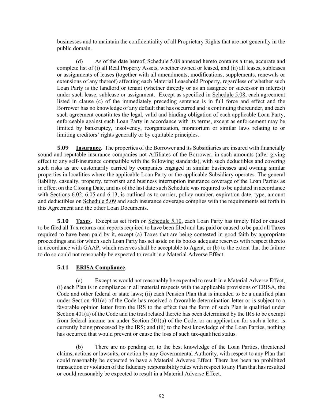 92 businesses and to maintain the confidentiality of all Proprietary Rights that are not generally in the public domain. (d) As of the date hereof, Schedule 5.08 annexed hereto contains a true, accurate and complete list of (i) all Real Property Assets, whether owned or leased, and (ii) all leases, subleases or assignments of leases (together with all amendments, modifications, supplements, renewals or extensions of any thereof) affecting each Material Leasehold Property, regardless of whether such Loan Party is the landlord or tenant (whether directly or as an assignee or successor in interest) under such lease, sublease or assignment. Except as specified in Schedule 5.08, each agreement listed in clause (c) of the immediately preceding sentence is in full force and effect and the Borrower has no knowledge of any default that has occurred and is continuing thereunder, and each such agreement constitutes the legal, valid and binding obligation of each applicable Loan Party, enforceable against such Loan Party in accordance with its terms, except as enforcement may be limited by bankruptcy, insolvency, reorganization, moratorium or similar laws relating to or limiting creditors’ rights generally or by equitable principles. 5.09 Insurance. The properties of the Borrower and its Subsidiaries are insured with financially sound and reputable insurance companies not Affiliates of the Borrower, in such amounts (after giving effect to any self-insurance compatible with the following standards), with such deductibles and covering such risks as are customarily carried by companies engaged in similar businesses and owning similar properties in localities where the applicable Loan Party or the applicable Subsidiary operates. The general liability, casualty, property, terrorism and business interruption insurance coverage of the Loan Parties as in effect on the Closing Date, and as of the last date such Schedule was required to be updated in accordance with Sections 6.02, 6.05 and 6.13, is outlined as to carrier, policy number, expiration date, type, amount and deductibles on Schedule 5.09 and such insurance coverage complies with the requirements set forth in this Agreement and the other Loan Documents. 5.10 Taxes. Except as set forth on Schedule 5.10, each Loan Party has timely filed or caused to be filed all Tax returns and reports required to have been filed and has paid or caused to be paid all Taxes required to have been paid by it, except (a) Taxes that are being contested in good faith by appropriate proceedings and for which such Loan Party has set aside on its books adequate reserves with respect thereto in accordance with GAAP, which reserves shall be acceptable to Agent, or (b) to the extent that the failure to do so could not reasonably be expected to result in a Material Adverse Effect. 5.11 ERISA Compliance. (a) Except as would not reasonably be expected to result in a Material Adverse Effect, (i) each Plan is in compliance in all material respects with the applicable provisions of ERISA, the Code and other federal or state laws; (ii) each Pension Plan that is intended to be a qualified plan under Section 401(a) of the Code has received a favorable determination letter or is subject to a favorable opinion letter from the IRS to the effect that the form of such Plan is qualified under Section 401(a) of the Code and the trust related thereto has been determined by the IRS to be exempt from federal income tax under Section 501(a) of the Code, or an application for such a letter is currently being processed by the IRS; and (iii) to the best knowledge of the Loan Parties, nothing has occurred that would prevent or cause the loss of such tax-qualified status. (b) There are no pending or, to the best knowledge of the Loan Parties, threatened claims, actions or lawsuits, or action by any Governmental Authority, with respect to any Plan that could reasonably be expected to have a Material Adverse Effect. There has been no prohibited transaction or violation of the fiduciary responsibility rules with respect to any Plan that has resulted or could reasonably be expected to result in a Material Adverse Effect.