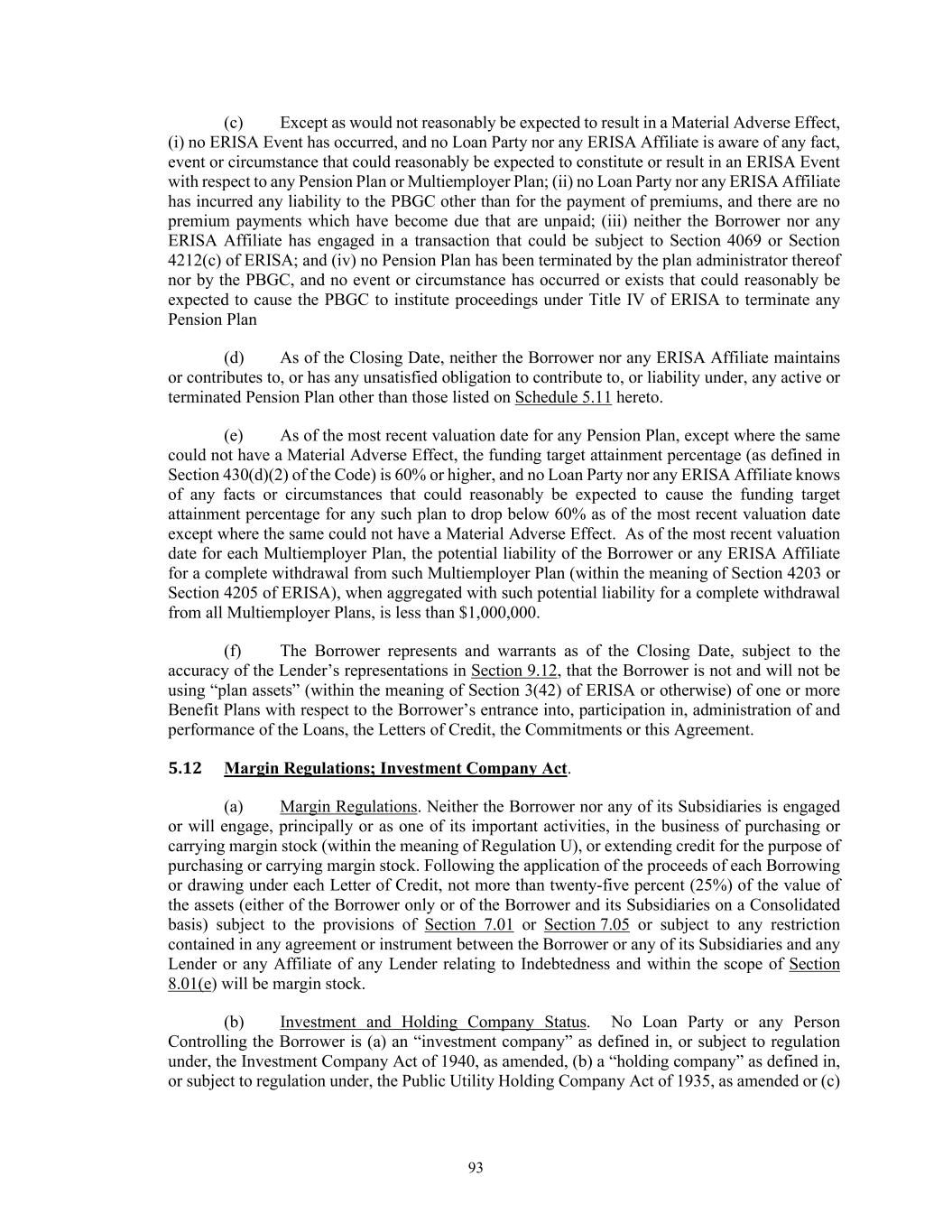 93 (c) Except as would not reasonably be expected to result in a Material Adverse Effect, (i) no ERISA Event has occurred, and no Loan Party nor any ERISA Affiliate is aware of any fact, event or circumstance that could reasonably be expected to constitute or result in an ERISA Event with respect to any Pension Plan or Multiemployer Plan; (ii) no Loan Party nor any ERISA Affiliate has incurred any liability to the PBGC other than for the payment of premiums, and there are no premium payments which have become due that are unpaid; (iii) neither the Borrower nor any ERISA Affiliate has engaged in a transaction that could be subject to Section 4069 or Section 4212(c) of ERISA; and (iv) no Pension Plan has been terminated by the plan administrator thereof nor by the PBGC, and no event or circumstance has occurred or exists that could reasonably be expected to cause the PBGC to institute proceedings under Title IV of ERISA to terminate any Pension Plan (d) As of the Closing Date, neither the Borrower nor any ERISA Affiliate maintains or contributes to, or has any unsatisfied obligation to contribute to, or liability under, any active or terminated Pension Plan other than those listed on Schedule 5.11 hereto. (e) As of the most recent valuation date for any Pension Plan, except where the same could not have a Material Adverse Effect, the funding target attainment percentage (as defined in Section 430(d)(2) of the Code) is 60% or higher, and no Loan Party nor any ERISA Affiliate knows of any facts or circumstances that could reasonably be expected to cause the funding target attainment percentage for any such plan to drop below 60% as of the most recent valuation date except where the same could not have a Material Adverse Effect. As of the most recent valuation date for each Multiemployer Plan, the potential liability of the Borrower or any ERISA Affiliate for a complete withdrawal from such Multiemployer Plan (within the meaning of Section 4203 or Section 4205 of ERISA), when aggregated with such potential liability for a complete withdrawal from all Multiemployer Plans, is less than $1,000,000. (f) The Borrower represents and warrants as of the Closing Date, subject to the accuracy of the Lender’s representations in Section 9.12, that the Borrower is not and will not be using “plan assets” (within the meaning of Section 3(42) of ERISA or otherwise) of one or more Benefit Plans with respect to the Borrower’s entrance into, participation in, administration of and performance of the Loans, the Letters of Credit, the Commitments or this Agreement. 5.12 Margin Regulations; Investment Company Act. (a) Margin Regulations. Neither the Borrower nor any of its Subsidiaries is engaged or will engage, principally or as one of its important activities, in the business of purchasing or carrying margin stock (within the meaning of Regulation U), or extending credit for the purpose of purchasing or carrying margin stock. Following the application of the proceeds of each Borrowing or drawing under each Letter of Credit, not more than twenty-five percent (25%) of the value of the assets (either of the Borrower only or of the Borrower and its Subsidiaries on a Consolidated basis) subject to the provisions of Section 7.01 or Section 7.05 or subject to any restriction contained in any agreement or instrument between the Borrower or any of its Subsidiaries and any Lender or any Affiliate of any Lender relating to Indebtedness and within the scope of Section 8.01(e) will be margin stock. (b) Investment and Holding Company Status. No Loan Party or any Person Controlling the Borrower is (a) an “investment company” as defined in, or subject to regulation under, the Investment Company Act of 1940, as amended, (b) a “holding company” as defined in, or subject to regulation under, the Public Utility Holding Company Act of 1935, as amended or (c)