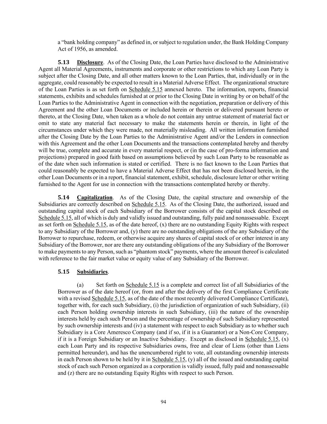 94 a “bank holding company” as defined in, or subject to regulation under, the Bank Holding Company Act of 1956, as amended. 5.13 Disclosure. As of the Closing Date, the Loan Parties have disclosed to the Administrative Agent all Material Agreements, instruments and corporate or other restrictions to which any Loan Party is subject after the Closing Date, and all other matters known to the Loan Parties, that, individually or in the aggregate, could reasonably be expected to result in a Material Adverse Effect. The organizational structure of the Loan Parties is as set forth on Schedule 5.15 annexed hereto. The information, reports, financial statements, exhibits and schedules furnished at or prior to the Closing Date in writing by or on behalf of the Loan Parties to the Administrative Agent in connection with the negotiation, preparation or delivery of this Agreement and the other Loan Documents or included herein or therein or delivered pursuant hereto or thereto, at the Closing Date, when taken as a whole do not contain any untrue statement of material fact or omit to state any material fact necessary to make the statements herein or therein, in light of the circumstances under which they were made, not materially misleading. All written information furnished after the Closing Date by the Loan Parties to the Administrative Agent and/or the Lenders in connection with this Agreement and the other Loan Documents and the transactions contemplated hereby and thereby will be true, complete and accurate in every material respect, or (in the case of pro-forma information and projections) prepared in good faith based on assumptions believed by such Loan Party to be reasonable as of the date when such information is stated or certified. There is no fact known to the Loan Parties that could reasonably be expected to have a Material Adverse Effect that has not been disclosed herein, in the other Loan Documents or in a report, financial statement, exhibit, schedule, disclosure letter or other writing furnished to the Agent for use in connection with the transactions contemplated hereby or thereby. 5.14 Capitalization. As of the Closing Date, the capital structure and ownership of the Subsidiaries are correctly described on Schedule 5.15. As of the Closing Date, the authorized, issued and outstanding capital stock of each Subsidiary of the Borrower consists of the capital stock described on Schedule 5.15, all of which is duly and validly issued and outstanding, fully paid and nonassessable. Except as set forth on Schedule 5.15, as of the date hereof, (x) there are no outstanding Equity Rights with respect to any Subsidiary of the Borrower and, (y) there are no outstanding obligations of the any Subsidiary of the Borrower to repurchase, redeem, or otherwise acquire any shares of capital stock of or other interest in any Subsidiary of the Borrower, nor are there any outstanding obligations of the any Subsidiary of the Borrower to make payments to any Person, such as “phantom stock” payments, where the amount thereof is calculated with reference to the fair market value or equity value of any Subsidiary of the Borrower. 5.15 Subsidiaries. (a) Set forth on Schedule 5.15 is a complete and correct list of all Subsidiaries of the Borrower as of the date hereof (or, from and after the delivery of the first Compliance Certificate with a revised Schedule 5.15, as of the date of the most recently delivered Compliance Certificate), together with, for each such Subsidiary, (i) the jurisdiction of organization of such Subsidiary, (ii) each Person holding ownership interests in such Subsidiary, (iii) the nature of the ownership interests held by each such Person and the percentage of ownership of such Subsidiary represented by such ownership interests and (iv) a statement with respect to each Subsidiary as to whether such Subsidiary is a Core Ameresco Company (and if so, if it is a Guarantor) or a Non-Core Company, if it is a Foreign Subsidiary or an Inactive Subsidiary. Except as disclosed in Schedule 5.15, (x) each Loan Party and its respective Subsidiaries owns, free and clear of Liens (other than Liens permitted hereunder), and has the unencumbered right to vote, all outstanding ownership interests in each Person shown to be held by it in Schedule 5.15, (y) all of the issued and outstanding capital stock of each such Person organized as a corporation is validly issued, fully paid and nonassessable and (z) there are no outstanding Equity Rights with respect to such Person.