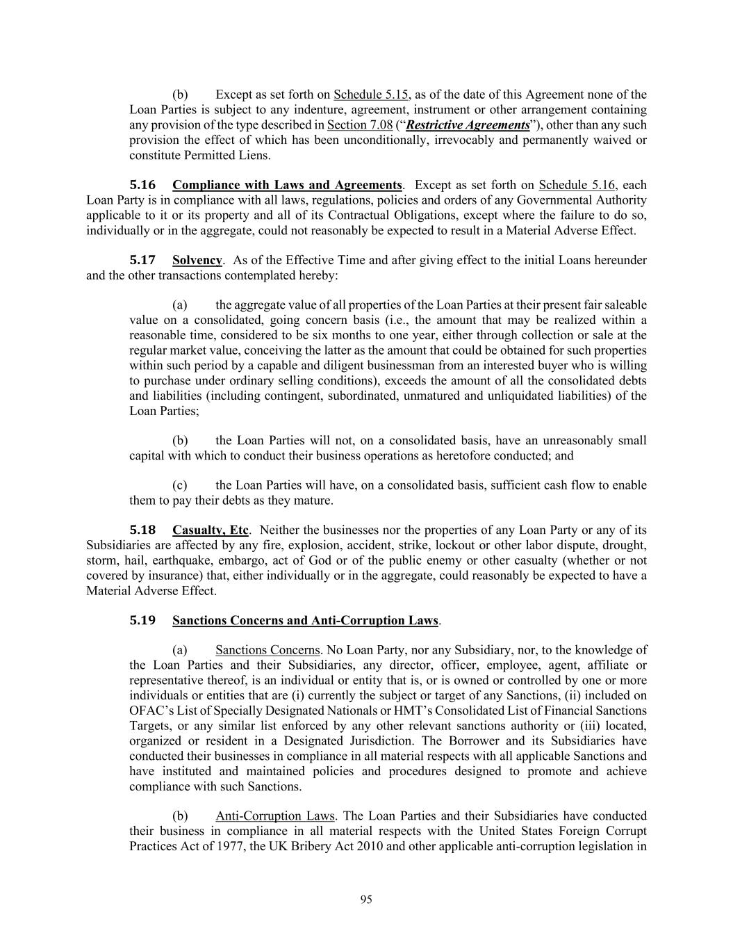 95 (b) Except as set forth on Schedule 5.15, as of the date of this Agreement none of the Loan Parties is subject to any indenture, agreement, instrument or other arrangement containing any provision of the type described in Section 7.08 (“Restrictive Agreements”), other than any such provision the effect of which has been unconditionally, irrevocably and permanently waived or constitute Permitted Liens. 5.16 Compliance with Laws and Agreements. Except as set forth on Schedule 5.16, each Loan Party is in compliance with all laws, regulations, policies and orders of any Governmental Authority applicable to it or its property and all of its Contractual Obligations, except where the failure to do so, individually or in the aggregate, could not reasonably be expected to result in a Material Adverse Effect. 5.17 Solvency. As of the Effective Time and after giving effect to the initial Loans hereunder and the other transactions contemplated hereby: (a) the aggregate value of all properties of the Loan Parties at their present fair saleable value on a consolidated, going concern basis (i.e., the amount that may be realized within a reasonable time, considered to be six months to one year, either through collection or sale at the regular market value, conceiving the latter as the amount that could be obtained for such properties within such period by a capable and diligent businessman from an interested buyer who is willing to purchase under ordinary selling conditions), exceeds the amount of all the consolidated debts and liabilities (including contingent, subordinated, unmatured and unliquidated liabilities) of the Loan Parties; (b) the Loan Parties will not, on a consolidated basis, have an unreasonably small capital with which to conduct their business operations as heretofore conducted; and (c) the Loan Parties will have, on a consolidated basis, sufficient cash flow to enable them to pay their debts as they mature. 5.18 Casualty, Etc. Neither the businesses nor the properties of any Loan Party or any of its Subsidiaries are affected by any fire, explosion, accident, strike, lockout or other labor dispute, drought, storm, hail, earthquake, embargo, act of God or of the public enemy or other casualty (whether or not covered by insurance) that, either individually or in the aggregate, could reasonably be expected to have a Material Adverse Effect. 5.19 Sanctions Concerns and Anti-Corruption Laws. (a) Sanctions Concerns. No Loan Party, nor any Subsidiary, nor, to the knowledge of the Loan Parties and their Subsidiaries, any director, officer, employee, agent, affiliate or representative thereof, is an individual or entity that is, or is owned or controlled by one or more individuals or entities that are (i) currently the subject or target of any Sanctions, (ii) included on OFAC’s List of Specially Designated Nationals or HMT’s Consolidated List of Financial Sanctions Targets, or any similar list enforced by any other relevant sanctions authority or (iii) located, organized or resident in a Designated Jurisdiction. The Borrower and its Subsidiaries have conducted their businesses in compliance in all material respects with all applicable Sanctions and have instituted and maintained policies and procedures designed to promote and achieve compliance with such Sanctions. (b) Anti-Corruption Laws. The Loan Parties and their Subsidiaries have conducted their business in compliance in all material respects with the United States Foreign Corrupt Practices Act of 1977, the UK Bribery Act 2010 and other applicable anti-corruption legislation in