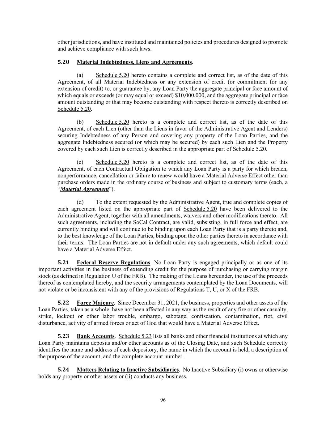 96 other jurisdictions, and have instituted and maintained policies and procedures designed to promote and achieve compliance with such laws. 5.20 Material Indebtedness, Liens and Agreements. (a) Schedule 5.20 hereto contains a complete and correct list, as of the date of this Agreement, of all Material Indebtedness or any extension of credit (or commitment for any extension of credit) to, or guarantee by, any Loan Party the aggregate principal or face amount of which equals or exceeds (or may equal or exceed) $10,000,000, and the aggregate principal or face amount outstanding or that may become outstanding with respect thereto is correctly described on Schedule 5.20. (b) Schedule 5.20 hereto is a complete and correct list, as of the date of this Agreement, of each Lien (other than the Liens in favor of the Administrative Agent and Lenders) securing Indebtedness of any Person and covering any property of the Loan Parties, and the aggregate Indebtedness secured (or which may be secured) by each such Lien and the Property covered by each such Lien is correctly described in the appropriate part of Schedule 5.20. (c) Schedule 5.20 hereto is a complete and correct list, as of the date of this Agreement, of each Contractual Obligation to which any Loan Party is a party for which breach, nonperformance, cancellation or failure to renew would have a Material Adverse Effect other than purchase orders made in the ordinary course of business and subject to customary terms (each, a “Material Agreement”). (d) To the extent requested by the Administrative Agent, true and complete copies of each agreement listed on the appropriate part of Schedule 5.20 have been delivered to the Administrative Agent, together with all amendments, waivers and other modifications thereto. All such agreements, including the SoCal Contract, are valid, subsisting, in full force and effect, are currently binding and will continue to be binding upon each Loan Party that is a party thereto and, to the best knowledge of the Loan Parties, binding upon the other parties thereto in accordance with their terms. The Loan Parties are not in default under any such agreements, which default could have a Material Adverse Effect. 5.21 Federal Reserve Regulations. No Loan Party is engaged principally or as one of its important activities in the business of extending credit for the purpose of purchasing or carrying margin stock (as defined in Regulation U of the FRB). The making of the Loans hereunder, the use of the proceeds thereof as contemplated hereby, and the security arrangements contemplated by the Loan Documents, will not violate or be inconsistent with any of the provisions of Regulations T, U, or X of the FRB. 5.22 Force Majeure. Since December 31, 2021, the business, properties and other assets of the Loan Parties, taken as a whole, have not been affected in any way as the result of any fire or other casualty, strike, lockout or other labor trouble, embargo, sabotage, confiscation, contamination, riot, civil disturbance, activity of armed forces or act of God that would have a Material Adverse Effect. 5.23 Bank Accounts. Schedule 5.23 lists all banks and other financial institutions at which any Loan Party maintains deposits and/or other accounts as of the Closing Date, and such Schedule correctly identifies the name and address of each depository, the name in which the account is held, a description of the purpose of the account, and the complete account number. 5.24 Matters Relating to Inactive Subsidiaries. No Inactive Subsidiary (i) owns or otherwise holds any property or other assets or (ii) conducts any business.