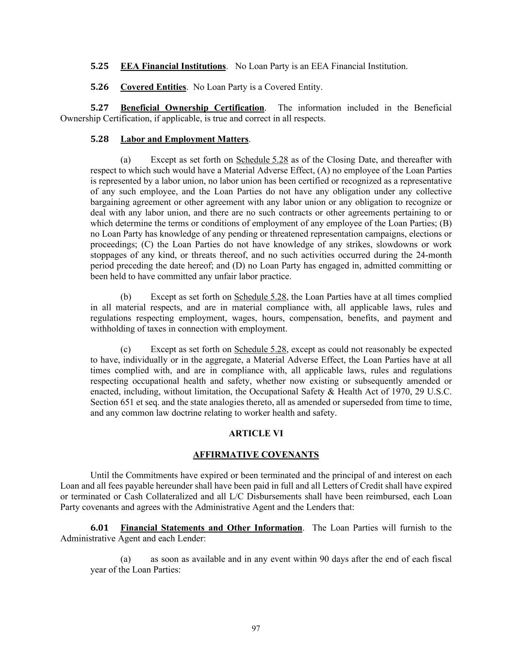 97 5.25 EEA Financial Institutions. No Loan Party is an EEA Financial Institution. 5.26 Covered Entities. No Loan Party is a Covered Entity. 5.27 Beneficial Ownership Certification. The information included in the Beneficial Ownership Certification, if applicable, is true and correct in all respects. 5.28 Labor and Employment Matters. (a) Except as set forth on Schedule 5.28 as of the Closing Date, and thereafter with respect to which such would have a Material Adverse Effect, (A) no employee of the Loan Parties is represented by a labor union, no labor union has been certified or recognized as a representative of any such employee, and the Loan Parties do not have any obligation under any collective bargaining agreement or other agreement with any labor union or any obligation to recognize or deal with any labor union, and there are no such contracts or other agreements pertaining to or which determine the terms or conditions of employment of any employee of the Loan Parties; (B) no Loan Party has knowledge of any pending or threatened representation campaigns, elections or proceedings; (C) the Loan Parties do not have knowledge of any strikes, slowdowns or work stoppages of any kind, or threats thereof, and no such activities occurred during the 24-month period preceding the date hereof; and (D) no Loan Party has engaged in, admitted committing or been held to have committed any unfair labor practice. (b) Except as set forth on Schedule 5.28, the Loan Parties have at all times complied in all material respects, and are in material compliance with, all applicable laws, rules and regulations respecting employment, wages, hours, compensation, benefits, and payment and withholding of taxes in connection with employment. (c) Except as set forth on Schedule 5.28, except as could not reasonably be expected to have, individually or in the aggregate, a Material Adverse Effect, the Loan Parties have at all times complied with, and are in compliance with, all applicable laws, rules and regulations respecting occupational health and safety, whether now existing or subsequently amended or enacted, including, without limitation, the Occupational Safety & Health Act of 1970, 29 U.S.C. Section 651 et seq. and the state analogies thereto, all as amended or superseded from time to time, and any common law doctrine relating to worker health and safety. ARTICLE VI AFFIRMATIVE COVENANTS Until the Commitments have expired or been terminated and the principal of and interest on each Loan and all fees payable hereunder shall have been paid in full and all Letters of Credit shall have expired or terminated or Cash Collateralized and all L/C Disbursements shall have been reimbursed, each Loan Party covenants and agrees with the Administrative Agent and the Lenders that: 6.01 Financial Statements and Other Information. The Loan Parties will furnish to the Administrative Agent and each Lender: (a) as soon as available and in any event within 90 days after the end of each fiscal year of the Loan Parties: