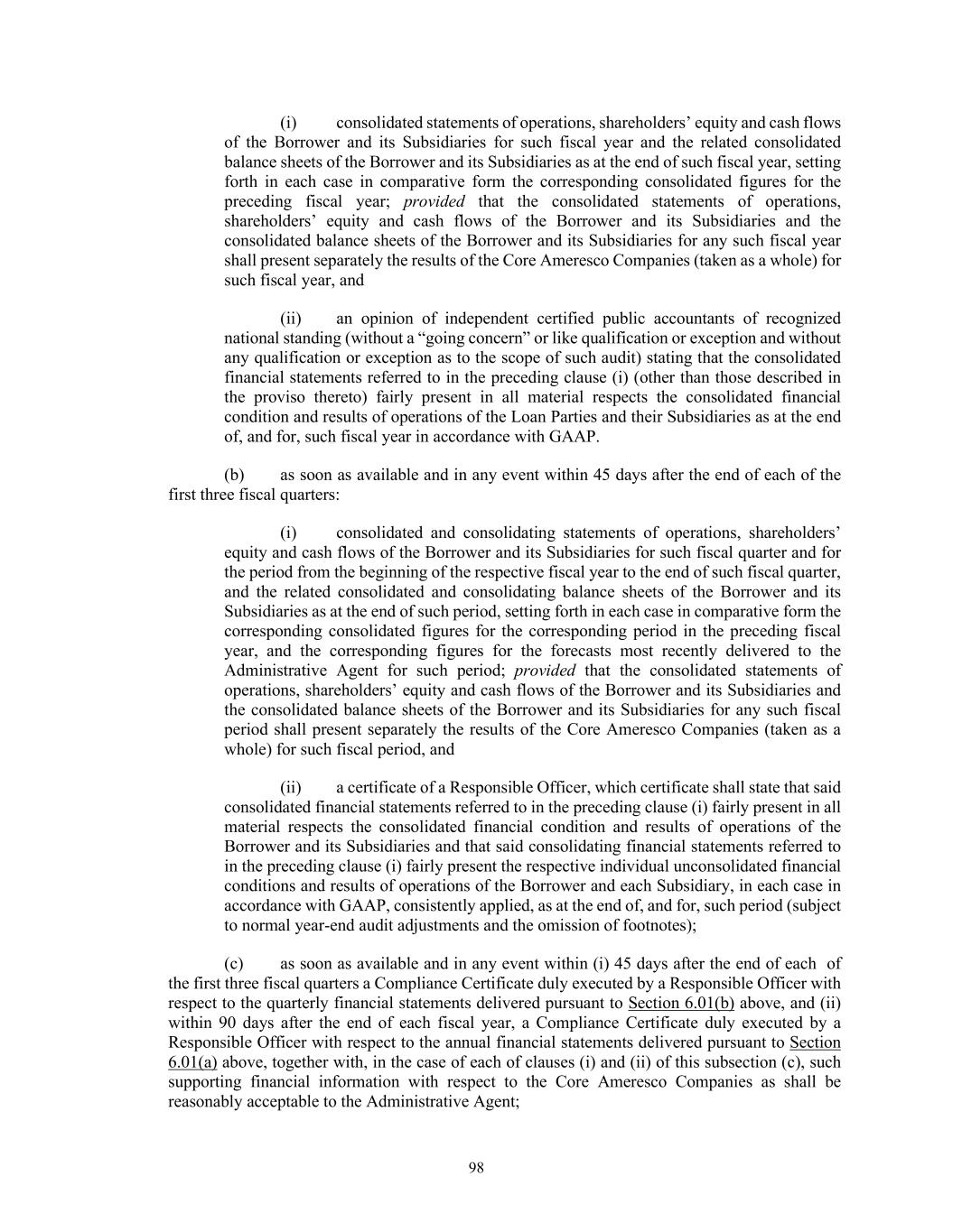 98 (i) consolidated statements of operations, shareholders’ equity and cash flows of the Borrower and its Subsidiaries for such fiscal year and the related consolidated balance sheets of the Borrower and its Subsidiaries as at the end of such fiscal year, setting forth in each case in comparative form the corresponding consolidated figures for the preceding fiscal year; provided that the consolidated statements of operations, shareholders’ equity and cash flows of the Borrower and its Subsidiaries and the consolidated balance sheets of the Borrower and its Subsidiaries for any such fiscal year shall present separately the results of the Core Ameresco Companies (taken as a whole) for such fiscal year, and (ii) an opinion of independent certified public accountants of recognized national standing (without a “going concern” or like qualification or exception and without any qualification or exception as to the scope of such audit) stating that the consolidated financial statements referred to in the preceding clause (i) (other than those described in the proviso thereto) fairly present in all material respects the consolidated financial condition and results of operations of the Loan Parties and their Subsidiaries as at the end of, and for, such fiscal year in accordance with GAAP. (b) as soon as available and in any event within 45 days after the end of each of the first three fiscal quarters: (i) consolidated and consolidating statements of operations, shareholders’ equity and cash flows of the Borrower and its Subsidiaries for such fiscal quarter and for the period from the beginning of the respective fiscal year to the end of such fiscal quarter, and the related consolidated and consolidating balance sheets of the Borrower and its Subsidiaries as at the end of such period, setting forth in each case in comparative form the corresponding consolidated figures for the corresponding period in the preceding fiscal year, and the corresponding figures for the forecasts most recently delivered to the Administrative Agent for such period; provided that the consolidated statements of operations, shareholders’ equity and cash flows of the Borrower and its Subsidiaries and the consolidated balance sheets of the Borrower and its Subsidiaries for any such fiscal period shall present separately the results of the Core Ameresco Companies (taken as a whole) for such fiscal period, and (ii) a certificate of a Responsible Officer, which certificate shall state that said consolidated financial statements referred to in the preceding clause (i) fairly present in all material respects the consolidated financial condition and results of operations of the Borrower and its Subsidiaries and that said consolidating financial statements referred to in the preceding clause (i) fairly present the respective individual unconsolidated financial conditions and results of operations of the Borrower and each Subsidiary, in each case in accordance with GAAP, consistently applied, as at the end of, and for, such period (subject to normal year-end audit adjustments and the omission of footnotes); (c) as soon as available and in any event within (i) 45 days after the end of each of the first three fiscal quarters a Compliance Certificate duly executed by a Responsible Officer with respect to the quarterly financial statements delivered pursuant to Section 6.01(b) above, and (ii) within 90 days after the end of each fiscal year, a Compliance Certificate duly executed by a Responsible Officer with respect to the annual financial statements delivered pursuant to Section 6.01(a) above, together with, in the case of each of clauses (i) and (ii) of this subsection (c), such supporting financial information with respect to the Core Ameresco Companies as shall be reasonably acceptable to the Administrative Agent;