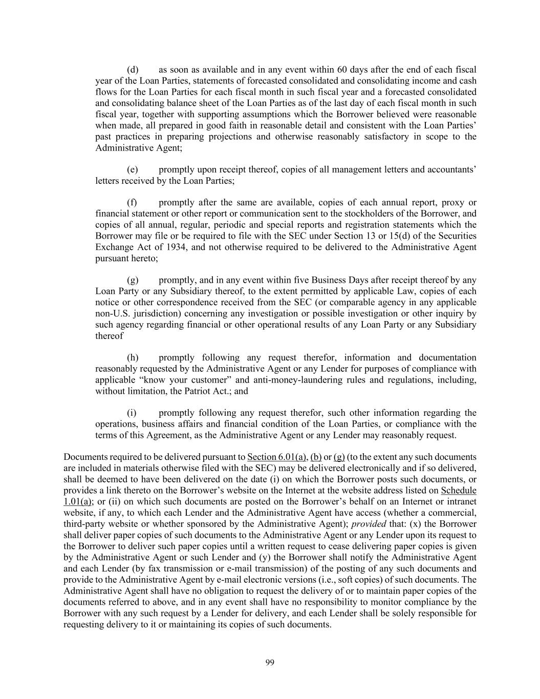 99 (d) as soon as available and in any event within 60 days after the end of each fiscal year of the Loan Parties, statements of forecasted consolidated and consolidating income and cash flows for the Loan Parties for each fiscal month in such fiscal year and a forecasted consolidated and consolidating balance sheet of the Loan Parties as of the last day of each fiscal month in such fiscal year, together with supporting assumptions which the Borrower believed were reasonable when made, all prepared in good faith in reasonable detail and consistent with the Loan Parties’ past practices in preparing projections and otherwise reasonably satisfactory in scope to the Administrative Agent; (e) promptly upon receipt thereof, copies of all management letters and accountants’ letters received by the Loan Parties; (f) promptly after the same are available, copies of each annual report, proxy or financial statement or other report or communication sent to the stockholders of the Borrower, and copies of all annual, regular, periodic and special reports and registration statements which the Borrower may file or be required to file with the SEC under Section 13 or 15(d) of the Securities Exchange Act of 1934, and not otherwise required to be delivered to the Administrative Agent pursuant hereto; (g) promptly, and in any event within five Business Days after receipt thereof by any Loan Party or any Subsidiary thereof, to the extent permitted by applicable Law, copies of each notice or other correspondence received from the SEC (or comparable agency in any applicable non-U.S. jurisdiction) concerning any investigation or possible investigation or other inquiry by such agency regarding financial or other operational results of any Loan Party or any Subsidiary thereof (h) promptly following any request therefor, information and documentation reasonably requested by the Administrative Agent or any Lender for purposes of compliance with applicable “know your customer” and anti-money-laundering rules and regulations, including, without limitation, the Patriot Act.; and (i) promptly following any request therefor, such other information regarding the operations, business affairs and financial condition of the Loan Parties, or compliance with the terms of this Agreement, as the Administrative Agent or any Lender may reasonably request. Documents required to be delivered pursuant to Section 6.01(a), (b) or (g) (to the extent any such documents are included in materials otherwise filed with the SEC) may be delivered electronically and if so delivered, shall be deemed to have been delivered on the date (i) on which the Borrower posts such documents, or provides a link thereto on the Borrower’s website on the Internet at the website address listed on Schedule 1.01(a); or (ii) on which such documents are posted on the Borrower’s behalf on an Internet or intranet website, if any, to which each Lender and the Administrative Agent have access (whether a commercial, third-party website or whether sponsored by the Administrative Agent); provided that: (x) the Borrower shall deliver paper copies of such documents to the Administrative Agent or any Lender upon its request to the Borrower to deliver such paper copies until a written request to cease delivering paper copies is given by the Administrative Agent or such Lender and (y) the Borrower shall notify the Administrative Agent and each Lender (by fax transmission or e-mail transmission) of the posting of any such documents and provide to the Administrative Agent by e-mail electronic versions (i.e., soft copies) of such documents. The Administrative Agent shall have no obligation to request the delivery of or to maintain paper copies of the documents referred to above, and in any event shall have no responsibility to monitor compliance by the Borrower with any such request by a Lender for delivery, and each Lender shall be solely responsible for requesting delivery to it or maintaining its copies of such documents.