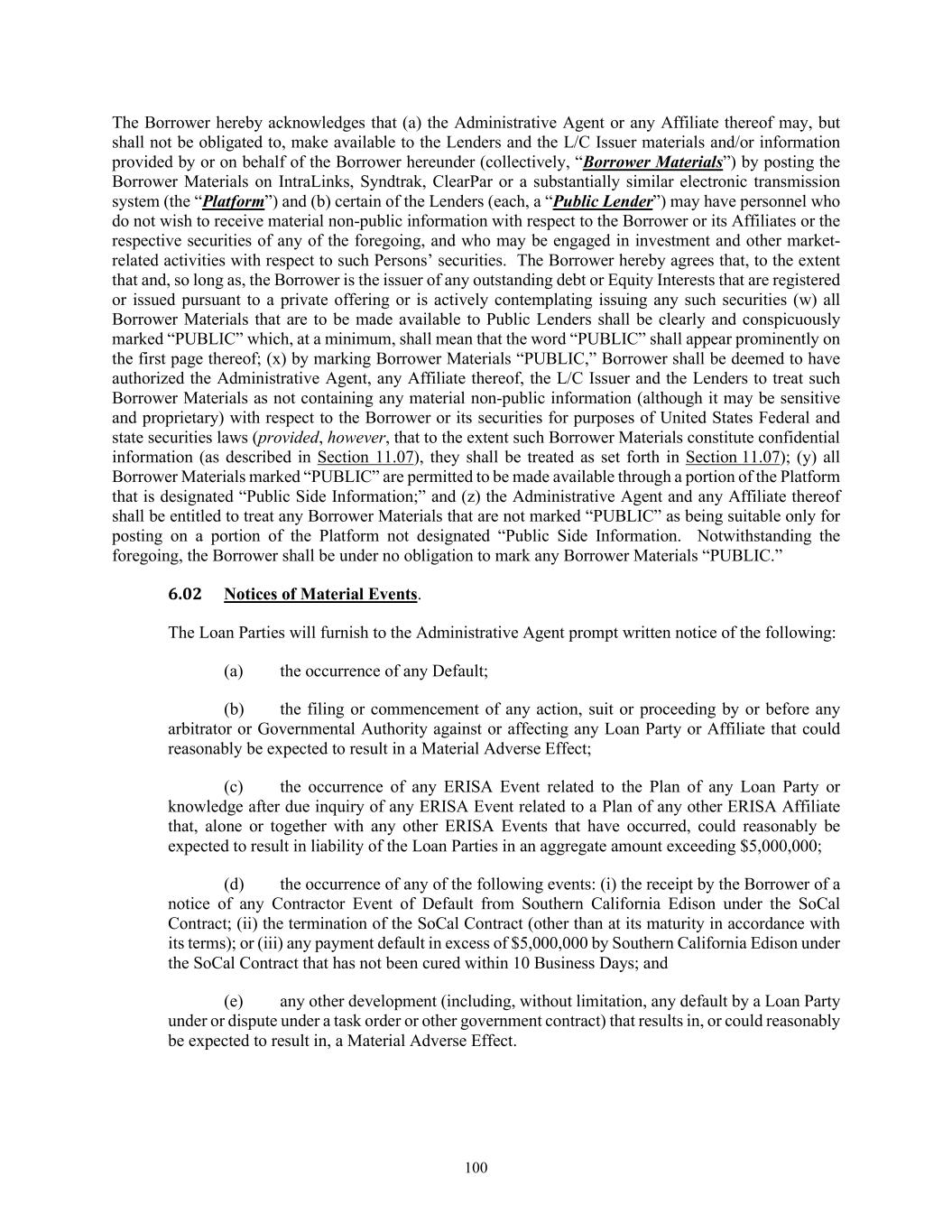 100 The Borrower hereby acknowledges that (a) the Administrative Agent or any Affiliate thereof may, but shall not be obligated to, make available to the Lenders and the L/C Issuer materials and/or information provided by or on behalf of the Borrower hereunder (collectively, “Borrower Materials”) by posting the Borrower Materials on IntraLinks, Syndtrak, ClearPar or a substantially similar electronic transmission system (the “Platform”) and (b) certain of the Lenders (each, a “Public Lender”) may have personnel who do not wish to receive material non-public information with respect to the Borrower or its Affiliates or the respective securities of any of the foregoing, and who may be engaged in investment and other market- related activities with respect to such Persons’ securities. The Borrower hereby agrees that, to the extent that and, so long as, the Borrower is the issuer of any outstanding debt or Equity Interests that are registered or issued pursuant to a private offering or is actively contemplating issuing any such securities (w) all Borrower Materials that are to be made available to Public Lenders shall be clearly and conspicuously marked “PUBLIC” which, at a minimum, shall mean that the word “PUBLIC” shall appear prominently on the first page thereof; (x) by marking Borrower Materials “PUBLIC,” Borrower shall be deemed to have authorized the Administrative Agent, any Affiliate thereof, the L/C Issuer and the Lenders to treat such Borrower Materials as not containing any material non-public information (although it may be sensitive and proprietary) with respect to the Borrower or its securities for purposes of United States Federal and state securities laws (provided, however, that to the extent such Borrower Materials constitute confidential information (as described in Section 11.07), they shall be treated as set forth in Section 11.07); (y) all Borrower Materials marked “PUBLIC” are permitted to be made available through a portion of the Platform that is designated “Public Side Information;” and (z) the Administrative Agent and any Affiliate thereof shall be entitled to treat any Borrower Materials that are not marked “PUBLIC” as being suitable only for posting on a portion of the Platform not designated “Public Side Information. Notwithstanding the foregoing, the Borrower shall be under no obligation to mark any Borrower Materials “PUBLIC.” 6.02 Notices of Material Events. The Loan Parties will furnish to the Administrative Agent prompt written notice of the following: (a) the occurrence of any Default; (b) the filing or commencement of any action, suit or proceeding by or before any arbitrator or Governmental Authority against or affecting any Loan Party or Affiliate that could reasonably be expected to result in a Material Adverse Effect; (c) the occurrence of any ERISA Event related to the Plan of any Loan Party or knowledge after due inquiry of any ERISA Event related to a Plan of any other ERISA Affiliate that, alone or together with any other ERISA Events that have occurred, could reasonably be expected to result in liability of the Loan Parties in an aggregate amount exceeding $5,000,000; (d) the occurrence of any of the following events: (i) the receipt by the Borrower of a notice of any Contractor Event of Default from Southern California Edison under the SoCal Contract; (ii) the termination of the SoCal Contract (other than at its maturity in accordance with its terms); or (iii) any payment default in excess of $5,000,000 by Southern California Edison under the SoCal Contract that has not been cured within 10 Business Days; and (e) any other development (including, without limitation, any default by a Loan Party under or dispute under a task order or other government contract) that results in, or could reasonably be expected to result in, a Material Adverse Effect.