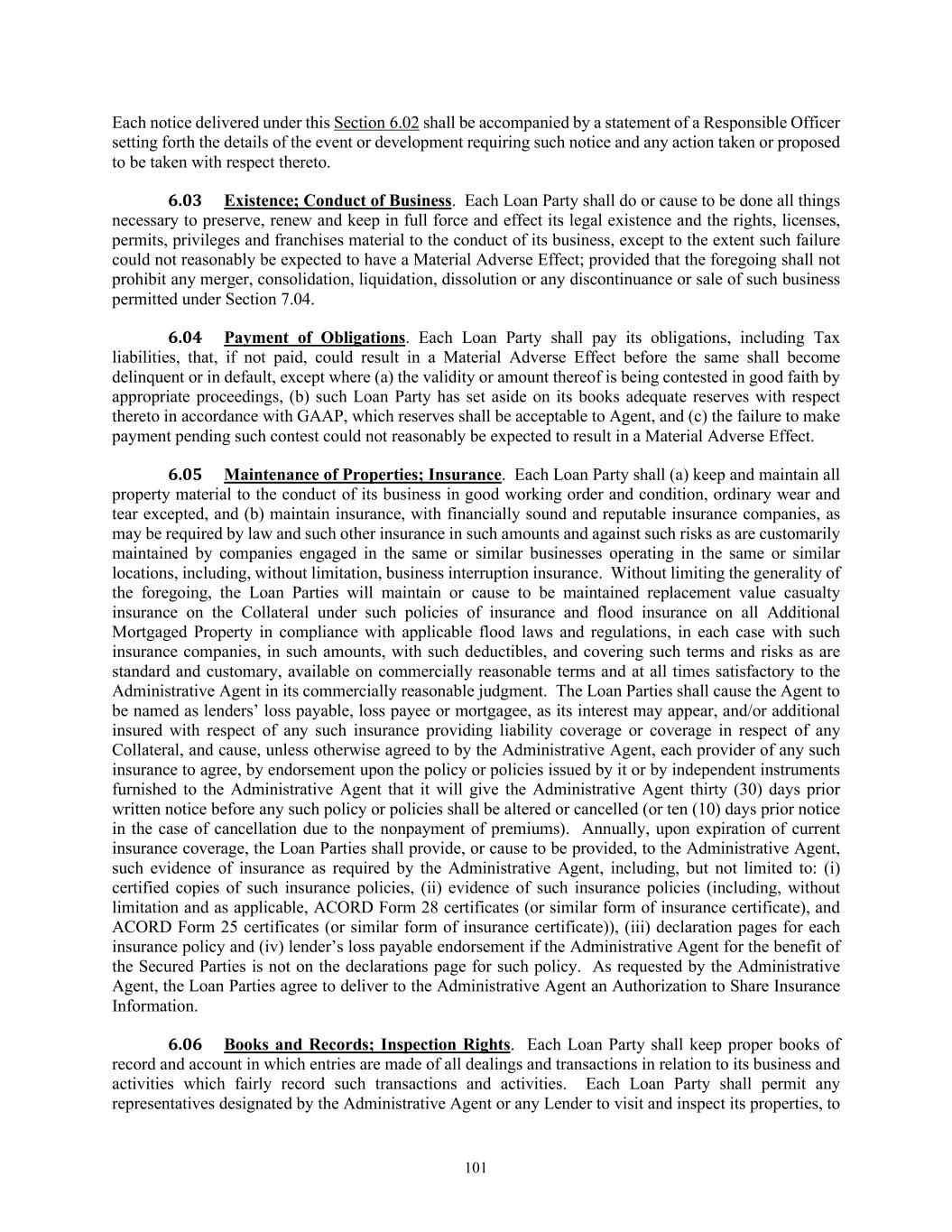 101 Each notice delivered under this Section 6.02 shall be accompanied by a statement of a Responsible Officer setting forth the details of the event or development requiring such notice and any action taken or proposed to be taken with respect thereto. 6.03 Existence; Conduct of Business. Each Loan Party shall do or cause to be done all things necessary to preserve, renew and keep in full force and effect its legal existence and the rights, licenses, permits, privileges and franchises material to the conduct of its business, except to the extent such failure could not reasonably be expected to have a Material Adverse Effect; provided that the foregoing shall not prohibit any merger, consolidation, liquidation, dissolution or any discontinuance or sale of such business permitted under Section 7.04. 6.04 Payment of Obligations. Each Loan Party shall pay its obligations, including Tax liabilities, that, if not paid, could result in a Material Adverse Effect before the same shall become delinquent or in default, except where (a) the validity or amount thereof is being contested in good faith by appropriate proceedings, (b) such Loan Party has set aside on its books adequate reserves with respect thereto in accordance with GAAP, which reserves shall be acceptable to Agent, and (c) the failure to make payment pending such contest could not reasonably be expected to result in a Material Adverse Effect. 6.05 Maintenance of Properties; Insurance. Each Loan Party shall (a) keep and maintain all property material to the conduct of its business in good working order and condition, ordinary wear and tear excepted, and (b) maintain insurance, with financially sound and reputable insurance companies, as may be required by law and such other insurance in such amounts and against such risks as are customarily maintained by companies engaged in the same or similar businesses operating in the same or similar locations, including, without limitation, business interruption insurance. Without limiting the generality of the foregoing, the Loan Parties will maintain or cause to be maintained replacement value casualty insurance on the Collateral under such policies of insurance and flood insurance on all Additional Mortgaged Property in compliance with applicable flood laws and regulations, in each case with such insurance companies, in such amounts, with such deductibles, and covering such terms and risks as are standard and customary, available on commercially reasonable terms and at all times satisfactory to the Administrative Agent in its commercially reasonable judgment. The Loan Parties shall cause the Agent to be named as lenders’ loss payable, loss payee or mortgagee, as its interest may appear, and/or additional insured with respect of any such insurance providing liability coverage or coverage in respect of any Collateral, and cause, unless otherwise agreed to by the Administrative Agent, each provider of any such insurance to agree, by endorsement upon the policy or policies issued by it or by independent instruments furnished to the Administrative Agent that it will give the Administrative Agent thirty (30) days prior written notice before any such policy or policies shall be altered or cancelled (or ten (10) days prior notice in the case of cancellation due to the nonpayment of premiums). Annually, upon expiration of current insurance coverage, the Loan Parties shall provide, or cause to be provided, to the Administrative Agent, such evidence of insurance as required by the Administrative Agent, including, but not limited to: (i) certified copies of such insurance policies, (ii) evidence of such insurance policies (including, without limitation and as applicable, ACORD Form 28 certificates (or similar form of insurance certificate), and ACORD Form 25 certificates (or similar form of insurance certificate)), (iii) declaration pages for each insurance policy and (iv) lender’s loss payable endorsement if the Administrative Agent for the benefit of the Secured Parties is not on the declarations page for such policy. As requested by the Administrative Agent, the Loan Parties agree to deliver to the Administrative Agent an Authorization to Share Insurance Information. 6.06 Books and Records; Inspection Rights. Each Loan Party shall keep proper books of record and account in which entries are made of all dealings and transactions in relation to its business and activities which fairly record such transactions and activities. Each Loan Party shall permit any representatives designated by the Administrative Agent or any Lender to visit and inspect its properties, to