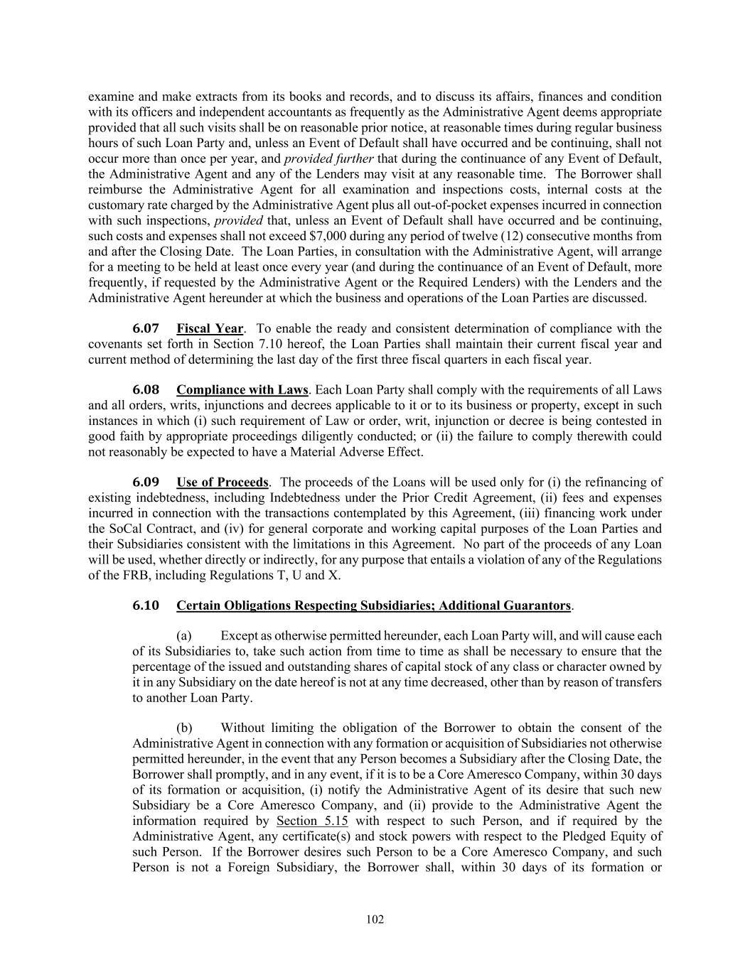 102 examine and make extracts from its books and records, and to discuss its affairs, finances and condition with its officers and independent accountants as frequently as the Administrative Agent deems appropriate provided that all such visits shall be on reasonable prior notice, at reasonable times during regular business hours of such Loan Party and, unless an Event of Default shall have occurred and be continuing, shall not occur more than once per year, and provided further that during the continuance of any Event of Default, the Administrative Agent and any of the Lenders may visit at any reasonable time. The Borrower shall reimburse the Administrative Agent for all examination and inspections costs, internal costs at the customary rate charged by the Administrative Agent plus all out-of-pocket expenses incurred in connection with such inspections, provided that, unless an Event of Default shall have occurred and be continuing, such costs and expenses shall not exceed $7,000 during any period of twelve (12) consecutive months from and after the Closing Date. The Loan Parties, in consultation with the Administrative Agent, will arrange for a meeting to be held at least once every year (and during the continuance of an Event of Default, more frequently, if requested by the Administrative Agent or the Required Lenders) with the Lenders and the Administrative Agent hereunder at which the business and operations of the Loan Parties are discussed. 6.07 Fiscal Year. To enable the ready and consistent determination of compliance with the covenants set forth in Section 7.10 hereof, the Loan Parties shall maintain their current fiscal year and current method of determining the last day of the first three fiscal quarters in each fiscal year. 6.08 Compliance with Laws. Each Loan Party shall comply with the requirements of all Laws and all orders, writs, injunctions and decrees applicable to it or to its business or property, except in such instances in which (i) such requirement of Law or order, writ, injunction or decree is being contested in good faith by appropriate proceedings diligently conducted; or (ii) the failure to comply therewith could not reasonably be expected to have a Material Adverse Effect. 6.09 Use of Proceeds. The proceeds of the Loans will be used only for (i) the refinancing of existing indebtedness, including Indebtedness under the Prior Credit Agreement, (ii) fees and expenses incurred in connection with the transactions contemplated by this Agreement, (iii) financing work under the SoCal Contract, and (iv) for general corporate and working capital purposes of the Loan Parties and their Subsidiaries consistent with the limitations in this Agreement. No part of the proceeds of any Loan will be used, whether directly or indirectly, for any purpose that entails a violation of any of the Regulations of the FRB, including Regulations T, U and X. 6.10 Certain Obligations Respecting Subsidiaries; Additional Guarantors. (a) Except as otherwise permitted hereunder, each Loan Party will, and will cause each of its Subsidiaries to, take such action from time to time as shall be necessary to ensure that the percentage of the issued and outstanding shares of capital stock of any class or character owned by it in any Subsidiary on the date hereof is not at any time decreased, other than by reason of transfers to another Loan Party. (b) Without limiting the obligation of the Borrower to obtain the consent of the Administrative Agent in connection with any formation or acquisition of Subsidiaries not otherwise permitted hereunder, in the event that any Person becomes a Subsidiary after the Closing Date, the Borrower shall promptly, and in any event, if it is to be a Core Ameresco Company, within 30 days of its formation or acquisition, (i) notify the Administrative Agent of its desire that such new Subsidiary be a Core Ameresco Company, and (ii) provide to the Administrative Agent the information required by Section 5.15 with respect to such Person, and if required by the Administrative Agent, any certificate(s) and stock powers with respect to the Pledged Equity of such Person. If the Borrower desires such Person to be a Core Ameresco Company, and such Person is not a Foreign Subsidiary, the Borrower shall, within 30 days of its formation or