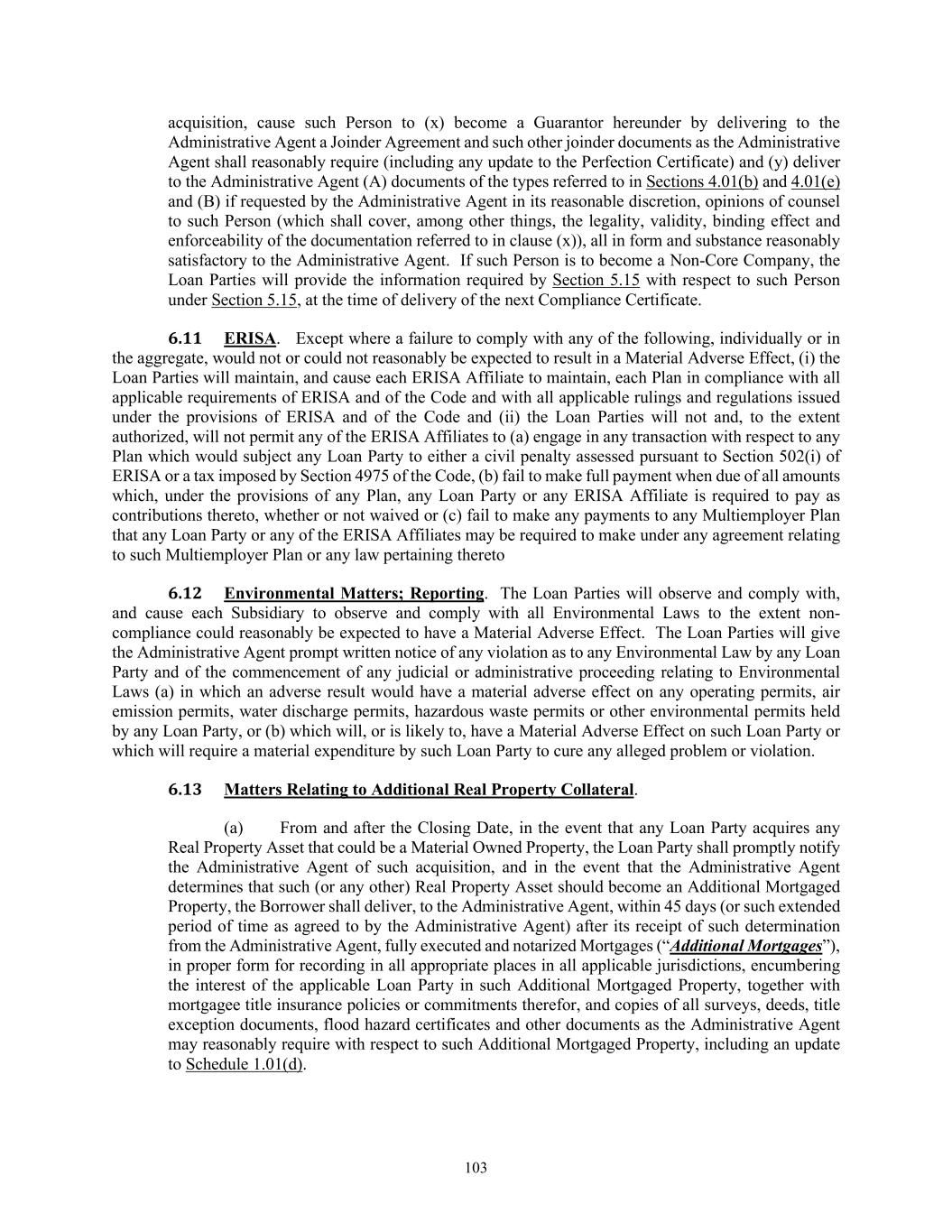 103 acquisition, cause such Person to (x) become a Guarantor hereunder by delivering to the Administrative Agent a Joinder Agreement and such other joinder documents as the Administrative Agent shall reasonably require (including any update to the Perfection Certificate) and (y) deliver to the Administrative Agent (A) documents of the types referred to in Sections 4.01(b) and 4.01(e) and (B) if requested by the Administrative Agent in its reasonable discretion, opinions of counsel to such Person (which shall cover, among other things, the legality, validity, binding effect and enforceability of the documentation referred to in clause (x)), all in form and substance reasonably satisfactory to the Administrative Agent. If such Person is to become a Non-Core Company, the Loan Parties will provide the information required by Section 5.15 with respect to such Person under Section 5.15, at the time of delivery of the next Compliance Certificate. 6.11 ERISA. Except where a failure to comply with any of the following, individually or in the aggregate, would not or could not reasonably be expected to result in a Material Adverse Effect, (i) the Loan Parties will maintain, and cause each ERISA Affiliate to maintain, each Plan in compliance with all applicable requirements of ERISA and of the Code and with all applicable rulings and regulations issued under the provisions of ERISA and of the Code and (ii) the Loan Parties will not and, to the extent authorized, will not permit any of the ERISA Affiliates to (a) engage in any transaction with respect to any Plan which would subject any Loan Party to either a civil penalty assessed pursuant to Section 502(i) of ERISA or a tax imposed by Section 4975 of the Code, (b) fail to make full payment when due of all amounts which, under the provisions of any Plan, any Loan Party or any ERISA Affiliate is required to pay as contributions thereto, whether or not waived or (c) fail to make any payments to any Multiemployer Plan that any Loan Party or any of the ERISA Affiliates may be required to make under any agreement relating to such Multiemployer Plan or any law pertaining thereto 6.12 Environmental Matters; Reporting. The Loan Parties will observe and comply with, and cause each Subsidiary to observe and comply with all Environmental Laws to the extent non- compliance could reasonably be expected to have a Material Adverse Effect. The Loan Parties will give the Administrative Agent prompt written notice of any violation as to any Environmental Law by any Loan Party and of the commencement of any judicial or administrative proceeding relating to Environmental Laws (a) in which an adverse result would have a material adverse effect on any operating permits, air emission permits, water discharge permits, hazardous waste permits or other environmental permits held by any Loan Party, or (b) which will, or is likely to, have a Material Adverse Effect on such Loan Party or which will require a material expenditure by such Loan Party to cure any alleged problem or violation. 6.13 Matters Relating to Additional Real Property Collateral. (a) From and after the Closing Date, in the event that any Loan Party acquires any Real Property Asset that could be a Material Owned Property, the Loan Party shall promptly notify the Administrative Agent of such acquisition, and in the event that the Administrative Agent determines that such (or any other) Real Property Asset should become an Additional Mortgaged Property, the Borrower shall deliver, to the Administrative Agent, within 45 days (or such extended period of time as agreed to by the Administrative Agent) after its receipt of such determination from the Administrative Agent, fully executed and notarized Mortgages (“Additional Mortgages”), in proper form for recording in all appropriate places in all applicable jurisdictions, encumbering the interest of the applicable Loan Party in such Additional Mortgaged Property, together with mortgagee title insurance policies or commitments therefor, and copies of all surveys, deeds, title exception documents, flood hazard certificates and other documents as the Administrative Agent may reasonably require with respect to such Additional Mortgaged Property, including an update to Schedule 1.01(d).