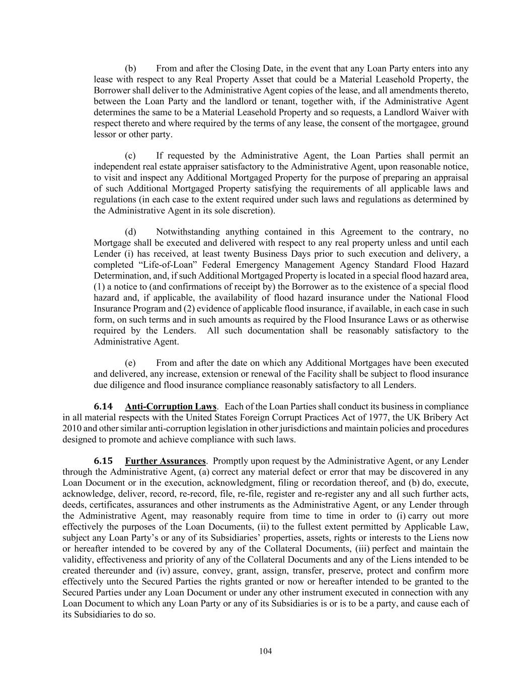 104 (b) From and after the Closing Date, in the event that any Loan Party enters into any lease with respect to any Real Property Asset that could be a Material Leasehold Property, the Borrower shall deliver to the Administrative Agent copies of the lease, and all amendments thereto, between the Loan Party and the landlord or tenant, together with, if the Administrative Agent determines the same to be a Material Leasehold Property and so requests, a Landlord Waiver with respect thereto and where required by the terms of any lease, the consent of the mortgagee, ground lessor or other party. (c) If requested by the Administrative Agent, the Loan Parties shall permit an independent real estate appraiser satisfactory to the Administrative Agent, upon reasonable notice, to visit and inspect any Additional Mortgaged Property for the purpose of preparing an appraisal of such Additional Mortgaged Property satisfying the requirements of all applicable laws and regulations (in each case to the extent required under such laws and regulations as determined by the Administrative Agent in its sole discretion). (d) Notwithstanding anything contained in this Agreement to the contrary, no Mortgage shall be executed and delivered with respect to any real property unless and until each Lender (i) has received, at least twenty Business Days prior to such execution and delivery, a completed “Life-of-Loan” Federal Emergency Management Agency Standard Flood Hazard Determination, and, if such Additional Mortgaged Property is located in a special flood hazard area, (1) a notice to (and confirmations of receipt by) the Borrower as to the existence of a special flood hazard and, if applicable, the availability of flood hazard insurance under the National Flood Insurance Program and (2) evidence of applicable flood insurance, if available, in each case in such form, on such terms and in such amounts as required by the Flood Insurance Laws or as otherwise required by the Lenders. All such documentation shall be reasonably satisfactory to the Administrative Agent. (e) From and after the date on which any Additional Mortgages have been executed and delivered, any increase, extension or renewal of the Facility shall be subject to flood insurance due diligence and flood insurance compliance reasonably satisfactory to all Lenders. 6.14 Anti-Corruption Laws. Each of the Loan Parties shall conduct its business in compliance in all material respects with the United States Foreign Corrupt Practices Act of 1977, the UK Bribery Act 2010 and other similar anti-corruption legislation in other jurisdictions and maintain policies and procedures designed to promote and achieve compliance with such laws. 6.15 Further Assurances. Promptly upon request by the Administrative Agent, or any Lender through the Administrative Agent, (a) correct any material defect or error that may be discovered in any Loan Document or in the execution, acknowledgment, filing or recordation thereof, and (b) do, execute, acknowledge, deliver, record, re-record, file, re-file, register and re-register any and all such further acts, deeds, certificates, assurances and other instruments as the Administrative Agent, or any Lender through the Administrative Agent, may reasonably require from time to time in order to (i) carry out more effectively the purposes of the Loan Documents, (ii) to the fullest extent permitted by Applicable Law, subject any Loan Party’s or any of its Subsidiaries’ properties, assets, rights or interests to the Liens now or hereafter intended to be covered by any of the Collateral Documents, (iii) perfect and maintain the validity, effectiveness and priority of any of the Collateral Documents and any of the Liens intended to be created thereunder and (iv) assure, convey, grant, assign, transfer, preserve, protect and confirm more effectively unto the Secured Parties the rights granted or now or hereafter intended to be granted to the Secured Parties under any Loan Document or under any other instrument executed in connection with any Loan Document to which any Loan Party or any of its Subsidiaries is or is to be a party, and cause each of its Subsidiaries to do so.