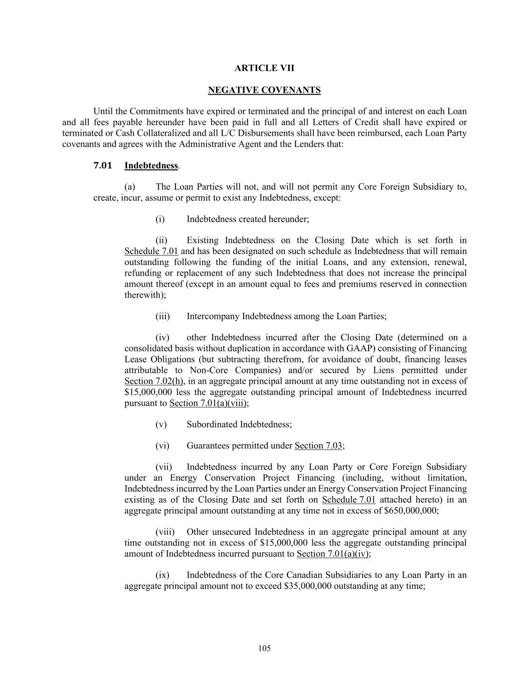 105 ARTICLE VII NEGATIVE COVENANTS Until the Commitments have expired or terminated and the principal of and interest on each Loan and all fees payable hereunder have been paid in full and all Letters of Credit shall have expired or terminated or Cash Collateralized and all L/C Disbursements shall have been reimbursed, each Loan Party covenants and agrees with the Administrative Agent and the Lenders that: 7.01 Indebtedness. (a) The Loan Parties will not, and will not permit any Core Foreign Subsidiary to, create, incur, assume or permit to exist any Indebtedness, except: (i) Indebtedness created hereunder; (ii) Existing Indebtedness on the Closing Date which is set forth in Schedule 7.01 and has been designated on such schedule as Indebtedness that will remain outstanding following the funding of the initial Loans, and any extension, renewal, refunding or replacement of any such Indebtedness that does not increase the principal amount thereof (except in an amount equal to fees and premiums reserved in connection therewith); (iii) Intercompany Indebtedness among the Loan Parties; (iv) other Indebtedness incurred after the Closing Date (determined on a consolidated basis without duplication in accordance with GAAP) consisting of Financing Lease Obligations (but subtracting therefrom, for avoidance of doubt, financing leases attributable to Non-Core Companies) and/or secured by Liens permitted under Section 7.02(h), in an aggregate principal amount at any time outstanding not in excess of $15,000,000 less the aggregate outstanding principal amount of Indebtedness incurred pursuant to Section 7.01(a)(viii); (v) Subordinated Indebtedness; (vi) Guarantees permitted under Section 7.03; (vii) Indebtedness incurred by any Loan Party or Core Foreign Subsidiary under an Energy Conservation Project Financing (including, without limitation, Indebtedness incurred by the Loan Parties under an Energy Conservation Project Financing existing as of the Closing Date and set forth on Schedule 7.01 attached hereto) in an aggregate principal amount outstanding at any time not in excess of $650,000,000; (viii) Other unsecured Indebtedness in an aggregate principal amount at any time outstanding not in excess of $15,000,000 less the aggregate outstanding principal amount of Indebtedness incurred pursuant to Section 7.01(a)(iv); (ix) Indebtedness of the Core Canadian Subsidiaries to any Loan Party in an aggregate principal amount not to exceed $35,000,000 outstanding at any time;