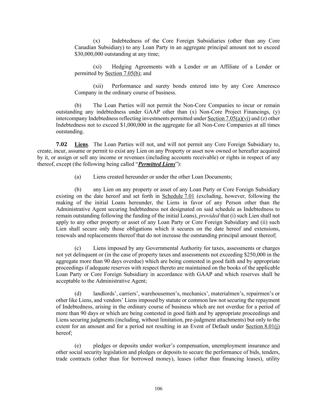 106 (x) Indebtedness of the Core Foreign Subsidiaries (other than any Core Canadian Subsidiary) to any Loan Party in an aggregate principal amount not to exceed $30,000,000 outstanding at any time; (xi) Hedging Agreements with a Lender or an Affiliate of a Lender or permitted by Section 7.05(b); and (xii) Performance and surety bonds entered into by any Core Ameresco Company in the ordinary course of business. (b) The Loan Parties will not permit the Non-Core Companies to incur or remain outstanding any indebtedness under GAAP other than (x) Non-Core Project Financings, (y) intercompany Indebtedness reflecting investments permitted under Section 7.05(a)(vi) and (z) other Indebtedness not to exceed $1,000,000 in the aggregate for all Non-Core Companies at all times outstanding. 7.02 Liens. The Loan Parties will not, and will not permit any Core Foreign Subsidiary to, create, incur, assume or permit to exist any Lien on any Property or asset now owned or hereafter acquired by it, or assign or sell any income or revenues (including accounts receivable) or rights in respect of any thereof, except (the following being called “Permitted Liens”): (a) Liens created hereunder or under the other Loan Documents; (b) any Lien on any property or asset of any Loan Party or Core Foreign Subsidiary existing on the date hereof and set forth in Schedule 7.01 (excluding, however, following the making of the initial Loans hereunder, the Liens in favor of any Person other than the Administrative Agent securing Indebtedness not designated on said schedule as Indebtedness to remain outstanding following the funding of the initial Loans), provided that (i) such Lien shall not apply to any other property or asset of any Loan Party or Core Foreign Subsidiary and (ii) such Lien shall secure only those obligations which it secures on the date hereof and extensions, renewals and replacements thereof that do not increase the outstanding principal amount thereof; (c) Liens imposed by any Governmental Authority for taxes, assessments or charges not yet delinquent or (in the case of property taxes and assessments not exceeding $250,000 in the aggregate more than 90 days overdue) which are being contested in good faith and by appropriate proceedings if adequate reserves with respect thereto are maintained on the books of the applicable Loan Party or Core Foreign Subsidiary in accordance with GAAP and which reserves shall be acceptable to the Administrative Agent; (d) landlords’, carriers’, warehousemen’s, mechanics’, materialmen’s, repairmen’s or other like Liens, and vendors’ Liens imposed by statute or common law not securing the repayment of Indebtedness, arising in the ordinary course of business which are not overdue for a period of more than 90 days or which are being contested in good faith and by appropriate proceedings and Liens securing judgments (including, without limitation, pre-judgment attachments) but only to the extent for an amount and for a period not resulting in an Event of Default under Section 8.01(j) hereof; (e) pledges or deposits under worker’s compensation, unemployment insurance and other social security legislation and pledges or deposits to secure the performance of bids, tenders, trade contracts (other than for borrowed money), leases (other than financing leases), utility