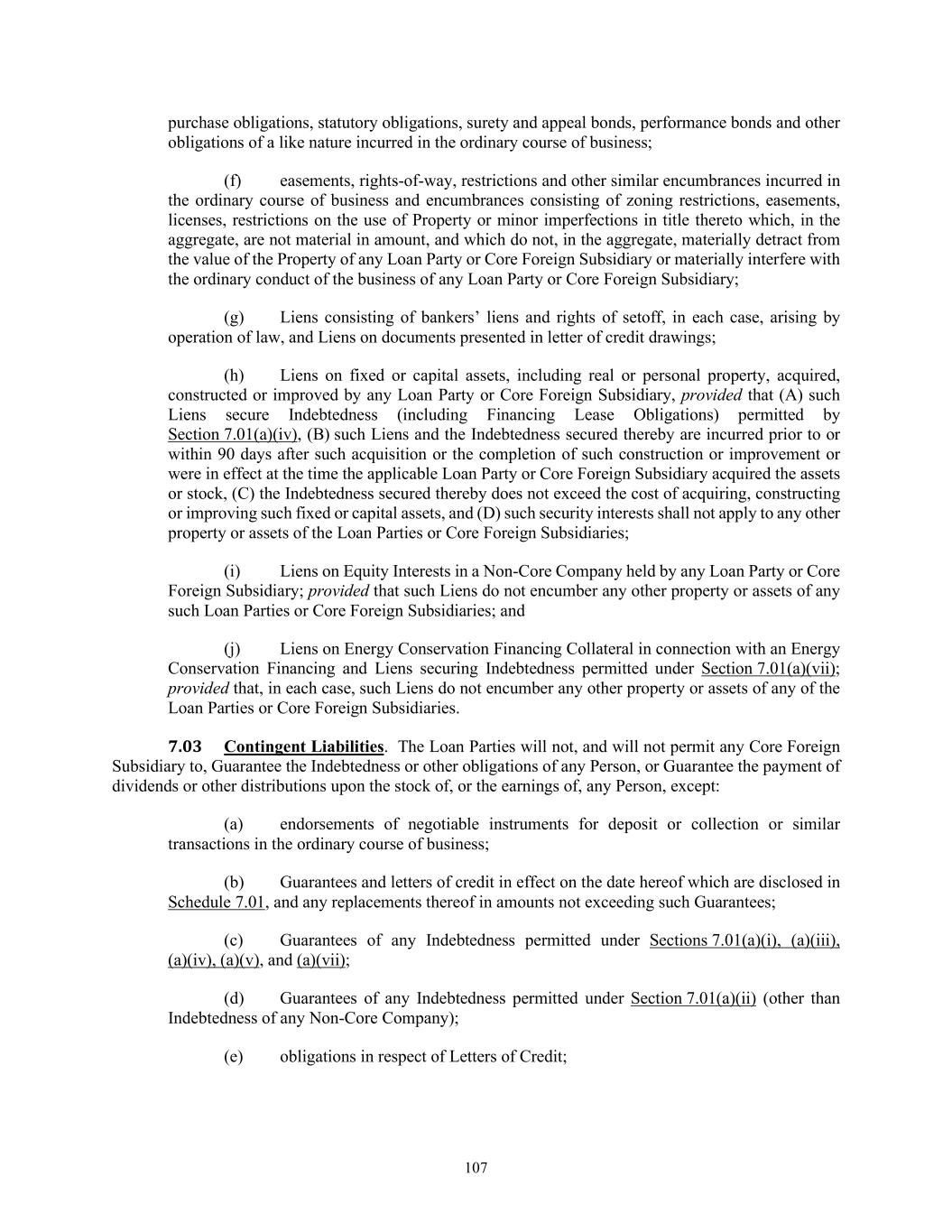 107 purchase obligations, statutory obligations, surety and appeal bonds, performance bonds and other obligations of a like nature incurred in the ordinary course of business; (f) easements, rights-of-way, restrictions and other similar encumbrances incurred in the ordinary course of business and encumbrances consisting of zoning restrictions, easements, licenses, restrictions on the use of Property or minor imperfections in title thereto which, in the aggregate, are not material in amount, and which do not, in the aggregate, materially detract from the value of the Property of any Loan Party or Core Foreign Subsidiary or materially interfere with the ordinary conduct of the business of any Loan Party or Core Foreign Subsidiary; (g) Liens consisting of bankers’ liens and rights of setoff, in each case, arising by operation of law, and Liens on documents presented in letter of credit drawings; (h) Liens on fixed or capital assets, including real or personal property, acquired, constructed or improved by any Loan Party or Core Foreign Subsidiary, provided that (A) such Liens secure Indebtedness (including Financing Lease Obligations) permitted by Section 7.01(a)(iv), (B) such Liens and the Indebtedness secured thereby are incurred prior to or within 90 days after such acquisition or the completion of such construction or improvement or were in effect at the time the applicable Loan Party or Core Foreign Subsidiary acquired the assets or stock, (C) the Indebtedness secured thereby does not exceed the cost of acquiring, constructing or improving such fixed or capital assets, and (D) such security interests shall not apply to any other property or assets of the Loan Parties or Core Foreign Subsidiaries; (i) Liens on Equity Interests in a Non-Core Company held by any Loan Party or Core Foreign Subsidiary; provided that such Liens do not encumber any other property or assets of any such Loan Parties or Core Foreign Subsidiaries; and (j) Liens on Energy Conservation Financing Collateral in connection with an Energy Conservation Financing and Liens securing Indebtedness permitted under Section 7.01(a)(vii); provided that, in each case, such Liens do not encumber any other property or assets of any of the Loan Parties or Core Foreign Subsidiaries. 7.03 Contingent Liabilities. The Loan Parties will not, and will not permit any Core Foreign Subsidiary to, Guarantee the Indebtedness or other obligations of any Person, or Guarantee the payment of dividends or other distributions upon the stock of, or the earnings of, any Person, except: (a) endorsements of negotiable instruments for deposit or collection or similar transactions in the ordinary course of business; (b) Guarantees and letters of credit in effect on the date hereof which are disclosed in Schedule 7.01, and any replacements thereof in amounts not exceeding such Guarantees; (c) Guarantees of any Indebtedness permitted under Sections 7.01(a)(i), (a)(iii), (a)(iv), (a)(v), and (a)(vii); (d) Guarantees of any Indebtedness permitted under Section 7.01(a)(ii) (other than Indebtedness of any Non-Core Company); (e) obligations in respect of Letters of Credit;