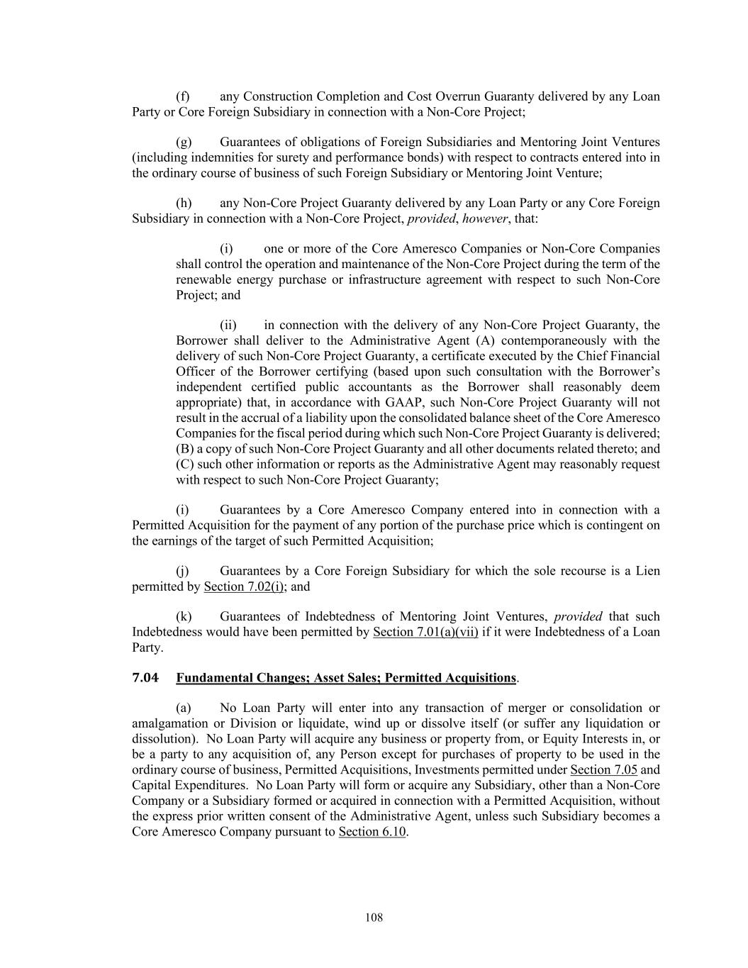 108 (f) any Construction Completion and Cost Overrun Guaranty delivered by any Loan Party or Core Foreign Subsidiary in connection with a Non-Core Project; (g) Guarantees of obligations of Foreign Subsidiaries and Mentoring Joint Ventures (including indemnities for surety and performance bonds) with respect to contracts entered into in the ordinary course of business of such Foreign Subsidiary or Mentoring Joint Venture; (h) any Non-Core Project Guaranty delivered by any Loan Party or any Core Foreign Subsidiary in connection with a Non-Core Project, provided, however, that: (i) one or more of the Core Ameresco Companies or Non-Core Companies shall control the operation and maintenance of the Non-Core Project during the term of the renewable energy purchase or infrastructure agreement with respect to such Non-Core Project; and (ii) in connection with the delivery of any Non-Core Project Guaranty, the Borrower shall deliver to the Administrative Agent (A) contemporaneously with the delivery of such Non-Core Project Guaranty, a certificate executed by the Chief Financial Officer of the Borrower certifying (based upon such consultation with the Borrower’s independent certified public accountants as the Borrower shall reasonably deem appropriate) that, in accordance with GAAP, such Non-Core Project Guaranty will not result in the accrual of a liability upon the consolidated balance sheet of the Core Ameresco Companies for the fiscal period during which such Non-Core Project Guaranty is delivered; (B) a copy of such Non-Core Project Guaranty and all other documents related thereto; and (C) such other information or reports as the Administrative Agent may reasonably request with respect to such Non-Core Project Guaranty; (i) Guarantees by a Core Ameresco Company entered into in connection with a Permitted Acquisition for the payment of any portion of the purchase price which is contingent on the earnings of the target of such Permitted Acquisition; (j) Guarantees by a Core Foreign Subsidiary for which the sole recourse is a Lien permitted by Section 7.02(i); and (k) Guarantees of Indebtedness of Mentoring Joint Ventures, provided that such Indebtedness would have been permitted by Section 7.01(a)(vii) if it were Indebtedness of a Loan Party. 7.04 Fundamental Changes; Asset Sales; Permitted Acquisitions. (a) No Loan Party will enter into any transaction of merger or consolidation or amalgamation or Division or liquidate, wind up or dissolve itself (or suffer any liquidation or dissolution). No Loan Party will acquire any business or property from, or Equity Interests in, or be a party to any acquisition of, any Person except for purchases of property to be used in the ordinary course of business, Permitted Acquisitions, Investments permitted under Section 7.05 and Capital Expenditures. No Loan Party will form or acquire any Subsidiary, other than a Non-Core Company or a Subsidiary formed or acquired in connection with a Permitted Acquisition, without the express prior written consent of the Administrative Agent, unless such Subsidiary becomes a Core Ameresco Company pursuant to Section 6.10.