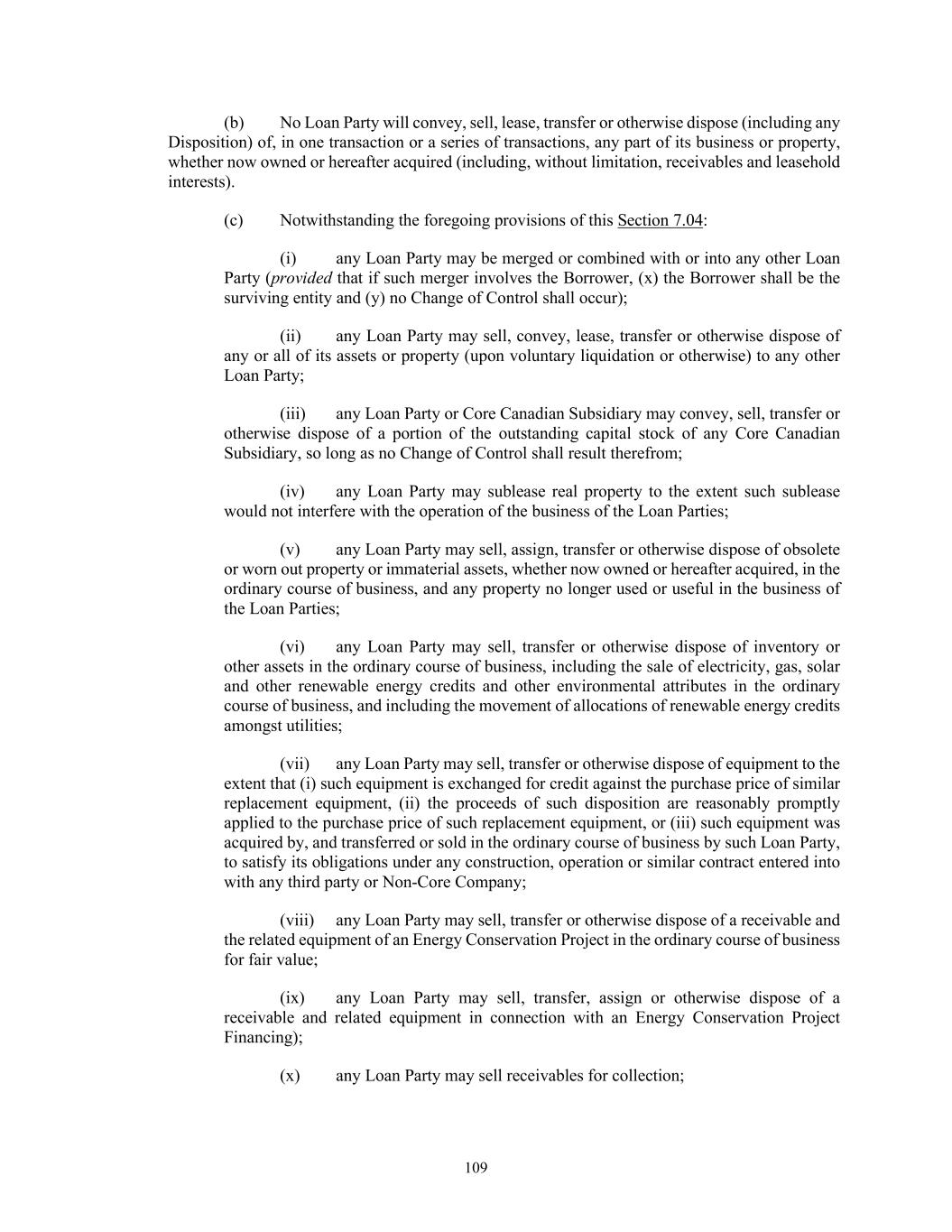109 (b) No Loan Party will convey, sell, lease, transfer or otherwise dispose (including any Disposition) of, in one transaction or a series of transactions, any part of its business or property, whether now owned or hereafter acquired (including, without limitation, receivables and leasehold interests). (c) Notwithstanding the foregoing provisions of this Section 7.04: (i) any Loan Party may be merged or combined with or into any other Loan Party (provided that if such merger involves the Borrower, (x) the Borrower shall be the surviving entity and (y) no Change of Control shall occur); (ii) any Loan Party may sell, convey, lease, transfer or otherwise dispose of any or all of its assets or property (upon voluntary liquidation or otherwise) to any other Loan Party; (iii) any Loan Party or Core Canadian Subsidiary may convey, sell, transfer or otherwise dispose of a portion of the outstanding capital stock of any Core Canadian Subsidiary, so long as no Change of Control shall result therefrom; (iv) any Loan Party may sublease real property to the extent such sublease would not interfere with the operation of the business of the Loan Parties; (v) any Loan Party may sell, assign, transfer or otherwise dispose of obsolete or worn out property or immaterial assets, whether now owned or hereafter acquired, in the ordinary course of business, and any property no longer used or useful in the business of the Loan Parties; (vi) any Loan Party may sell, transfer or otherwise dispose of inventory or other assets in the ordinary course of business, including the sale of electricity, gas, solar and other renewable energy credits and other environmental attributes in the ordinary course of business, and including the movement of allocations of renewable energy credits amongst utilities; (vii) any Loan Party may sell, transfer or otherwise dispose of equipment to the extent that (i) such equipment is exchanged for credit against the purchase price of similar replacement equipment, (ii) the proceeds of such disposition are reasonably promptly applied to the purchase price of such replacement equipment, or (iii) such equipment was acquired by, and transferred or sold in the ordinary course of business by such Loan Party, to satisfy its obligations under any construction, operation or similar contract entered into with any third party or Non-Core Company; (viii) any Loan Party may sell, transfer or otherwise dispose of a receivable and the related equipment of an Energy Conservation Project in the ordinary course of business for fair value; (ix) any Loan Party may sell, transfer, assign or otherwise dispose of a receivable and related equipment in connection with an Energy Conservation Project Financing); (x) any Loan Party may sell receivables for collection;