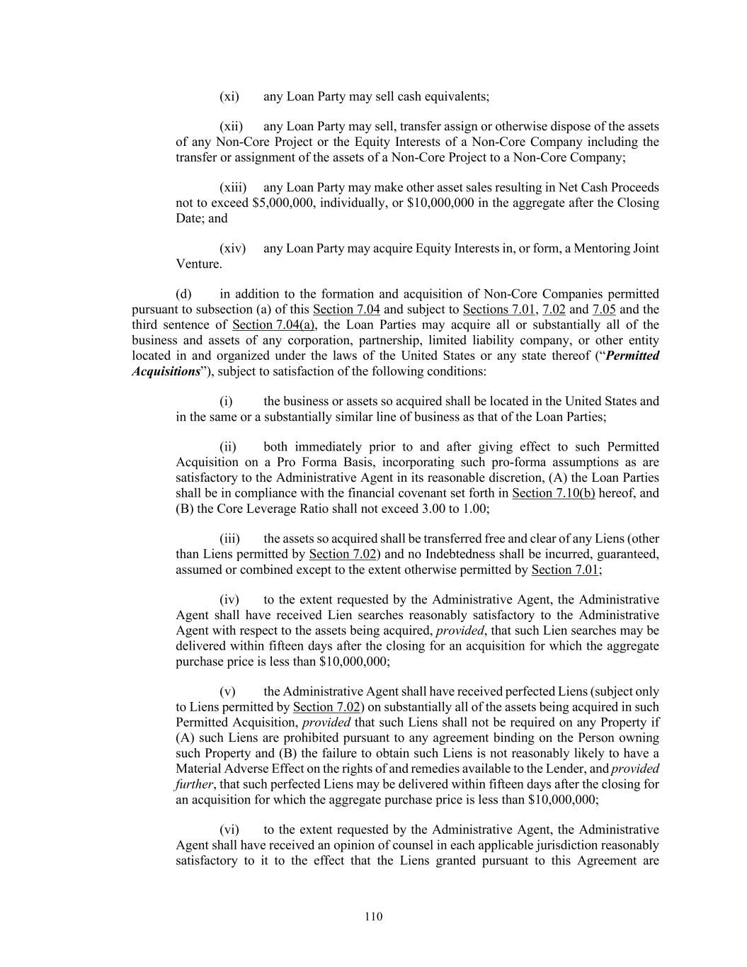 110 (xi) any Loan Party may sell cash equivalents; (xii) any Loan Party may sell, transfer assign or otherwise dispose of the assets of any Non-Core Project or the Equity Interests of a Non-Core Company including the transfer or assignment of the assets of a Non-Core Project to a Non-Core Company; (xiii) any Loan Party may make other asset sales resulting in Net Cash Proceeds not to exceed $5,000,000, individually, or $10,000,000 in the aggregate after the Closing Date; and (xiv) any Loan Party may acquire Equity Interests in, or form, a Mentoring Joint Venture. (d) in addition to the formation and acquisition of Non-Core Companies permitted pursuant to subsection (a) of this Section 7.04 and subject to Sections 7.01, 7.02 and 7.05 and the third sentence of Section 7.04(a), the Loan Parties may acquire all or substantially all of the business and assets of any corporation, partnership, limited liability company, or other entity located in and organized under the laws of the United States or any state thereof (“Permitted Acquisitions”), subject to satisfaction of the following conditions: (i) the business or assets so acquired shall be located in the United States and in the same or a substantially similar line of business as that of the Loan Parties; (ii) both immediately prior to and after giving effect to such Permitted Acquisition on a Pro Forma Basis, incorporating such pro-forma assumptions as are satisfactory to the Administrative Agent in its reasonable discretion, (A) the Loan Parties shall be in compliance with the financial covenant set forth in Section 7.10(b) hereof, and (B) the Core Leverage Ratio shall not exceed 3.00 to 1.00; (iii) the assets so acquired shall be transferred free and clear of any Liens (other than Liens permitted by Section 7.02) and no Indebtedness shall be incurred, guaranteed, assumed or combined except to the extent otherwise permitted by Section 7.01; (iv) to the extent requested by the Administrative Agent, the Administrative Agent shall have received Lien searches reasonably satisfactory to the Administrative Agent with respect to the assets being acquired, provided, that such Lien searches may be delivered within fifteen days after the closing for an acquisition for which the aggregate purchase price is less than $10,000,000; (v) the Administrative Agent shall have received perfected Liens (subject only to Liens permitted by Section 7.02) on substantially all of the assets being acquired in such Permitted Acquisition, provided that such Liens shall not be required on any Property if (A) such Liens are prohibited pursuant to any agreement binding on the Person owning such Property and (B) the failure to obtain such Liens is not reasonably likely to have a Material Adverse Effect on the rights of and remedies available to the Lender, and provided further, that such perfected Liens may be delivered within fifteen days after the closing for an acquisition for which the aggregate purchase price is less than $10,000,000; (vi) to the extent requested by the Administrative Agent, the Administrative Agent shall have received an opinion of counsel in each applicable jurisdiction reasonably satisfactory to it to the effect that the Liens granted pursuant to this Agreement are