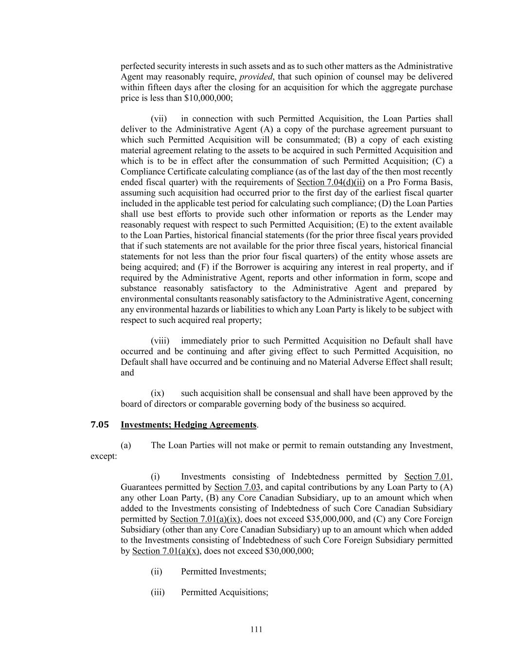 111 perfected security interests in such assets and as to such other matters as the Administrative Agent may reasonably require, provided, that such opinion of counsel may be delivered within fifteen days after the closing for an acquisition for which the aggregate purchase price is less than $10,000,000; (vii) in connection with such Permitted Acquisition, the Loan Parties shall deliver to the Administrative Agent (A) a copy of the purchase agreement pursuant to which such Permitted Acquisition will be consummated; (B) a copy of each existing material agreement relating to the assets to be acquired in such Permitted Acquisition and which is to be in effect after the consummation of such Permitted Acquisition; (C) a Compliance Certificate calculating compliance (as of the last day of the then most recently ended fiscal quarter) with the requirements of Section 7.04(d)(ii) on a Pro Forma Basis, assuming such acquisition had occurred prior to the first day of the earliest fiscal quarter included in the applicable test period for calculating such compliance; (D) the Loan Parties shall use best efforts to provide such other information or reports as the Lender may reasonably request with respect to such Permitted Acquisition; (E) to the extent available to the Loan Parties, historical financial statements (for the prior three fiscal years provided that if such statements are not available for the prior three fiscal years, historical financial statements for not less than the prior four fiscal quarters) of the entity whose assets are being acquired; and (F) if the Borrower is acquiring any interest in real property, and if required by the Administrative Agent, reports and other information in form, scope and substance reasonably satisfactory to the Administrative Agent and prepared by environmental consultants reasonably satisfactory to the Administrative Agent, concerning any environmental hazards or liabilities to which any Loan Party is likely to be subject with respect to such acquired real property; (viii) immediately prior to such Permitted Acquisition no Default shall have occurred and be continuing and after giving effect to such Permitted Acquisition, no Default shall have occurred and be continuing and no Material Adverse Effect shall result; and (ix) such acquisition shall be consensual and shall have been approved by the board of directors or comparable governing body of the business so acquired. 7.05 Investments; Hedging Agreements. (a) The Loan Parties will not make or permit to remain outstanding any Investment, except: (i) Investments consisting of Indebtedness permitted by Section 7.01, Guarantees permitted by Section 7.03, and capital contributions by any Loan Party to (A) any other Loan Party, (B) any Core Canadian Subsidiary, up to an amount which when added to the Investments consisting of Indebtedness of such Core Canadian Subsidiary permitted by Section 7.01(a)(ix), does not exceed $35,000,000, and (C) any Core Foreign Subsidiary (other than any Core Canadian Subsidiary) up to an amount which when added to the Investments consisting of Indebtedness of such Core Foreign Subsidiary permitted by Section 7.01(a)(x), does not exceed $30,000,000; (ii) Permitted Investments; (iii) Permitted Acquisitions;