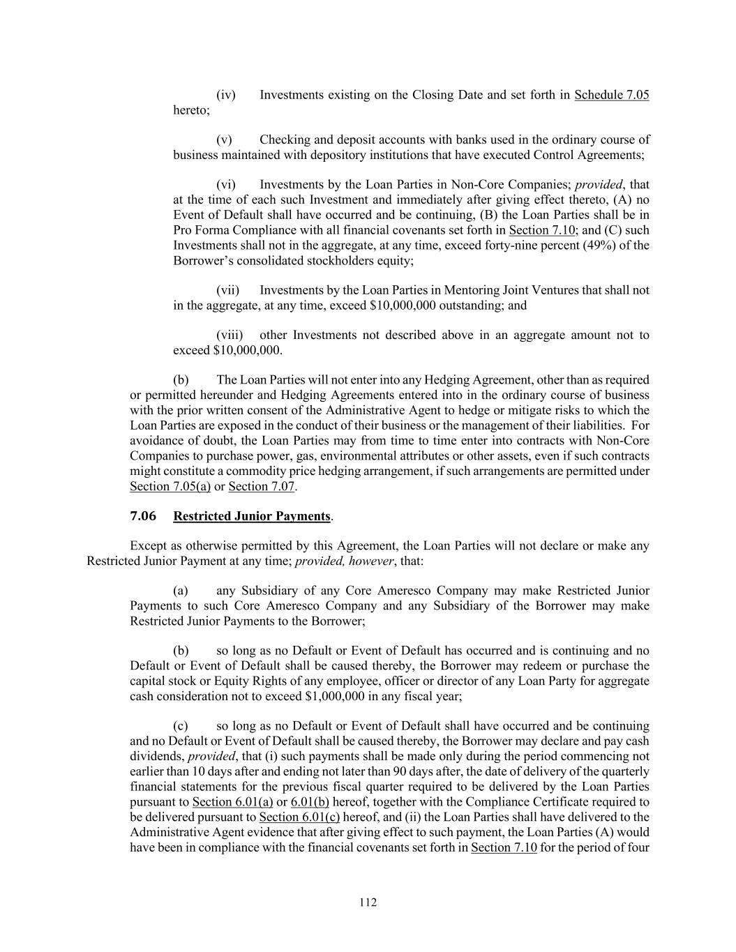 112 (iv) Investments existing on the Closing Date and set forth in Schedule 7.05 hereto; (v) Checking and deposit accounts with banks used in the ordinary course of business maintained with depository institutions that have executed Control Agreements; (vi) Investments by the Loan Parties in Non-Core Companies; provided, that at the time of each such Investment and immediately after giving effect thereto, (A) no Event of Default shall have occurred and be continuing, (B) the Loan Parties shall be in Pro Forma Compliance with all financial covenants set forth in Section 7.10; and (C) such Investments shall not in the aggregate, at any time, exceed forty-nine percent (49%) of the Borrower’s consolidated stockholders equity; (vii) Investments by the Loan Parties in Mentoring Joint Ventures that shall not in the aggregate, at any time, exceed $10,000,000 outstanding; and (viii) other Investments not described above in an aggregate amount not to exceed $10,000,000. (b) The Loan Parties will not enter into any Hedging Agreement, other than as required or permitted hereunder and Hedging Agreements entered into in the ordinary course of business with the prior written consent of the Administrative Agent to hedge or mitigate risks to which the Loan Parties are exposed in the conduct of their business or the management of their liabilities. For avoidance of doubt, the Loan Parties may from time to time enter into contracts with Non-Core Companies to purchase power, gas, environmental attributes or other assets, even if such contracts might constitute a commodity price hedging arrangement, if such arrangements are permitted under Section 7.05(a) or Section 7.07. 7.06 Restricted Junior Payments. Except as otherwise permitted by this Agreement, the Loan Parties will not declare or make any Restricted Junior Payment at any time; provided, however, that: (a) any Subsidiary of any Core Ameresco Company may make Restricted Junior Payments to such Core Ameresco Company and any Subsidiary of the Borrower may make Restricted Junior Payments to the Borrower; (b) so long as no Default or Event of Default has occurred and is continuing and no Default or Event of Default shall be caused thereby, the Borrower may redeem or purchase the capital stock or Equity Rights of any employee, officer or director of any Loan Party for aggregate cash consideration not to exceed $1,000,000 in any fiscal year; (c) so long as no Default or Event of Default shall have occurred and be continuing and no Default or Event of Default shall be caused thereby, the Borrower may declare and pay cash dividends, provided, that (i) such payments shall be made only during the period commencing not earlier than 10 days after and ending not later than 90 days after, the date of delivery of the quarterly financial statements for the previous fiscal quarter required to be delivered by the Loan Parties pursuant to Section 6.01(a) or 6.01(b) hereof, together with the Compliance Certificate required to be delivered pursuant to Section 6.01(c) hereof, and (ii) the Loan Parties shall have delivered to the Administrative Agent evidence that after giving effect to such payment, the Loan Parties (A) would have been in compliance with the financial covenants set forth in Section 7.10 for the period of four