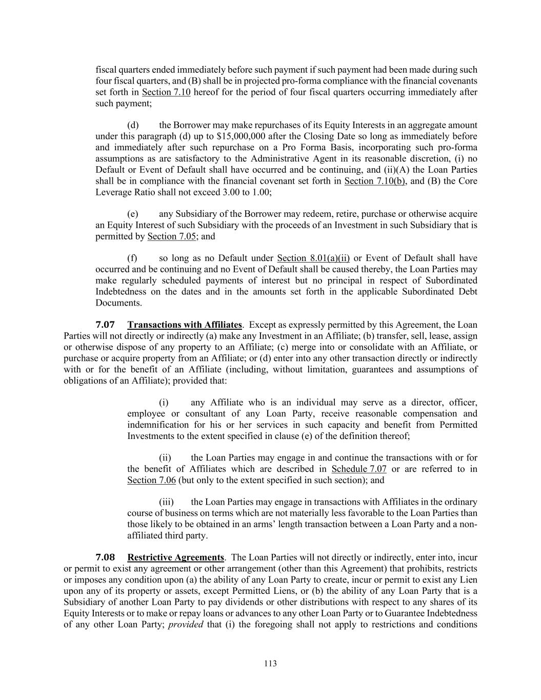 113 fiscal quarters ended immediately before such payment if such payment had been made during such four fiscal quarters, and (B) shall be in projected pro-forma compliance with the financial covenants set forth in Section 7.10 hereof for the period of four fiscal quarters occurring immediately after such payment; (d) the Borrower may make repurchases of its Equity Interests in an aggregate amount under this paragraph (d) up to $15,000,000 after the Closing Date so long as immediately before and immediately after such repurchase on a Pro Forma Basis, incorporating such pro-forma assumptions as are satisfactory to the Administrative Agent in its reasonable discretion, (i) no Default or Event of Default shall have occurred and be continuing, and (ii)(A) the Loan Parties shall be in compliance with the financial covenant set forth in Section 7.10(b), and (B) the Core Leverage Ratio shall not exceed 3.00 to 1.00; (e) any Subsidiary of the Borrower may redeem, retire, purchase or otherwise acquire an Equity Interest of such Subsidiary with the proceeds of an Investment in such Subsidiary that is permitted by Section 7.05; and (f) so long as no Default under Section 8.01(a)(ii) or Event of Default shall have occurred and be continuing and no Event of Default shall be caused thereby, the Loan Parties may make regularly scheduled payments of interest but no principal in respect of Subordinated Indebtedness on the dates and in the amounts set forth in the applicable Subordinated Debt Documents. 7.07 Transactions with Affiliates. Except as expressly permitted by this Agreement, the Loan Parties will not directly or indirectly (a) make any Investment in an Affiliate; (b) transfer, sell, lease, assign or otherwise dispose of any property to an Affiliate; (c) merge into or consolidate with an Affiliate, or purchase or acquire property from an Affiliate; or (d) enter into any other transaction directly or indirectly with or for the benefit of an Affiliate (including, without limitation, guarantees and assumptions of obligations of an Affiliate); provided that: (i) any Affiliate who is an individual may serve as a director, officer, employee or consultant of any Loan Party, receive reasonable compensation and indemnification for his or her services in such capacity and benefit from Permitted Investments to the extent specified in clause (e) of the definition thereof; (ii) the Loan Parties may engage in and continue the transactions with or for the benefit of Affiliates which are described in Schedule 7.07 or are referred to in Section 7.06 (but only to the extent specified in such section); and (iii) the Loan Parties may engage in transactions with Affiliates in the ordinary course of business on terms which are not materially less favorable to the Loan Parties than those likely to be obtained in an arms’ length transaction between a Loan Party and a non- affiliated third party. 7.08 Restrictive Agreements. The Loan Parties will not directly or indirectly, enter into, incur or permit to exist any agreement or other arrangement (other than this Agreement) that prohibits, restricts or imposes any condition upon (a) the ability of any Loan Party to create, incur or permit to exist any Lien upon any of its property or assets, except Permitted Liens, or (b) the ability of any Loan Party that is a Subsidiary of another Loan Party to pay dividends or other distributions with respect to any shares of its Equity Interests or to make or repay loans or advances to any other Loan Party or to Guarantee Indebtedness of any other Loan Party; provided that (i) the foregoing shall not apply to restrictions and conditions