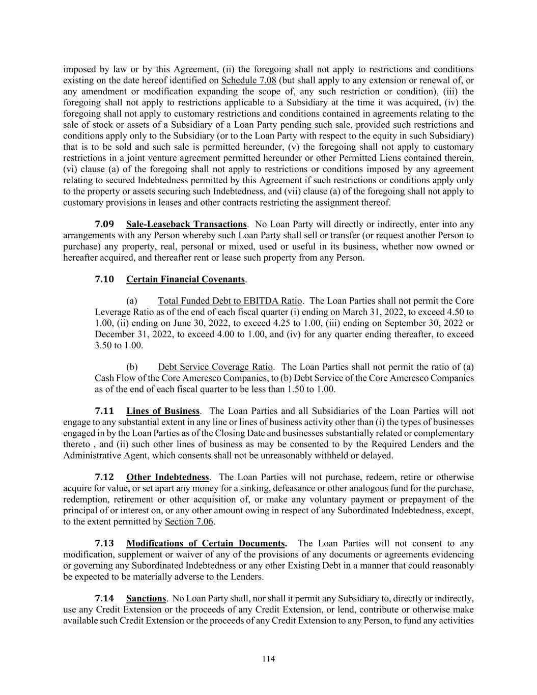 114 imposed by law or by this Agreement, (ii) the foregoing shall not apply to restrictions and conditions existing on the date hereof identified on Schedule 7.08 (but shall apply to any extension or renewal of, or any amendment or modification expanding the scope of, any such restriction or condition), (iii) the foregoing shall not apply to restrictions applicable to a Subsidiary at the time it was acquired, (iv) the foregoing shall not apply to customary restrictions and conditions contained in agreements relating to the sale of stock or assets of a Subsidiary of a Loan Party pending such sale, provided such restrictions and conditions apply only to the Subsidiary (or to the Loan Party with respect to the equity in such Subsidiary) that is to be sold and such sale is permitted hereunder, (v) the foregoing shall not apply to customary restrictions in a joint venture agreement permitted hereunder or other Permitted Liens contained therein, (vi) clause (a) of the foregoing shall not apply to restrictions or conditions imposed by any agreement relating to secured Indebtedness permitted by this Agreement if such restrictions or conditions apply only to the property or assets securing such Indebtedness, and (vii) clause (a) of the foregoing shall not apply to customary provisions in leases and other contracts restricting the assignment thereof. 7.09 Sale-Leaseback Transactions. No Loan Party will directly or indirectly, enter into any arrangements with any Person whereby such Loan Party shall sell or transfer (or request another Person to purchase) any property, real, personal or mixed, used or useful in its business, whether now owned or hereafter acquired, and thereafter rent or lease such property from any Person. 7.10 Certain Financial Covenants. (a) Total Funded Debt to EBITDA Ratio. The Loan Parties shall not permit the Core Leverage Ratio as of the end of each fiscal quarter (i) ending on March 31, 2022, to exceed 4.50 to 1.00, (ii) ending on June 30, 2022, to exceed 4.25 to 1.00, (iii) ending on September 30, 2022 or December 31, 2022, to exceed 4.00 to 1.00, and (iv) for any quarter ending thereafter, to exceed 3.50 to 1.00. (b) Debt Service Coverage Ratio. The Loan Parties shall not permit the ratio of (a) Cash Flow of the Core Ameresco Companies, to (b) Debt Service of the Core Ameresco Companies as of the end of each fiscal quarter to be less than 1.50 to 1.00. 7.11 Lines of Business. The Loan Parties and all Subsidiaries of the Loan Parties will not engage to any substantial extent in any line or lines of business activity other than (i) the types of businesses engaged in by the Loan Parties as of the Closing Date and businesses substantially related or complementary thereto , and (ii) such other lines of business as may be consented to by the Required Lenders and the Administrative Agent, which consents shall not be unreasonably withheld or delayed. 7.12 Other Indebtedness. The Loan Parties will not purchase, redeem, retire or otherwise acquire for value, or set apart any money for a sinking, defeasance or other analogous fund for the purchase, redemption, retirement or other acquisition of, or make any voluntary payment or prepayment of the principal of or interest on, or any other amount owing in respect of any Subordinated Indebtedness, except, to the extent permitted by Section 7.06. 7.13 Modifications of Certain Documents. The Loan Parties will not consent to any modification, supplement or waiver of any of the provisions of any documents or agreements evidencing or governing any Subordinated Indebtedness or any other Existing Debt in a manner that could reasonably be expected to be materially adverse to the Lenders. 7.14 Sanctions. No Loan Party shall, nor shall it permit any Subsidiary to, directly or indirectly, use any Credit Extension or the proceeds of any Credit Extension, or lend, contribute or otherwise make available such Credit Extension or the proceeds of any Credit Extension to any Person, to fund any activities