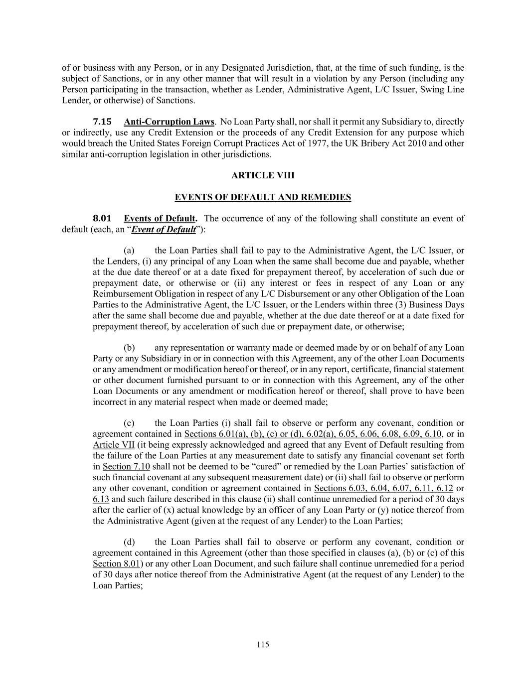 115 of or business with any Person, or in any Designated Jurisdiction, that, at the time of such funding, is the subject of Sanctions, or in any other manner that will result in a violation by any Person (including any Person participating in the transaction, whether as Lender, Administrative Agent, L/C Issuer, Swing Line Lender, or otherwise) of Sanctions. 7.15 Anti-Corruption Laws. No Loan Party shall, nor shall it permit any Subsidiary to, directly or indirectly, use any Credit Extension or the proceeds of any Credit Extension for any purpose which would breach the United States Foreign Corrupt Practices Act of 1977, the UK Bribery Act 2010 and other similar anti-corruption legislation in other jurisdictions. ARTICLE VIII EVENTS OF DEFAULT AND REMEDIES 8.01 Events of Default. The occurrence of any of the following shall constitute an event of default (each, an “Event of Default”): (a) the Loan Parties shall fail to pay to the Administrative Agent, the L/C Issuer, or the Lenders, (i) any principal of any Loan when the same shall become due and payable, whether at the due date thereof or at a date fixed for prepayment thereof, by acceleration of such due or prepayment date, or otherwise or (ii) any interest or fees in respect of any Loan or any Reimbursement Obligation in respect of any L/C Disbursement or any other Obligation of the Loan Parties to the Administrative Agent, the L/C Issuer, or the Lenders within three (3) Business Days after the same shall become due and payable, whether at the due date thereof or at a date fixed for prepayment thereof, by acceleration of such due or prepayment date, or otherwise; (b) any representation or warranty made or deemed made by or on behalf of any Loan Party or any Subsidiary in or in connection with this Agreement, any of the other Loan Documents or any amendment or modification hereof or thereof, or in any report, certificate, financial statement or other document furnished pursuant to or in connection with this Agreement, any of the other Loan Documents or any amendment or modification hereof or thereof, shall prove to have been incorrect in any material respect when made or deemed made; (c) the Loan Parties (i) shall fail to observe or perform any covenant, condition or agreement contained in Sections 6.01(a), (b), (c) or (d), 6.02(a), 6.05, 6.06, 6.08, 6.09, 6.10, or in Article VII (it being expressly acknowledged and agreed that any Event of Default resulting from the failure of the Loan Parties at any measurement date to satisfy any financial covenant set forth in Section 7.10 shall not be deemed to be “cured” or remedied by the Loan Parties’ satisfaction of such financial covenant at any subsequent measurement date) or (ii) shall fail to observe or perform any other covenant, condition or agreement contained in Sections 6.03, 6.04, 6.07, 6.11, 6.12 or 6.13 and such failure described in this clause (ii) shall continue unremedied for a period of 30 days after the earlier of (x) actual knowledge by an officer of any Loan Party or (y) notice thereof from the Administrative Agent (given at the request of any Lender) to the Loan Parties; (d) the Loan Parties shall fail to observe or perform any covenant, condition or agreement contained in this Agreement (other than those specified in clauses (a), (b) or (c) of this Section 8.01) or any other Loan Document, and such failure shall continue unremedied for a period of 30 days after notice thereof from the Administrative Agent (at the request of any Lender) to the Loan Parties;