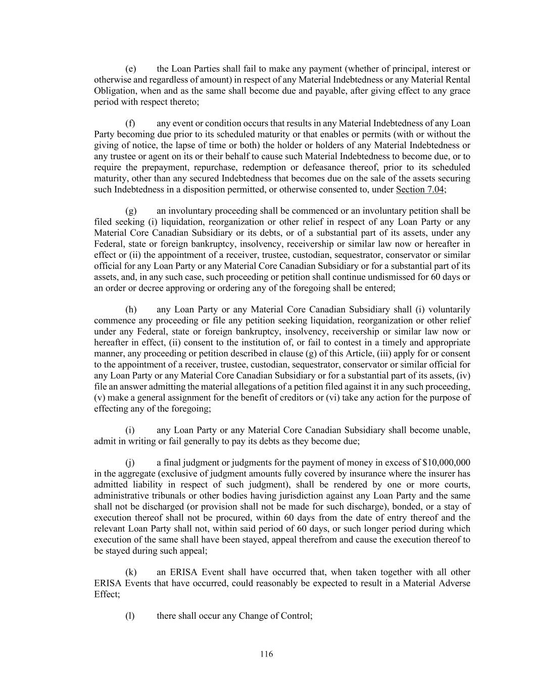 116 (e) the Loan Parties shall fail to make any payment (whether of principal, interest or otherwise and regardless of amount) in respect of any Material Indebtedness or any Material Rental Obligation, when and as the same shall become due and payable, after giving effect to any grace period with respect thereto; (f) any event or condition occurs that results in any Material Indebtedness of any Loan Party becoming due prior to its scheduled maturity or that enables or permits (with or without the giving of notice, the lapse of time or both) the holder or holders of any Material Indebtedness or any trustee or agent on its or their behalf to cause such Material Indebtedness to become due, or to require the prepayment, repurchase, redemption or defeasance thereof, prior to its scheduled maturity, other than any secured Indebtedness that becomes due on the sale of the assets securing such Indebtedness in a disposition permitted, or otherwise consented to, under Section 7.04; (g) an involuntary proceeding shall be commenced or an involuntary petition shall be filed seeking (i) liquidation, reorganization or other relief in respect of any Loan Party or any Material Core Canadian Subsidiary or its debts, or of a substantial part of its assets, under any Federal, state or foreign bankruptcy, insolvency, receivership or similar law now or hereafter in effect or (ii) the appointment of a receiver, trustee, custodian, sequestrator, conservator or similar official for any Loan Party or any Material Core Canadian Subsidiary or for a substantial part of its assets, and, in any such case, such proceeding or petition shall continue undismissed for 60 days or an order or decree approving or ordering any of the foregoing shall be entered; (h) any Loan Party or any Material Core Canadian Subsidiary shall (i) voluntarily commence any proceeding or file any petition seeking liquidation, reorganization or other relief under any Federal, state or foreign bankruptcy, insolvency, receivership or similar law now or hereafter in effect, (ii) consent to the institution of, or fail to contest in a timely and appropriate manner, any proceeding or petition described in clause (g) of this Article, (iii) apply for or consent to the appointment of a receiver, trustee, custodian, sequestrator, conservator or similar official for any Loan Party or any Material Core Canadian Subsidiary or for a substantial part of its assets, (iv) file an answer admitting the material allegations of a petition filed against it in any such proceeding, (v) make a general assignment for the benefit of creditors or (vi) take any action for the purpose of effecting any of the foregoing; (i) any Loan Party or any Material Core Canadian Subsidiary shall become unable, admit in writing or fail generally to pay its debts as they become due; (j) a final judgment or judgments for the payment of money in excess of $10,000,000 in the aggregate (exclusive of judgment amounts fully covered by insurance where the insurer has admitted liability in respect of such judgment), shall be rendered by one or more courts, administrative tribunals or other bodies having jurisdiction against any Loan Party and the same shall not be discharged (or provision shall not be made for such discharge), bonded, or a stay of execution thereof shall not be procured, within 60 days from the date of entry thereof and the relevant Loan Party shall not, within said period of 60 days, or such longer period during which execution of the same shall have been stayed, appeal therefrom and cause the execution thereof to be stayed during such appeal; (k) an ERISA Event shall have occurred that, when taken together with all other ERISA Events that have occurred, could reasonably be expected to result in a Material Adverse Effect; (l) there shall occur any Change of Control;