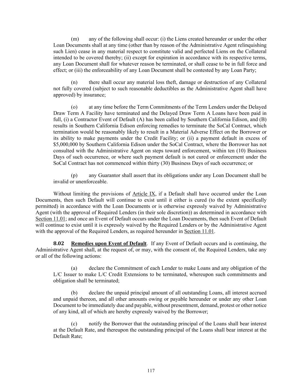 117 (m) any of the following shall occur: (i) the Liens created hereunder or under the other Loan Documents shall at any time (other than by reason of the Administrative Agent relinquishing such Lien) cease in any material respect to constitute valid and perfected Liens on the Collateral intended to be covered thereby; (ii) except for expiration in accordance with its respective terms, any Loan Document shall for whatever reason be terminated, or shall cease to be in full force and effect; or (iii) the enforceability of any Loan Document shall be contested by any Loan Party; (n) there shall occur any material loss theft, damage or destruction of any Collateral not fully covered (subject to such reasonable deductibles as the Administrative Agent shall have approved) by insurance; (o) at any time before the Term Commitments of the Term Lenders under the Delayed Draw Term A Facility have terminated and the Delayed Draw Term A Loans have been paid in full, (i) a Contractor Event of Default (A) has been called by Southern California Edison, and (B) results in Southern California Edison enforcing remedies to terminate the SoCal Contract, which termination would be reasonably likely to result in a Material Adverse Effect on the Borrower or its ability to make payments under the Credit Facility; or (ii) a payment default in excess of $5,000,000 by Southern California Edison under the SoCal Contract, where the Borrower has not consulted with the Administrative Agent on steps toward enforcement, within ten (10) Business Days of such occurrence, or where such payment default is not cured or enforcement under the SoCal Contract has not commenced within thirty (30) Business Days of such occurrence; or (p) any Guarantor shall assert that its obligations under any Loan Document shall be invalid or unenforceable. Without limiting the provisions of Article IX, if a Default shall have occurred under the Loan Documents, then such Default will continue to exist until it either is cured (to the extent specifically permitted) in accordance with the Loan Documents or is otherwise expressly waived by Administrative Agent (with the approval of Required Lenders (in their sole discretion)) as determined in accordance with Section 11.01; and once an Event of Default occurs under the Loan Documents, then such Event of Default will continue to exist until it is expressly waived by the Required Lenders or by the Administrative Agent with the approval of the Required Lenders, as required hereunder in Section 11.01. 8.02 Remedies upon Event of Default. If any Event of Default occurs and is continuing, the Administrative Agent shall, at the request of, or may, with the consent of, the Required Lenders, take any or all of the following actions: (a) declare the Commitment of each Lender to make Loans and any obligation of the L/C Issuer to make L/C Credit Extensions to be terminated, whereupon such commitments and obligation shall be terminated; (b) declare the unpaid principal amount of all outstanding Loans, all interest accrued and unpaid thereon, and all other amounts owing or payable hereunder or under any other Loan Document to be immediately due and payable, without presentment, demand, protest or other notice of any kind, all of which are hereby expressly waived by the Borrower; (c) notify the Borrower that the outstanding principal of the Loans shall bear interest at the Default Rate, and thereupon the outstanding principal of the Loans shall bear interest at the Default Rate;