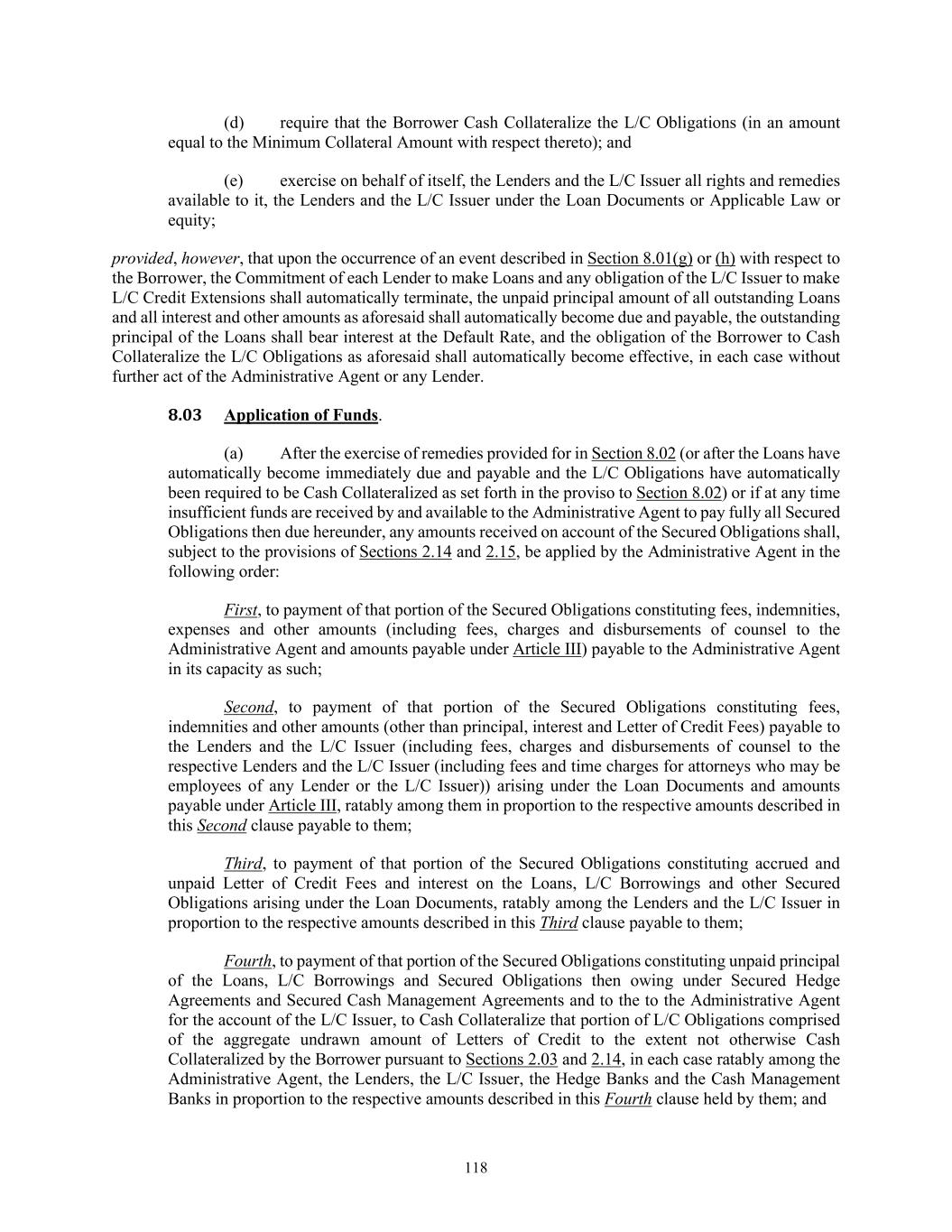 118 (d) require that the Borrower Cash Collateralize the L/C Obligations (in an amount equal to the Minimum Collateral Amount with respect thereto); and (e) exercise on behalf of itself, the Lenders and the L/C Issuer all rights and remedies available to it, the Lenders and the L/C Issuer under the Loan Documents or Applicable Law or equity; provided, however, that upon the occurrence of an event described in Section 8.01(g) or (h) with respect to the Borrower, the Commitment of each Lender to make Loans and any obligation of the L/C Issuer to make L/C Credit Extensions shall automatically terminate, the unpaid principal amount of all outstanding Loans and all interest and other amounts as aforesaid shall automatically become due and payable, the outstanding principal of the Loans shall bear interest at the Default Rate, and the obligation of the Borrower to Cash Collateralize the L/C Obligations as aforesaid shall automatically become effective, in each case without further act of the Administrative Agent or any Lender. 8.03 Application of Funds. (a) After the exercise of remedies provided for in Section 8.02 (or after the Loans have automatically become immediately due and payable and the L/C Obligations have automatically been required to be Cash Collateralized as set forth in the proviso to Section 8.02) or if at any time insufficient funds are received by and available to the Administrative Agent to pay fully all Secured Obligations then due hereunder, any amounts received on account of the Secured Obligations shall, subject to the provisions of Sections 2.14 and 2.15, be applied by the Administrative Agent in the following order: First, to payment of that portion of the Secured Obligations constituting fees, indemnities, expenses and other amounts (including fees, charges and disbursements of counsel to the Administrative Agent and amounts payable under Article III) payable to the Administrative Agent in its capacity as such; Second, to payment of that portion of the Secured Obligations constituting fees, indemnities and other amounts (other than principal, interest and Letter of Credit Fees) payable to the Lenders and the L/C Issuer (including fees, charges and disbursements of counsel to the respective Lenders and the L/C Issuer (including fees and time charges for attorneys who may be employees of any Lender or the L/C Issuer)) arising under the Loan Documents and amounts payable under Article III, ratably among them in proportion to the respective amounts described in this Second clause payable to them; Third, to payment of that portion of the Secured Obligations constituting accrued and unpaid Letter of Credit Fees and interest on the Loans, L/C Borrowings and other Secured Obligations arising under the Loan Documents, ratably among the Lenders and the L/C Issuer in proportion to the respective amounts described in this Third clause payable to them; Fourth, to payment of that portion of the Secured Obligations constituting unpaid principal of the Loans, L/C Borrowings and Secured Obligations then owing under Secured Hedge Agreements and Secured Cash Management Agreements and to the to the Administrative Agent for the account of the L/C Issuer, to Cash Collateralize that portion of L/C Obligations comprised of the aggregate undrawn amount of Letters of Credit to the extent not otherwise Cash Collateralized by the Borrower pursuant to Sections 2.03 and 2.14, in each case ratably among the Administrative Agent, the Lenders, the L/C Issuer, the Hedge Banks and the Cash Management Banks in proportion to the respective amounts described in this Fourth clause held by them; and