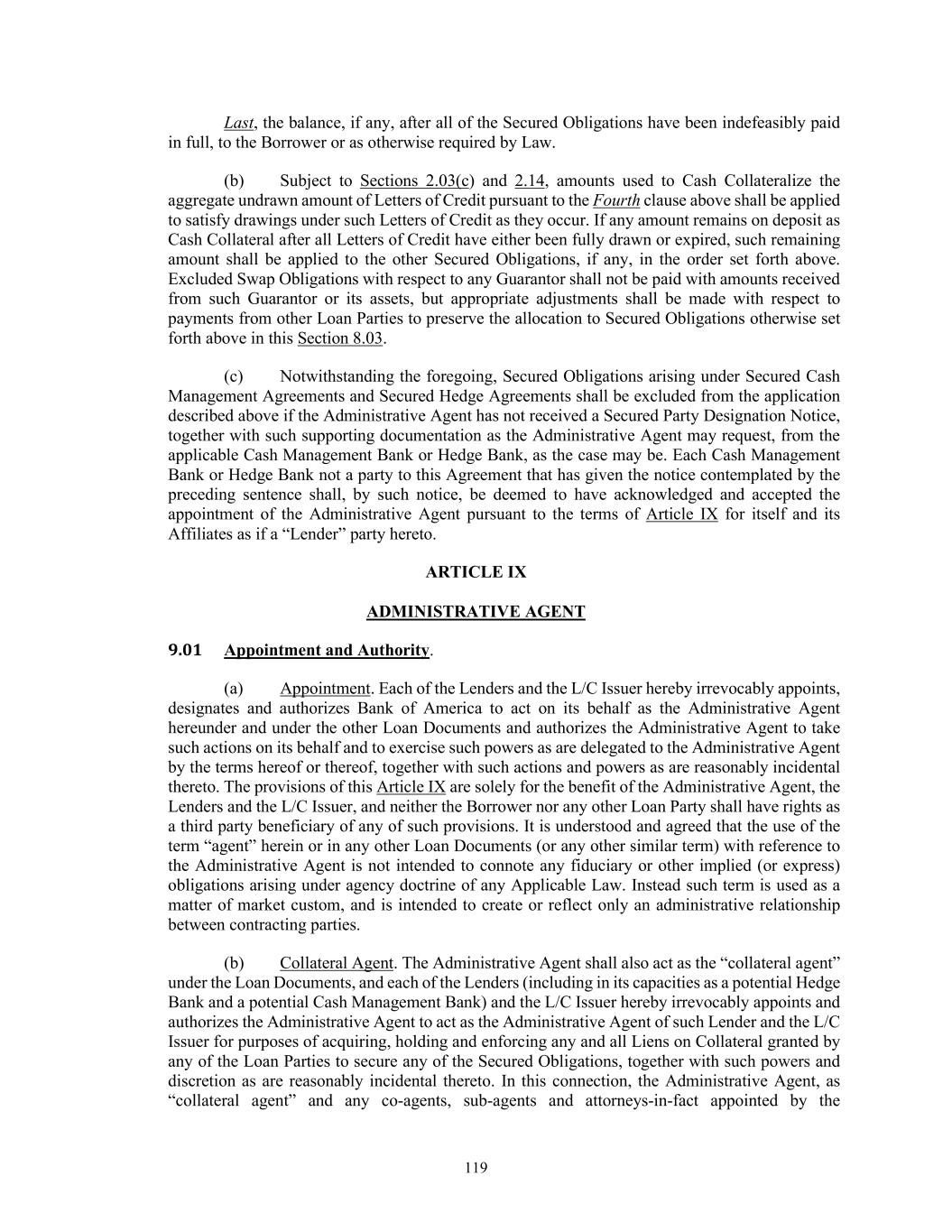 119 Last, the balance, if any, after all of the Secured Obligations have been indefeasibly paid in full, to the Borrower or as otherwise required by Law. (b) Subject to Sections 2.03(c) and 2.14, amounts used to Cash Collateralize the aggregate undrawn amount of Letters of Credit pursuant to the Fourth clause above shall be applied to satisfy drawings under such Letters of Credit as they occur. If any amount remains on deposit as Cash Collateral after all Letters of Credit have either been fully drawn or expired, such remaining amount shall be applied to the other Secured Obligations, if any, in the order set forth above. Excluded Swap Obligations with respect to any Guarantor shall not be paid with amounts received from such Guarantor or its assets, but appropriate adjustments shall be made with respect to payments from other Loan Parties to preserve the allocation to Secured Obligations otherwise set forth above in this Section 8.03. (c) Notwithstanding the foregoing, Secured Obligations arising under Secured Cash Management Agreements and Secured Hedge Agreements shall be excluded from the application described above if the Administrative Agent has not received a Secured Party Designation Notice, together with such supporting documentation as the Administrative Agent may request, from the applicable Cash Management Bank or Hedge Bank, as the case may be. Each Cash Management Bank or Hedge Bank not a party to this Agreement that has given the notice contemplated by the preceding sentence shall, by such notice, be deemed to have acknowledged and accepted the appointment of the Administrative Agent pursuant to the terms of Article IX for itself and its Affiliates as if a “Lender” party hereto. ARTICLE IX ADMINISTRATIVE AGENT 9.01 Appointment and Authority. (a) Appointment. Each of the Lenders and the L/C Issuer hereby irrevocably appoints, designates and authorizes Bank of America to act on its behalf as the Administrative Agent hereunder and under the other Loan Documents and authorizes the Administrative Agent to take such actions on its behalf and to exercise such powers as are delegated to the Administrative Agent by the terms hereof or thereof, together with such actions and powers as are reasonably incidental thereto. The provisions of this Article IX are solely for the benefit of the Administrative Agent, the Lenders and the L/C Issuer, and neither the Borrower nor any other Loan Party shall have rights as a third party beneficiary of any of such provisions. It is understood and agreed that the use of the term “agent” herein or in any other Loan Documents (or any other similar term) with reference to the Administrative Agent is not intended to connote any fiduciary or other implied (or express) obligations arising under agency doctrine of any Applicable Law. Instead such term is used as a matter of market custom, and is intended to create or reflect only an administrative relationship between contracting parties. (b) Collateral Agent. The Administrative Agent shall also act as the “collateral agent” under the Loan Documents, and each of the Lenders (including in its capacities as a potential Hedge Bank and a potential Cash Management Bank) and the L/C Issuer hereby irrevocably appoints and authorizes the Administrative Agent to act as the Administrative Agent of such Lender and the L/C Issuer for purposes of acquiring, holding and enforcing any and all Liens on Collateral granted by any of the Loan Parties to secure any of the Secured Obligations, together with such powers and discretion as are reasonably incidental thereto. In this connection, the Administrative Agent, as “collateral agent” and any co-agents, sub-agents and attorneys-in-fact appointed by the