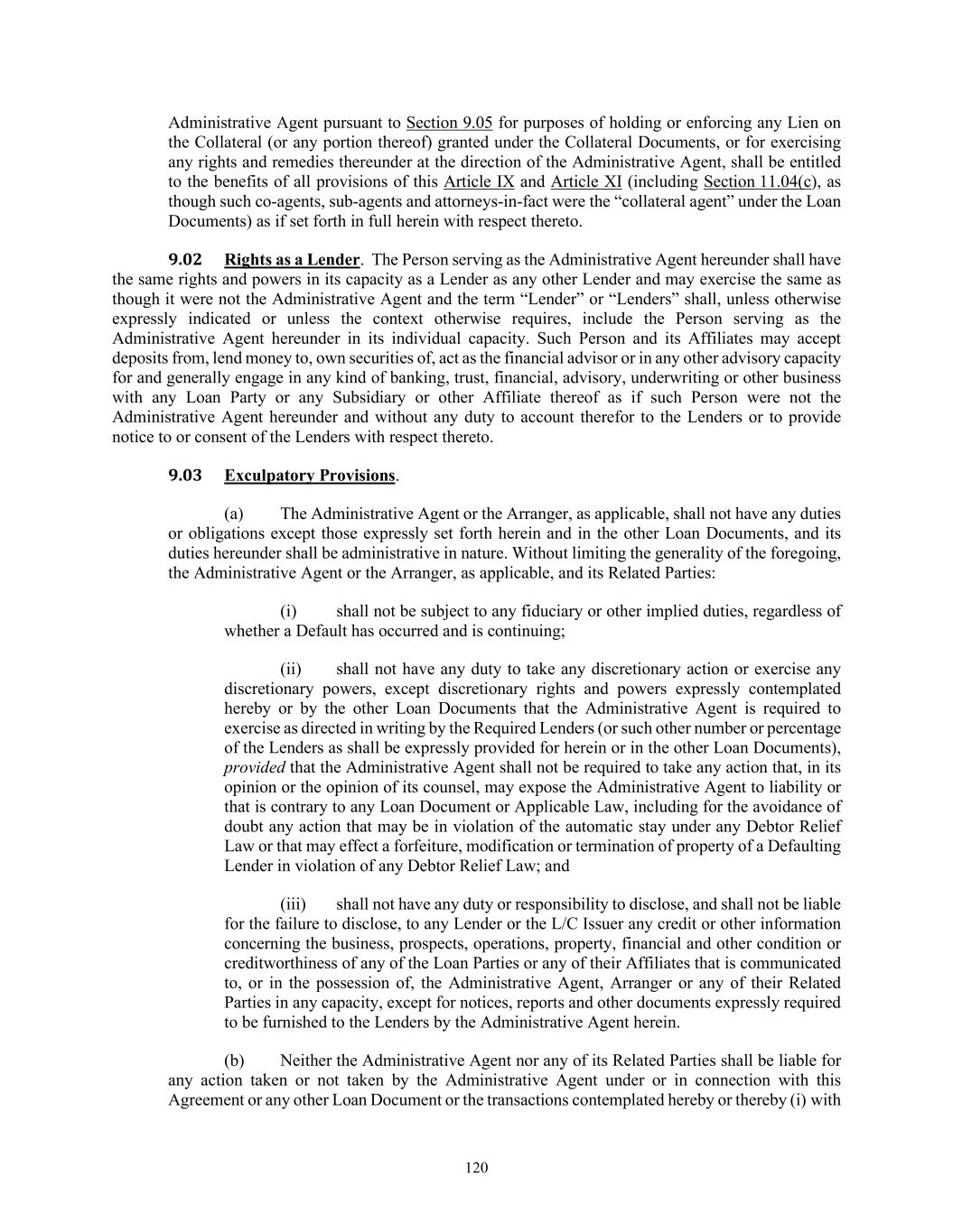 120 Administrative Agent pursuant to Section 9.05 for purposes of holding or enforcing any Lien on the Collateral (or any portion thereof) granted under the Collateral Documents, or for exercising any rights and remedies thereunder at the direction of the Administrative Agent, shall be entitled to the benefits of all provisions of this Article IX and Article XI (including Section 11.04(c), as though such co-agents, sub-agents and attorneys-in-fact were the “collateral agent” under the Loan Documents) as if set forth in full herein with respect thereto. 9.02 Rights as a Lender. The Person serving as the Administrative Agent hereunder shall have the same rights and powers in its capacity as a Lender as any other Lender and may exercise the same as though it were not the Administrative Agent and the term “Lender” or “Lenders” shall, unless otherwise expressly indicated or unless the context otherwise requires, include the Person serving as the Administrative Agent hereunder in its individual capacity. Such Person and its Affiliates may accept deposits from, lend money to, own securities of, act as the financial advisor or in any other advisory capacity for and generally engage in any kind of banking, trust, financial, advisory, underwriting or other business with any Loan Party or any Subsidiary or other Affiliate thereof as if such Person were not the Administrative Agent hereunder and without any duty to account therefor to the Lenders or to provide notice to or consent of the Lenders with respect thereto. 9.03 Exculpatory Provisions. (a) The Administrative Agent or the Arranger, as applicable, shall not have any duties or obligations except those expressly set forth herein and in the other Loan Documents, and its duties hereunder shall be administrative in nature. Without limiting the generality of the foregoing, the Administrative Agent or the Arranger, as applicable, and its Related Parties: (i) shall not be subject to any fiduciary or other implied duties, regardless of whether a Default has occurred and is continuing; (ii) shall not have any duty to take any discretionary action or exercise any discretionary powers, except discretionary rights and powers expressly contemplated hereby or by the other Loan Documents that the Administrative Agent is required to exercise as directed in writing by the Required Lenders (or such other number or percentage of the Lenders as shall be expressly provided for herein or in the other Loan Documents), provided that the Administrative Agent shall not be required to take any action that, in its opinion or the opinion of its counsel, may expose the Administrative Agent to liability or that is contrary to any Loan Document or Applicable Law, including for the avoidance of doubt any action that may be in violation of the automatic stay under any Debtor Relief Law or that may effect a forfeiture, modification or termination of property of a Defaulting Lender in violation of any Debtor Relief Law; and (iii) shall not have any duty or responsibility to disclose, and shall not be liable for the failure to disclose, to any Lender or the L/C Issuer any credit or other information concerning the business, prospects, operations, property, financial and other condition or creditworthiness of any of the Loan Parties or any of their Affiliates that is communicated to, or in the possession of, the Administrative Agent, Arranger or any of their Related Parties in any capacity, except for notices, reports and other documents expressly required to be furnished to the Lenders by the Administrative Agent herein. (b) Neither the Administrative Agent nor any of its Related Parties shall be liable for any action taken or not taken by the Administrative Agent under or in connection with this Agreement or any other Loan Document or the transactions contemplated hereby or thereby (i) with
