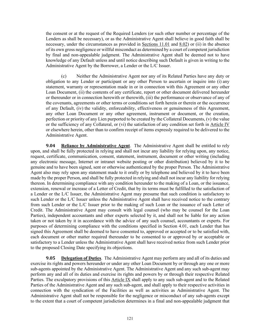 121 the consent or at the request of the Required Lenders (or such other number or percentage of the Lenders as shall be necessary), or as the Administrative Agent shall believe in good faith shall be necessary, under the circumstances as provided in Sections 11.01 and 8.02) or (ii) in the absence of its own gross negligence or willful misconduct as determined by a court of competent jurisdiction by final and non-appealable judgment. The Administrative Agent shall be deemed not to have knowledge of any Default unless and until notice describing such Default is given in writing to the Administrative Agent by the Borrower, a Lender or the L/C Issuer. (c) Neither the Administrative Agent nor any of its Related Parties have any duty or obligation to any Lender or participant or any other Person to ascertain or inquire into (i) any statement, warranty or representation made in or in connection with this Agreement or any other Loan Document, (ii) the contents of any certificate, report or other document delivered hereunder or thereunder or in connection herewith or therewith, (iii) the performance or observance of any of the covenants, agreements or other terms or conditions set forth herein or therein or the occurrence of any Default, (iv) the validity, enforceability, effectiveness or genuineness of this Agreement, any other Loan Document or any other agreement, instrument or document, or the creation, perfection or priority of any Lien purported to be created by the Collateral Documents, (v) the value or the sufficiency of any Collateral, or (vi) the satisfaction of any condition set forth in Article IV or elsewhere herein, other than to confirm receipt of items expressly required to be delivered to the Administrative Agent. 9.04 Reliance by Administrative Agent. The Administrative Agent shall be entitled to rely upon, and shall be fully protected in relying and shall not incur any liability for relying upon, any notice, request, certificate, communication, consent, statement, instrument, document or other writing (including any electronic message, Internet or intranet website posting or other distribution) believed by it to be genuine and to have been signed, sent or otherwise authenticated by the proper Person. The Administrative Agent also may rely upon any statement made to it orally or by telephone and believed by it to have been made by the proper Person, and shall be fully protected in relying and shall not incur any liability for relying thereon. In determining compliance with any condition hereunder to the making of a Loan, or the issuance, extension, renewal or increase of a Letter of Credit, that by its terms must be fulfilled to the satisfaction of a Lender or the L/C Issuer, the Administrative Agent may presume that such condition is satisfactory to such Lender or the L/C Issuer unless the Administrative Agent shall have received notice to the contrary from such Lender or the L/C Issuer prior to the making of such Loan or the issuance of such Letter of Credit. The Administrative Agent may consult with legal counsel (who may be counsel for the Loan Parties), independent accountants and other experts selected by it, and shall not be liable for any action taken or not taken by it in accordance with the advice of any such counsel, accountants or experts. For purposes of determining compliance with the conditions specified in Section 4.01, each Lender that has signed this Agreement shall be deemed to have consented to, approved or accepted or to be satisfied with, each document or other matter required thereunder to be consented to or approved by or acceptable or satisfactory to a Lender unless the Administrative Agent shall have received notice from such Lender prior to the proposed Closing Date specifying its objections. 9.05 Delegation of Duties. The Administrative Agent may perform any and all of its duties and exercise its rights and powers hereunder or under any other Loan Document by or through any one or more sub-agents appointed by the Administrative Agent. The Administrative Agent and any such sub-agent may perform any and all of its duties and exercise its rights and powers by or through their respective Related Parties. The exculpatory provisions of this Article IX shall apply to any such sub-agent and to the Related Parties of the Administrative Agent and any such sub-agent, and shall apply to their respective activities in connection with the syndication of the Facilities as well as activities as Administrative Agent. The Administrative Agent shall not be responsible for the negligence or misconduct of any sub-agents except to the extent that a court of competent jurisdiction determines in a final and non-appealable judgment that