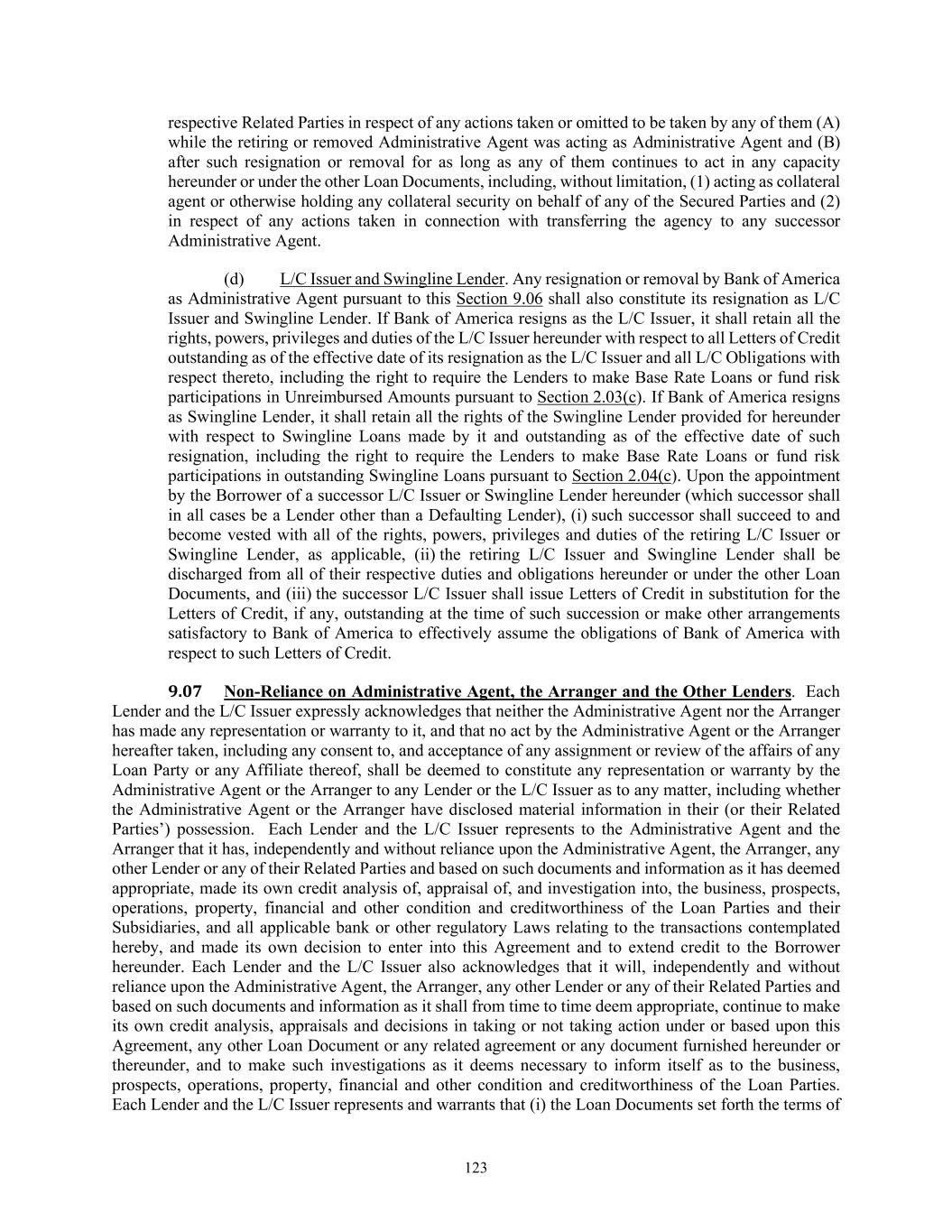 123 respective Related Parties in respect of any actions taken or omitted to be taken by any of them (A) while the retiring or removed Administrative Agent was acting as Administrative Agent and (B) after such resignation or removal for as long as any of them continues to act in any capacity hereunder or under the other Loan Documents, including, without limitation, (1) acting as collateral agent or otherwise holding any collateral security on behalf of any of the Secured Parties and (2) in respect of any actions taken in connection with transferring the agency to any successor Administrative Agent. (d) L/C Issuer and Swingline Lender. Any resignation or removal by Bank of America as Administrative Agent pursuant to this Section 9.06 shall also constitute its resignation as L/C Issuer and Swingline Lender. If Bank of America resigns as the L/C Issuer, it shall retain all the rights, powers, privileges and duties of the L/C Issuer hereunder with respect to all Letters of Credit outstanding as of the effective date of its resignation as the L/C Issuer and all L/C Obligations with respect thereto, including the right to require the Lenders to make Base Rate Loans or fund risk participations in Unreimbursed Amounts pursuant to Section 2.03(c). If Bank of America resigns as Swingline Lender, it shall retain all the rights of the Swingline Lender provided for hereunder with respect to Swingline Loans made by it and outstanding as of the effective date of such resignation, including the right to require the Lenders to make Base Rate Loans or fund risk participations in outstanding Swingline Loans pursuant to Section 2.04(c). Upon the appointment by the Borrower of a successor L/C Issuer or Swingline Lender hereunder (which successor shall in all cases be a Lender other than a Defaulting Lender), (i) such successor shall succeed to and become vested with all of the rights, powers, privileges and duties of the retiring L/C Issuer or Swingline Lender, as applicable, (ii) the retiring L/C Issuer and Swingline Lender shall be discharged from all of their respective duties and obligations hereunder or under the other Loan Documents, and (iii) the successor L/C Issuer shall issue Letters of Credit in substitution for the Letters of Credit, if any, outstanding at the time of such succession or make other arrangements satisfactory to Bank of America to effectively assume the obligations of Bank of America with respect to such Letters of Credit. 9.07 Non-Reliance on Administrative Agent, the Arranger and the Other Lenders. Each Lender and the L/C Issuer expressly acknowledges that neither the Administrative Agent nor the Arranger has made any representation or warranty to it, and that no act by the Administrative Agent or the Arranger hereafter taken, including any consent to, and acceptance of any assignment or review of the affairs of any Loan Party or any Affiliate thereof, shall be deemed to constitute any representation or warranty by the Administrative Agent or the Arranger to any Lender or the L/C Issuer as to any matter, including whether the Administrative Agent or the Arranger have disclosed material information in their (or their Related Parties’) possession. Each Lender and the L/C Issuer represents to the Administrative Agent and the Arranger that it has, independently and without reliance upon the Administrative Agent, the Arranger, any other Lender or any of their Related Parties and based on such documents and information as it has deemed appropriate, made its own credit analysis of, appraisal of, and investigation into, the business, prospects, operations, property, financial and other condition and creditworthiness of the Loan Parties and their Subsidiaries, and all applicable bank or other regulatory Laws relating to the transactions contemplated hereby, and made its own decision to enter into this Agreement and to extend credit to the Borrower hereunder. Each Lender and the L/C Issuer also acknowledges that it will, independently and without reliance upon the Administrative Agent, the Arranger, any other Lender or any of their Related Parties and based on such documents and information as it shall from time to time deem appropriate, continue to make its own credit analysis, appraisals and decisions in taking or not taking action under or based upon this Agreement, any other Loan Document or any related agreement or any document furnished hereunder or thereunder, and to make such investigations as it deems necessary to inform itself as to the business, prospects, operations, property, financial and other condition and creditworthiness of the Loan Parties. Each Lender and the L/C Issuer represents and warrants that (i) the Loan Documents set forth the terms of