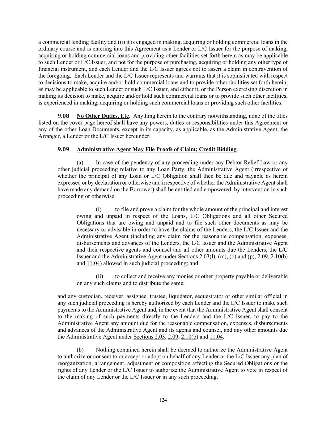 124 a commercial lending facility and (ii) it is engaged in making, acquiring or holding commercial loans in the ordinary course and is entering into this Agreement as a Lender or L/C Issuer for the purpose of making, acquiring or holding commercial loans and providing other facilities set forth herein as may be applicable to such Lender or L/C Issuer, and not for the purpose of purchasing, acquiring or holding any other type of financial instrument, and each Lender and the L/C Issuer agrees not to assert a claim in contravention of the foregoing. Each Lender and the L/C Issuer represents and warrants that it is sophisticated with respect to decisions to make, acquire and/or hold commercial loans and to provide other facilities set forth herein, as may be applicable to such Lender or such L/C Issuer, and either it, or the Person exercising discretion in making its decision to make, acquire and/or hold such commercial loans or to provide such other facilities, is experienced in making, acquiring or holding such commercial loans or providing such other facilities. 9.08 No Other Duties, Etc. Anything herein to the contrary notwithstanding, none of the titles listed on the cover page hereof shall have any powers, duties or responsibilities under this Agreement or any of the other Loan Documents, except in its capacity, as applicable, as the Administrative Agent, the Arranger, a Lender or the L/C Issuer hereunder. 9.09 Administrative Agent May File Proofs of Claim; Credit Bidding. (a) In case of the pendency of any proceeding under any Debtor Relief Law or any other judicial proceeding relative to any Loan Party, the Administrative Agent (irrespective of whether the principal of any Loan or L/C Obligation shall then be due and payable as herein expressed or by declaration or otherwise and irrespective of whether the Administrative Agent shall have made any demand on the Borrower) shall be entitled and empowered, by intervention in such proceeding or otherwise: (i) to file and prove a claim for the whole amount of the principal and interest owing and unpaid in respect of the Loans, L/C Obligations and all other Secured Obligations that are owing and unpaid and to file such other documents as may be necessary or advisable in order to have the claims of the Lenders, the L/C Issuer and the Administrative Agent (including any claim for the reasonable compensation, expenses, disbursements and advances of the Lenders, the L/C Issuer and the Administrative Agent and their respective agents and counsel and all other amounts due the Lenders, the L/C Issuer and the Administrative Agent under Sections 2.03(l), (m), (o) and (p), 2.09, 2.10(b) and 11.04) allowed in such judicial proceeding; and (ii) to collect and receive any monies or other property payable or deliverable on any such claims and to distribute the same; and any custodian, receiver, assignee, trustee, liquidator, sequestrator or other similar official in any such judicial proceeding is hereby authorized by each Lender and the L/C Issuer to make such payments to the Administrative Agent and, in the event that the Administrative Agent shall consent to the making of such payments directly to the Lenders and the L/C Issuer, to pay to the Administrative Agent any amount due for the reasonable compensation, expenses, disbursements and advances of the Administrative Agent and its agents and counsel, and any other amounts due the Administrative Agent under Sections 2.03, 2.09, 2.10(b) and 11.04. (b) Nothing contained herein shall be deemed to authorize the Administrative Agent to authorize or consent to or accept or adopt on behalf of any Lender or the L/C Issuer any plan of reorganization, arrangement, adjustment or composition affecting the Secured Obligations or the rights of any Lender or the L/C Issuer to authorize the Administrative Agent to vote in respect of the claim of any Lender or the L/C Issuer or in any such proceeding.