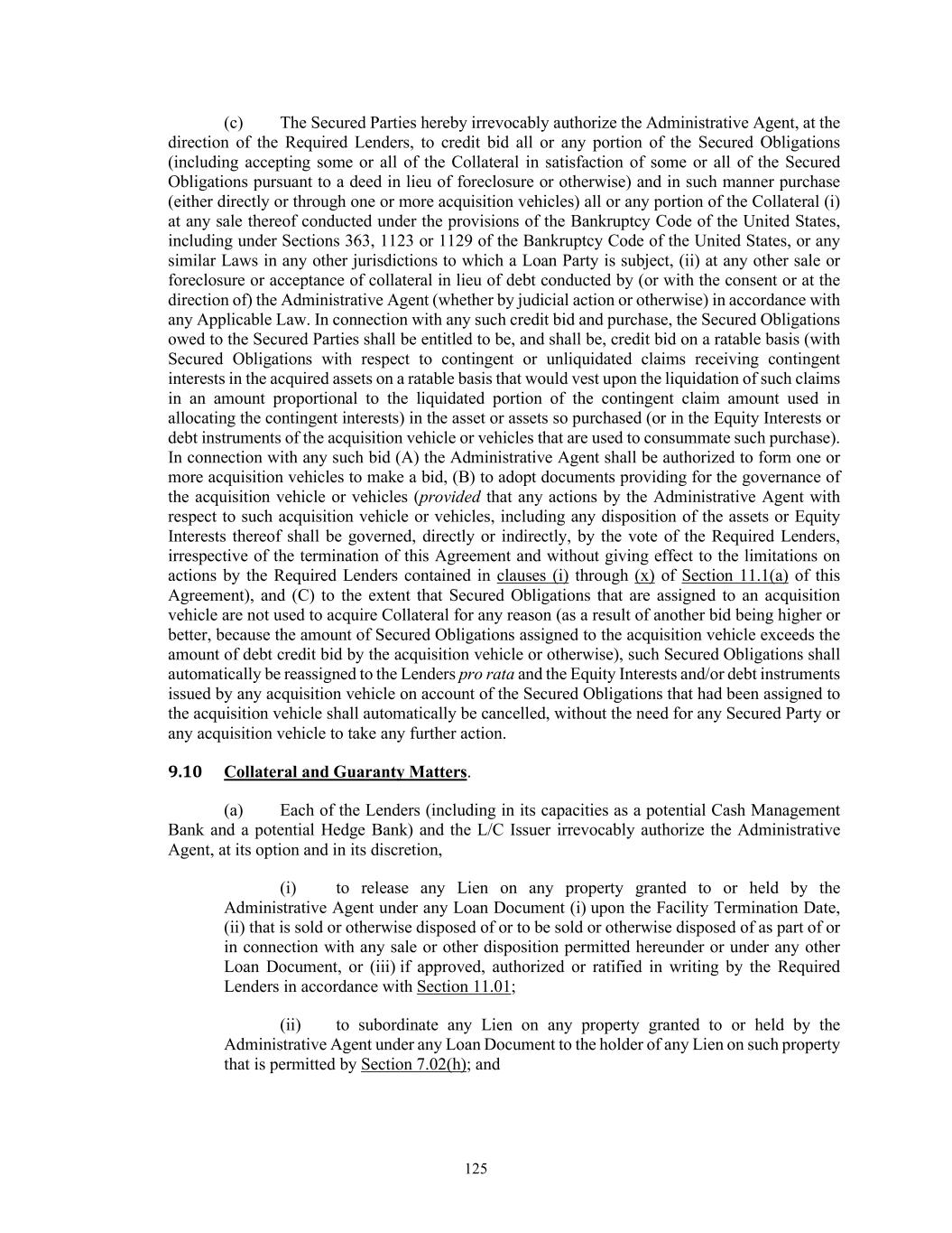125 (c) The Secured Parties hereby irrevocably authorize the Administrative Agent, at the direction of the Required Lenders, to credit bid all or any portion of the Secured Obligations (including accepting some or all of the Collateral in satisfaction of some or all of the Secured Obligations pursuant to a deed in lieu of foreclosure or otherwise) and in such manner purchase (either directly or through one or more acquisition vehicles) all or any portion of the Collateral (i) at any sale thereof conducted under the provisions of the Bankruptcy Code of the United States, including under Sections 363, 1123 or 1129 of the Bankruptcy Code of the United States, or any similar Laws in any other jurisdictions to which a Loan Party is subject, (ii) at any other sale or foreclosure or acceptance of collateral in lieu of debt conducted by (or with the consent or at the direction of) the Administrative Agent (whether by judicial action or otherwise) in accordance with any Applicable Law. In connection with any such credit bid and purchase, the Secured Obligations owed to the Secured Parties shall be entitled to be, and shall be, credit bid on a ratable basis (with Secured Obligations with respect to contingent or unliquidated claims receiving contingent interests in the acquired assets on a ratable basis that would vest upon the liquidation of such claims in an amount proportional to the liquidated portion of the contingent claim amount used in allocating the contingent interests) in the asset or assets so purchased (or in the Equity Interests or debt instruments of the acquisition vehicle or vehicles that are used to consummate such purchase). In connection with any such bid (A) the Administrative Agent shall be authorized to form one or more acquisition vehicles to make a bid, (B) to adopt documents providing for the governance of the acquisition vehicle or vehicles (provided that any actions by the Administrative Agent with respect to such acquisition vehicle or vehicles, including any disposition of the assets or Equity Interests thereof shall be governed, directly or indirectly, by the vote of the Required Lenders, irrespective of the termination of this Agreement and without giving effect to the limitations on actions by the Required Lenders contained in clauses (i) through (x) of Section 11.1(a) of this Agreement), and (C) to the extent that Secured Obligations that are assigned to an acquisition vehicle are not used to acquire Collateral for any reason (as a result of another bid being higher or better, because the amount of Secured Obligations assigned to the acquisition vehicle exceeds the amount of debt credit bid by the acquisition vehicle or otherwise), such Secured Obligations shall automatically be reassigned to the Lenders pro rata and the Equity Interests and/or debt instruments issued by any acquisition vehicle on account of the Secured Obligations that had been assigned to the acquisition vehicle shall automatically be cancelled, without the need for any Secured Party or any acquisition vehicle to take any further action. 9.10 Collateral and Guaranty Matters. (a) Each of the Lenders (including in its capacities as a potential Cash Management Bank and a potential Hedge Bank) and the L/C Issuer irrevocably authorize the Administrative Agent, at its option and in its discretion, (i) to release any Lien on any property granted to or held by the Administrative Agent under any Loan Document (i) upon the Facility Termination Date, (ii) that is sold or otherwise disposed of or to be sold or otherwise disposed of as part of or in connection with any sale or other disposition permitted hereunder or under any other Loan Document, or (iii) if approved, authorized or ratified in writing by the Required Lenders in accordance with Section 11.01; (ii) to subordinate any Lien on any property granted to or held by the Administrative Agent under any Loan Document to the holder of any Lien on such property that is permitted by Section 7.02(h); and