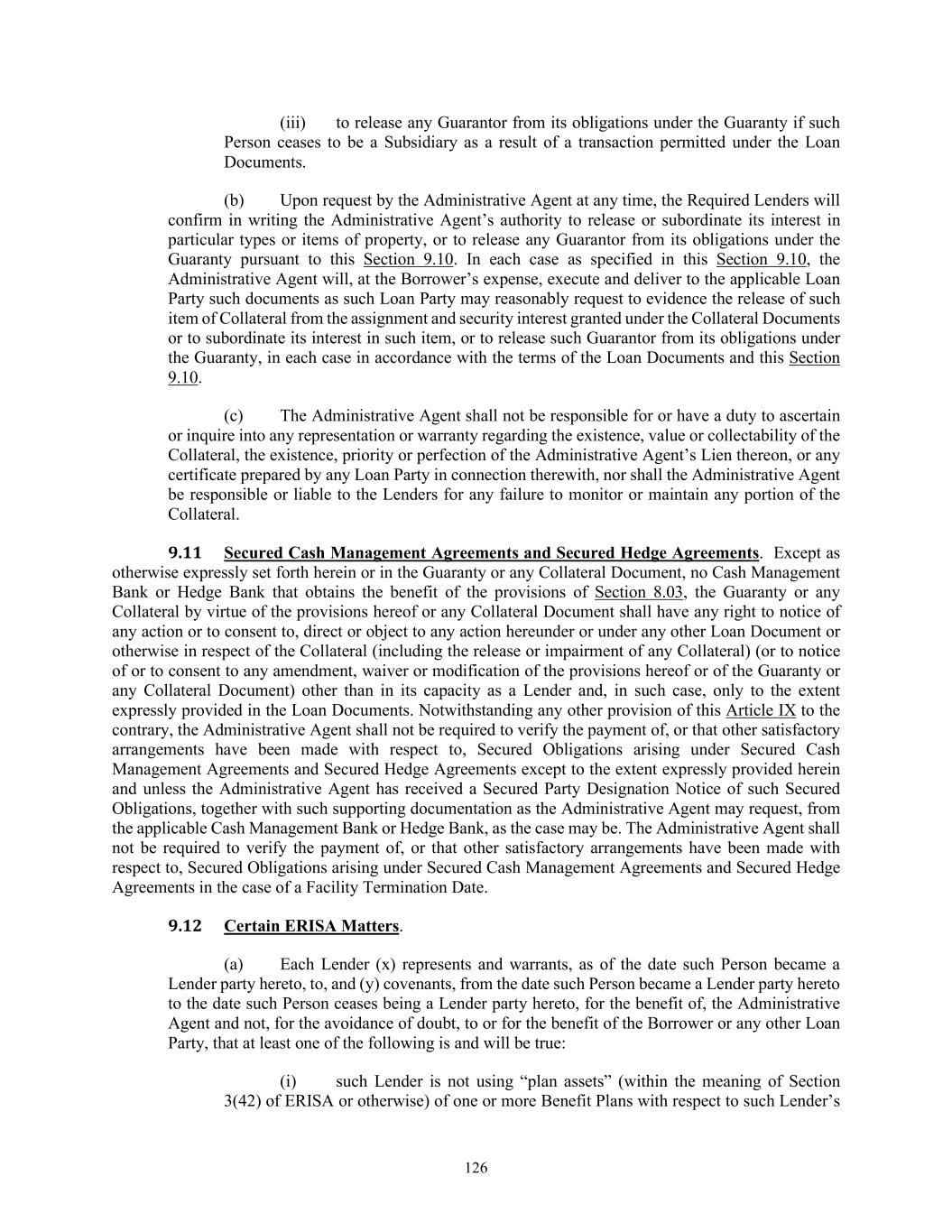 126 (iii) to release any Guarantor from its obligations under the Guaranty if such Person ceases to be a Subsidiary as a result of a transaction permitted under the Loan Documents. (b) Upon request by the Administrative Agent at any time, the Required Lenders will confirm in writing the Administrative Agent’s authority to release or subordinate its interest in particular types or items of property, or to release any Guarantor from its obligations under the Guaranty pursuant to this Section 9.10. In each case as specified in this Section 9.10, the Administrative Agent will, at the Borrower’s expense, execute and deliver to the applicable Loan Party such documents as such Loan Party may reasonably request to evidence the release of such item of Collateral from the assignment and security interest granted under the Collateral Documents or to subordinate its interest in such item, or to release such Guarantor from its obligations under the Guaranty, in each case in accordance with the terms of the Loan Documents and this Section 9.10. (c) The Administrative Agent shall not be responsible for or have a duty to ascertain or inquire into any representation or warranty regarding the existence, value or collectability of the Collateral, the existence, priority or perfection of the Administrative Agent’s Lien thereon, or any certificate prepared by any Loan Party in connection therewith, nor shall the Administrative Agent be responsible or liable to the Lenders for any failure to monitor or maintain any portion of the Collateral. 9.11 Secured Cash Management Agreements and Secured Hedge Agreements. Except as otherwise expressly set forth herein or in the Guaranty or any Collateral Document, no Cash Management Bank or Hedge Bank that obtains the benefit of the provisions of Section 8.03, the Guaranty or any Collateral by virtue of the provisions hereof or any Collateral Document shall have any right to notice of any action or to consent to, direct or object to any action hereunder or under any other Loan Document or otherwise in respect of the Collateral (including the release or impairment of any Collateral) (or to notice of or to consent to any amendment, waiver or modification of the provisions hereof or of the Guaranty or any Collateral Document) other than in its capacity as a Lender and, in such case, only to the extent expressly provided in the Loan Documents. Notwithstanding any other provision of this Article IX to the contrary, the Administrative Agent shall not be required to verify the payment of, or that other satisfactory arrangements have been made with respect to, Secured Obligations arising under Secured Cash Management Agreements and Secured Hedge Agreements except to the extent expressly provided herein and unless the Administrative Agent has received a Secured Party Designation Notice of such Secured Obligations, together with such supporting documentation as the Administrative Agent may request, from the applicable Cash Management Bank or Hedge Bank, as the case may be. The Administrative Agent shall not be required to verify the payment of, or that other satisfactory arrangements have been made with respect to, Secured Obligations arising under Secured Cash Management Agreements and Secured Hedge Agreements in the case of a Facility Termination Date. 9.12 Certain ERISA Matters. (a) Each Lender (x) represents and warrants, as of the date such Person became a Lender party hereto, to, and (y) covenants, from the date such Person became a Lender party hereto to the date such Person ceases being a Lender party hereto, for the benefit of, the Administrative Agent and not, for the avoidance of doubt, to or for the benefit of the Borrower or any other Loan Party, that at least one of the following is and will be true: (i) such Lender is not using “plan assets” (within the meaning of Section 3(42) of ERISA or otherwise) of one or more Benefit Plans with respect to such Lender’s