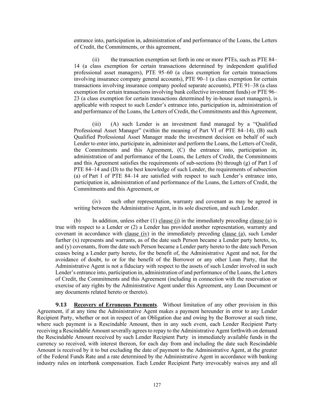 127 entrance into, participation in, administration of and performance of the Loans, the Letters of Credit, the Commitments, or this agreement, (ii) the transaction exemption set forth in one or more PTEs, such as PTE 84– 14 (a class exemption for certain transactions determined by independent qualified professional asset managers), PTE 95–60 (a class exemption for certain transactions involving insurance company general accounts), PTE 90–1 (a class exemption for certain transactions involving insurance company pooled separate accounts), PTE 91–38 (a class exemption for certain transactions involving bank collective investment funds) or PTE 96– 23 (a class exemption for certain transactions determined by in-house asset managers), is applicable with respect to such Lender’s entrance into, participation in, administration of and performance of the Loans, the Letters of Credit, the Commitments and this Agreement, (iii) (A) such Lender is an investment fund managed by a “Qualified Professional Asset Manager” (within the meaning of Part VI of PTE 84–14), (B) such Qualified Professional Asset Manager made the investment decision on behalf of such Lender to enter into, participate in, administer and perform the Loans, the Letters of Credit, the Commitments and this Agreement, (C) the entrance into, participation in, administration of and performance of the Loans, the Letters of Credit, the Commitments and this Agreement satisfies the requirements of sub-sections (b) through (g) of Part I of PTE 84–14 and (D) to the best knowledge of such Lender, the requirements of subsection (a) of Part I of PTE 84–14 are satisfied with respect to such Lender’s entrance into, participation in, administration of and performance of the Loans, the Letters of Credit, the Commitments and this Agreement, or (iv) such other representation, warranty and covenant as may be agreed in writing between the Administrative Agent, in its sole discretion, and such Lender. (b) In addition, unless either (1) clause (i) in the immediately preceding clause (a) is true with respect to a Lender or (2) a Lender has provided another representation, warranty and covenant in accordance with clause (iv) in the immediately preceding clause (a), such Lender further (x) represents and warrants, as of the date such Person became a Lender party hereto, to, and (y) covenants, from the date such Person became a Lender party hereto to the date such Person ceases being a Lender party hereto, for the benefit of, the Administrative Agent and not, for the avoidance of doubt, to or for the benefit of the Borrower or any other Loan Party, that the Administrative Agent is not a fiduciary with respect to the assets of such Lender involved in such Lender’s entrance into, participation in, administration of and performance of the Loans, the Letters of Credit, the Commitments and this Agreement (including in connection with the reservation or exercise of any rights by the Administrative Agent under this Agreement, any Loan Document or any documents related hereto or thereto). 9.13 Recovery of Erroneous Payments. Without limitation of any other provision in this Agreement, if at any time the Administrative Agent makes a payment hereunder in error to any Lender Recipient Party, whether or not in respect of an Obligation due and owing by the Borrower at such time, where such payment is a Rescindable Amount, then in any such event, each Lender Recipient Party receiving a Rescindable Amount severally agrees to repay to the Administrative Agent forthwith on demand the Rescindable Amount received by such Lender Recipient Party in immediately available funds in the currency so received, with interest thereon, for each day from and including the date such Rescindable Amount is received by it to but excluding the date of payment to the Administrative Agent, at the greater of the Federal Funds Rate and a rate determined by the Administrative Agent in accordance with banking industry rules on interbank compensation. Each Lender Recipient Party irrevocably waives any and all