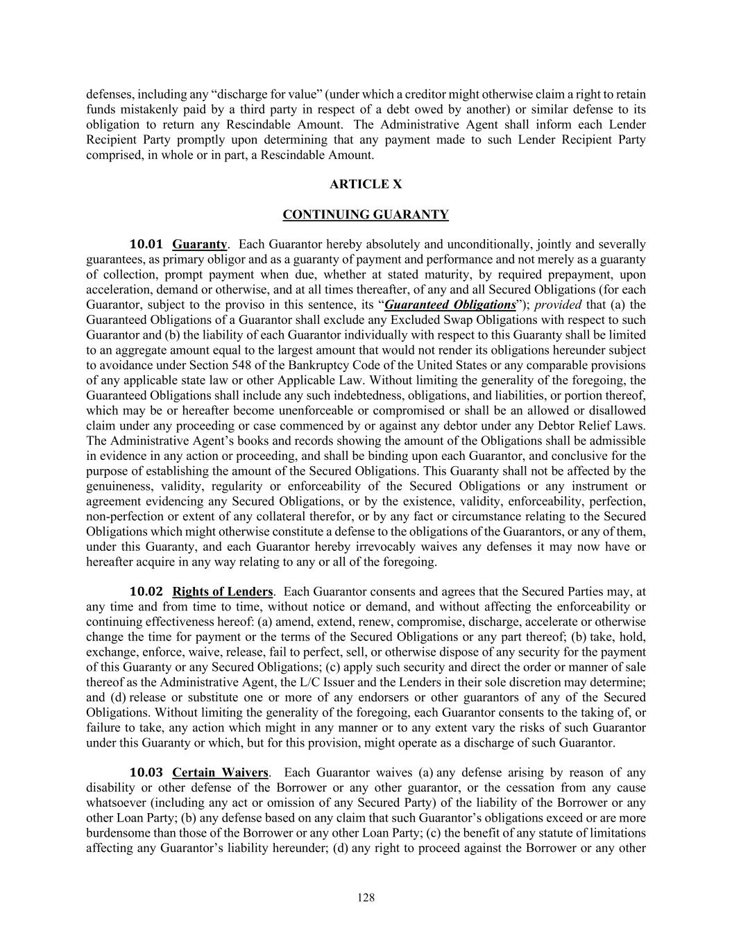 128 defenses, including any “discharge for value” (under which a creditor might otherwise claim a right to retain funds mistakenly paid by a third party in respect of a debt owed by another) or similar defense to its obligation to return any Rescindable Amount. The Administrative Agent shall inform each Lender Recipient Party promptly upon determining that any payment made to such Lender Recipient Party comprised, in whole or in part, a Rescindable Amount. ARTICLE X CONTINUING GUARANTY 10.01 Guaranty. Each Guarantor hereby absolutely and unconditionally, jointly and severally guarantees, as primary obligor and as a guaranty of payment and performance and not merely as a guaranty of collection, prompt payment when due, whether at stated maturity, by required prepayment, upon acceleration, demand or otherwise, and at all times thereafter, of any and all Secured Obligations (for each Guarantor, subject to the proviso in this sentence, its “Guaranteed Obligations”); provided that (a) the Guaranteed Obligations of a Guarantor shall exclude any Excluded Swap Obligations with respect to such Guarantor and (b) the liability of each Guarantor individually with respect to this Guaranty shall be limited to an aggregate amount equal to the largest amount that would not render its obligations hereunder subject to avoidance under Section 548 of the Bankruptcy Code of the United States or any comparable provisions of any applicable state law or other Applicable Law. Without limiting the generality of the foregoing, the Guaranteed Obligations shall include any such indebtedness, obligations, and liabilities, or portion thereof, which may be or hereafter become unenforceable or compromised or shall be an allowed or disallowed claim under any proceeding or case commenced by or against any debtor under any Debtor Relief Laws. The Administrative Agent’s books and records showing the amount of the Obligations shall be admissible in evidence in any action or proceeding, and shall be binding upon each Guarantor, and conclusive for the purpose of establishing the amount of the Secured Obligations. This Guaranty shall not be affected by the genuineness, validity, regularity or enforceability of the Secured Obligations or any instrument or agreement evidencing any Secured Obligations, or by the existence, validity, enforceability, perfection, non-perfection or extent of any collateral therefor, or by any fact or circumstance relating to the Secured Obligations which might otherwise constitute a defense to the obligations of the Guarantors, or any of them, under this Guaranty, and each Guarantor hereby irrevocably waives any defenses it may now have or hereafter acquire in any way relating to any or all of the foregoing. 10.02 Rights of Lenders. Each Guarantor consents and agrees that the Secured Parties may, at any time and from time to time, without notice or demand, and without affecting the enforceability or continuing effectiveness hereof: (a) amend, extend, renew, compromise, discharge, accelerate or otherwise change the time for payment or the terms of the Secured Obligations or any part thereof; (b) take, hold, exchange, enforce, waive, release, fail to perfect, sell, or otherwise dispose of any security for the payment of this Guaranty or any Secured Obligations; (c) apply such security and direct the order or manner of sale thereof as the Administrative Agent, the L/C Issuer and the Lenders in their sole discretion may determine; and (d) release or substitute one or more of any endorsers or other guarantors of any of the Secured Obligations. Without limiting the generality of the foregoing, each Guarantor consents to the taking of, or failure to take, any action which might in any manner or to any extent vary the risks of such Guarantor under this Guaranty or which, but for this provision, might operate as a discharge of such Guarantor. 10.03 Certain Waivers. Each Guarantor waives (a) any defense arising by reason of any disability or other defense of the Borrower or any other guarantor, or the cessation from any cause whatsoever (including any act or omission of any Secured Party) of the liability of the Borrower or any other Loan Party; (b) any defense based on any claim that such Guarantor’s obligations exceed or are more burdensome than those of the Borrower or any other Loan Party; (c) the benefit of any statute of limitations affecting any Guarantor’s liability hereunder; (d) any right to proceed against the Borrower or any other