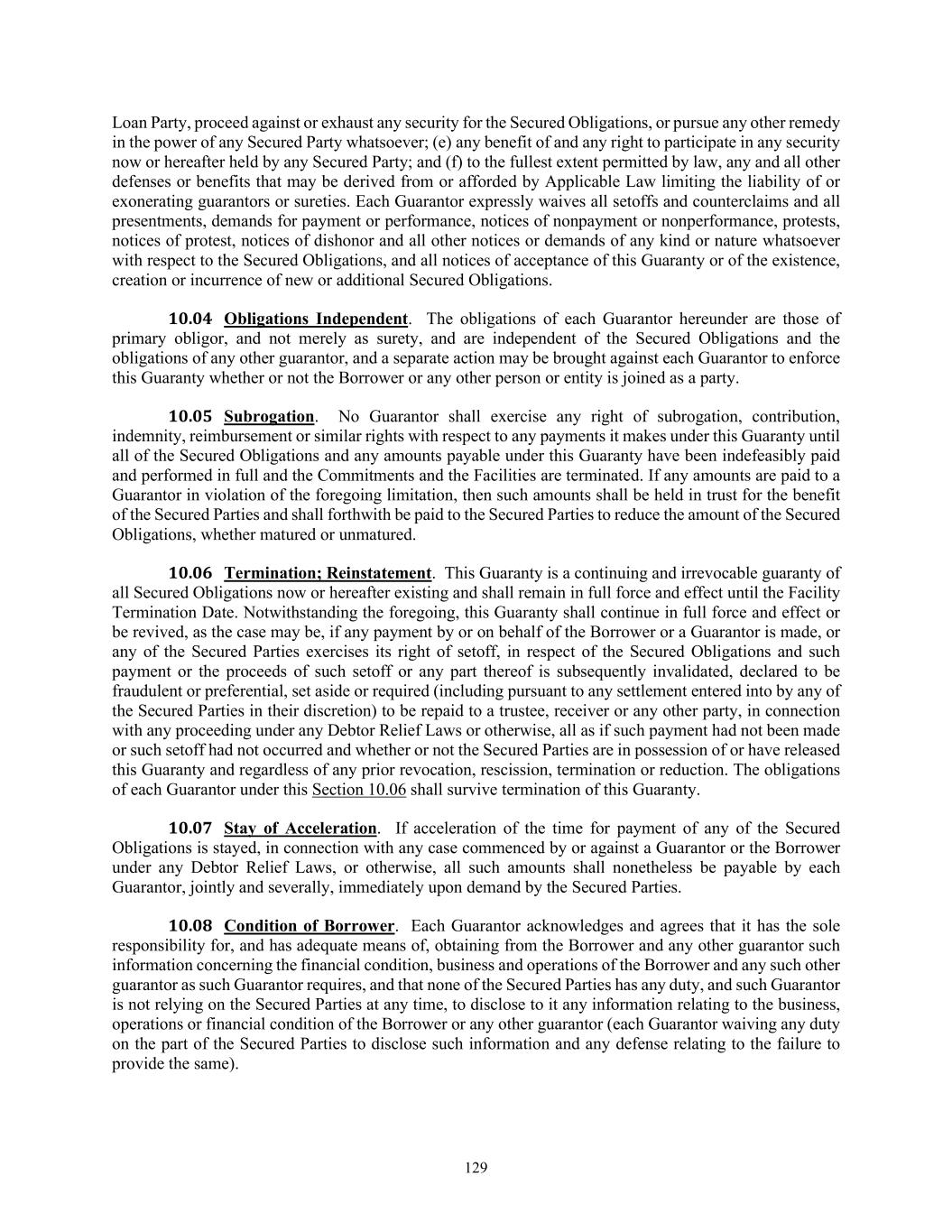 129 Loan Party, proceed against or exhaust any security for the Secured Obligations, or pursue any other remedy in the power of any Secured Party whatsoever; (e) any benefit of and any right to participate in any security now or hereafter held by any Secured Party; and (f) to the fullest extent permitted by law, any and all other defenses or benefits that may be derived from or afforded by Applicable Law limiting the liability of or exonerating guarantors or sureties. Each Guarantor expressly waives all setoffs and counterclaims and all presentments, demands for payment or performance, notices of nonpayment or nonperformance, protests, notices of protest, notices of dishonor and all other notices or demands of any kind or nature whatsoever with respect to the Secured Obligations, and all notices of acceptance of this Guaranty or of the existence, creation or incurrence of new or additional Secured Obligations. 10.04 Obligations Independent. The obligations of each Guarantor hereunder are those of primary obligor, and not merely as surety, and are independent of the Secured Obligations and the obligations of any other guarantor, and a separate action may be brought against each Guarantor to enforce this Guaranty whether or not the Borrower or any other person or entity is joined as a party. 10.05 Subrogation. No Guarantor shall exercise any right of subrogation, contribution, indemnity, reimbursement or similar rights with respect to any payments it makes under this Guaranty until all of the Secured Obligations and any amounts payable under this Guaranty have been indefeasibly paid and performed in full and the Commitments and the Facilities are terminated. If any amounts are paid to a Guarantor in violation of the foregoing limitation, then such amounts shall be held in trust for the benefit of the Secured Parties and shall forthwith be paid to the Secured Parties to reduce the amount of the Secured Obligations, whether matured or unmatured. 10.06 Termination; Reinstatement. This Guaranty is a continuing and irrevocable guaranty of all Secured Obligations now or hereafter existing and shall remain in full force and effect until the Facility Termination Date. Notwithstanding the foregoing, this Guaranty shall continue in full force and effect or be revived, as the case may be, if any payment by or on behalf of the Borrower or a Guarantor is made, or any of the Secured Parties exercises its right of setoff, in respect of the Secured Obligations and such payment or the proceeds of such setoff or any part thereof is subsequently invalidated, declared to be fraudulent or preferential, set aside or required (including pursuant to any settlement entered into by any of the Secured Parties in their discretion) to be repaid to a trustee, receiver or any other party, in connection with any proceeding under any Debtor Relief Laws or otherwise, all as if such payment had not been made or such setoff had not occurred and whether or not the Secured Parties are in possession of or have released this Guaranty and regardless of any prior revocation, rescission, termination or reduction. The obligations of each Guarantor under this Section 10.06 shall survive termination of this Guaranty. 10.07 Stay of Acceleration. If acceleration of the time for payment of any of the Secured Obligations is stayed, in connection with any case commenced by or against a Guarantor or the Borrower under any Debtor Relief Laws, or otherwise, all such amounts shall nonetheless be payable by each Guarantor, jointly and severally, immediately upon demand by the Secured Parties. 10.08 Condition of Borrower. Each Guarantor acknowledges and agrees that it has the sole responsibility for, and has adequate means of, obtaining from the Borrower and any other guarantor such information concerning the financial condition, business and operations of the Borrower and any such other guarantor as such Guarantor requires, and that none of the Secured Parties has any duty, and such Guarantor is not relying on the Secured Parties at any time, to disclose to it any information relating to the business, operations or financial condition of the Borrower or any other guarantor (each Guarantor waiving any duty on the part of the Secured Parties to disclose such information and any defense relating to the failure to provide the same).