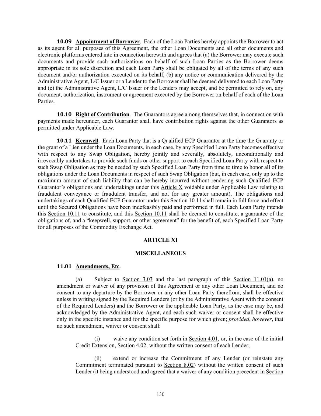 130 10.09 Appointment of Borrower. Each of the Loan Parties hereby appoints the Borrower to act as its agent for all purposes of this Agreement, the other Loan Documents and all other documents and electronic platforms entered into in connection herewith and agrees that (a) the Borrower may execute such documents and provide such authorizations on behalf of such Loan Parties as the Borrower deems appropriate in its sole discretion and each Loan Party shall be obligated by all of the terms of any such document and/or authorization executed on its behalf, (b) any notice or communication delivered by the Administrative Agent, L/C Issuer or a Lender to the Borrower shall be deemed delivered to each Loan Party and (c) the Administrative Agent, L/C Issuer or the Lenders may accept, and be permitted to rely on, any document, authorization, instrument or agreement executed by the Borrower on behalf of each of the Loan Parties. 10.10 Right of Contribution. The Guarantors agree among themselves that, in connection with payments made hereunder, each Guarantor shall have contribution rights against the other Guarantors as permitted under Applicable Law. 10.11 Keepwell. Each Loan Party that is a Qualified ECP Guarantor at the time the Guaranty or the grant of a Lien under the Loan Documents, in each case, by any Specified Loan Party becomes effective with respect to any Swap Obligation, hereby jointly and severally, absolutely, unconditionally and irrevocably undertakes to provide such funds or other support to each Specified Loan Party with respect to such Swap Obligation as may be needed by such Specified Loan Party from time to time to honor all of its obligations under the Loan Documents in respect of such Swap Obligation (but, in each case, only up to the maximum amount of such liability that can be hereby incurred without rendering such Qualified ECP Guarantor’s obligations and undertakings under this Article X voidable under Applicable Law relating to fraudulent conveyance or fraudulent transfer, and not for any greater amount). The obligations and undertakings of each Qualified ECP Guarantor under this Section 10.11 shall remain in full force and effect until the Secured Obligations have been indefeasibly paid and performed in full. Each Loan Party intends this Section 10.11 to constitute, and this Section 10.11 shall be deemed to constitute, a guarantee of the obligations of, and a “keepwell, support, or other agreement” for the benefit of, each Specified Loan Party for all purposes of the Commodity Exchange Act. ARTICLE XI MISCELLANEOUS 11.01 Amendments, Etc. (a) Subject to Section 3.03 and the last paragraph of this Section 11.01(a), no amendment or waiver of any provision of this Agreement or any other Loan Document, and no consent to any departure by the Borrower or any other Loan Party therefrom, shall be effective unless in writing signed by the Required Lenders (or by the Administrative Agent with the consent of the Required Lenders) and the Borrower or the applicable Loan Party, as the case may be, and acknowledged by the Administrative Agent, and each such waiver or consent shall be effective only in the specific instance and for the specific purpose for which given; provided, however, that no such amendment, waiver or consent shall: (i) waive any condition set forth in Section 4.01, or, in the case of the initial Credit Extension, Section 4.02, without the written consent of each Lender; (ii) extend or increase the Commitment of any Lender (or reinstate any Commitment terminated pursuant to Section 8.02) without the written consent of such Lender (it being understood and agreed that a waiver of any condition precedent in Section