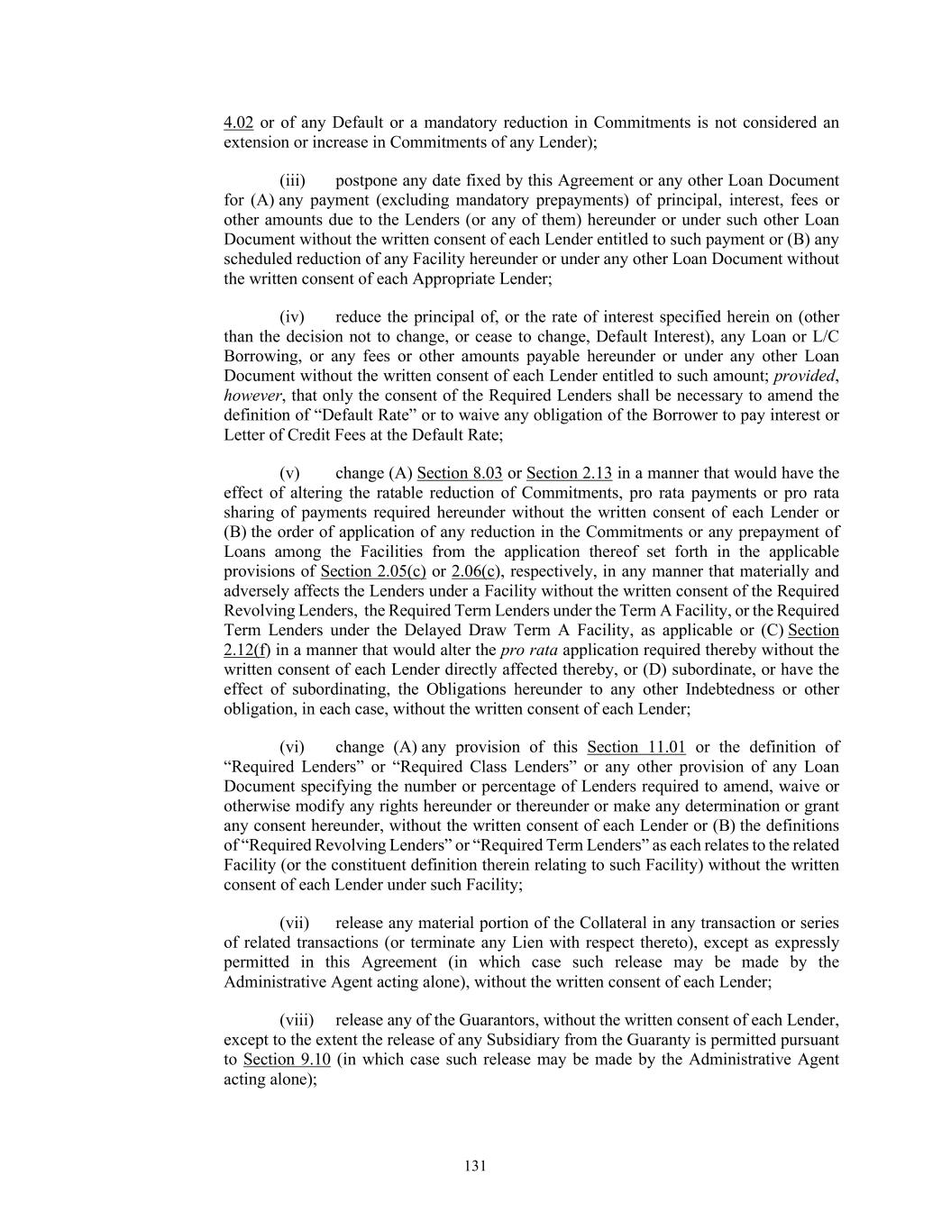 131 4.02 or of any Default or a mandatory reduction in Commitments is not considered an extension or increase in Commitments of any Lender); (iii) postpone any date fixed by this Agreement or any other Loan Document for (A) any payment (excluding mandatory prepayments) of principal, interest, fees or other amounts due to the Lenders (or any of them) hereunder or under such other Loan Document without the written consent of each Lender entitled to such payment or (B) any scheduled reduction of any Facility hereunder or under any other Loan Document without the written consent of each Appropriate Lender; (iv) reduce the principal of, or the rate of interest specified herein on (other than the decision not to change, or cease to change, Default Interest), any Loan or L/C Borrowing, or any fees or other amounts payable hereunder or under any other Loan Document without the written consent of each Lender entitled to such amount; provided, however, that only the consent of the Required Lenders shall be necessary to amend the definition of “Default Rate” or to waive any obligation of the Borrower to pay interest or Letter of Credit Fees at the Default Rate; (v) change (A) Section 8.03 or Section 2.13 in a manner that would have the effect of altering the ratable reduction of Commitments, pro rata payments or pro rata sharing of payments required hereunder without the written consent of each Lender or (B) the order of application of any reduction in the Commitments or any prepayment of Loans among the Facilities from the application thereof set forth in the applicable provisions of Section 2.05(c) or 2.06(c), respectively, in any manner that materially and adversely affects the Lenders under a Facility without the written consent of the Required Revolving Lenders, the Required Term Lenders under the Term A Facility, or the Required Term Lenders under the Delayed Draw Term A Facility, as applicable or (C) Section 2.12(f) in a manner that would alter the pro rata application required thereby without the written consent of each Lender directly affected thereby, or (D) subordinate, or have the effect of subordinating, the Obligations hereunder to any other Indebtedness or other obligation, in each case, without the written consent of each Lender; (vi) change (A) any provision of this Section 11.01 or the definition of “Required Lenders” or “Required Class Lenders” or any other provision of any Loan Document specifying the number or percentage of Lenders required to amend, waive or otherwise modify any rights hereunder or thereunder or make any determination or grant any consent hereunder, without the written consent of each Lender or (B) the definitions of “Required Revolving Lenders” or “Required Term Lenders” as each relates to the related Facility (or the constituent definition therein relating to such Facility) without the written consent of each Lender under such Facility; (vii) release any material portion of the Collateral in any transaction or series of related transactions (or terminate any Lien with respect thereto), except as expressly permitted in this Agreement (in which case such release may be made by the Administrative Agent acting alone), without the written consent of each Lender; (viii) release any of the Guarantors, without the written consent of each Lender, except to the extent the release of any Subsidiary from the Guaranty is permitted pursuant to Section 9.10 (in which case such release may be made by the Administrative Agent acting alone);