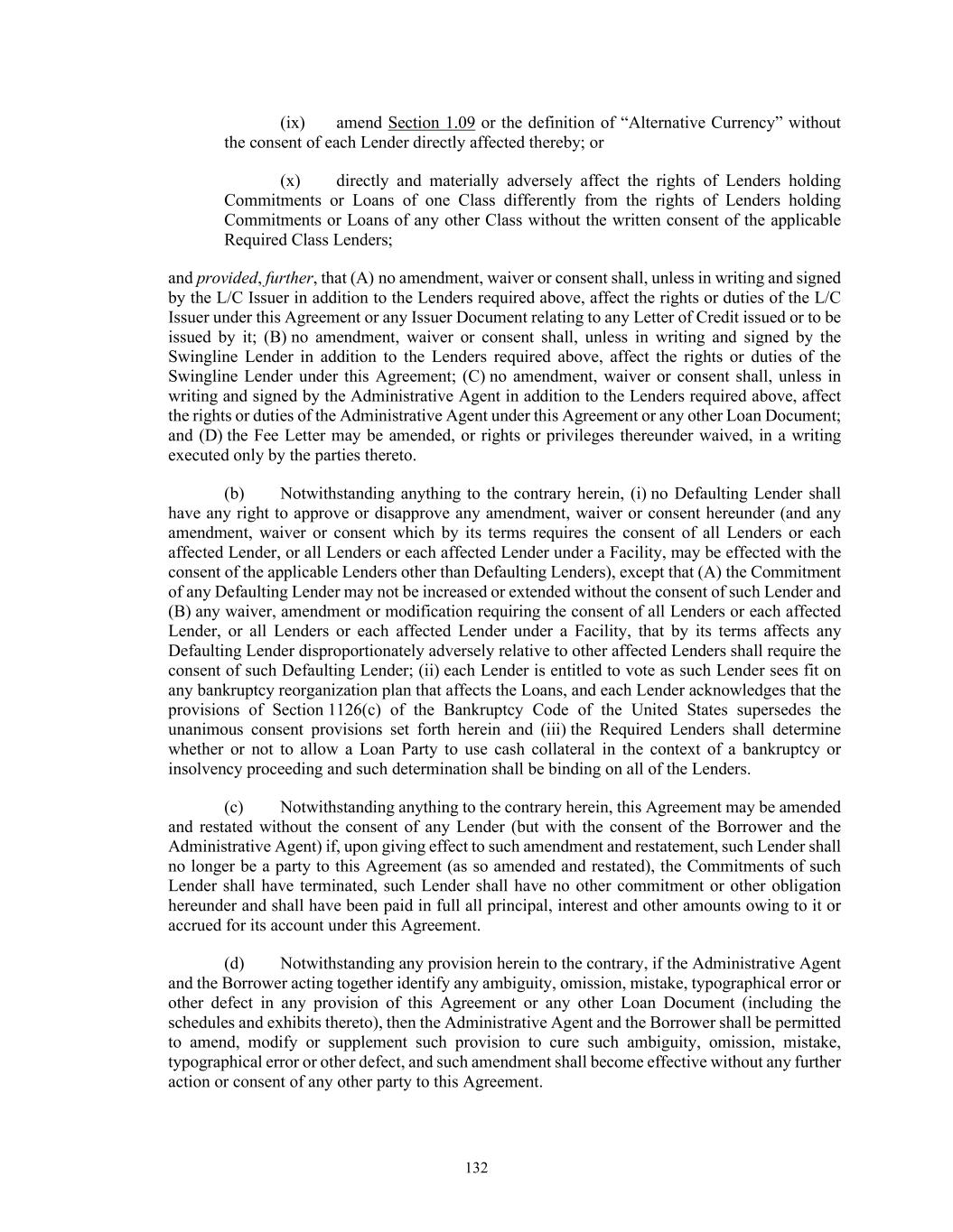 132 (ix) amend Section 1.09 or the definition of “Alternative Currency” without the consent of each Lender directly affected thereby; or (x) directly and materially adversely affect the rights of Lenders holding Commitments or Loans of one Class differently from the rights of Lenders holding Commitments or Loans of any other Class without the written consent of the applicable Required Class Lenders; and provided, further, that (A) no amendment, waiver or consent shall, unless in writing and signed by the L/C Issuer in addition to the Lenders required above, affect the rights or duties of the L/C Issuer under this Agreement or any Issuer Document relating to any Letter of Credit issued or to be issued by it; (B) no amendment, waiver or consent shall, unless in writing and signed by the Swingline Lender in addition to the Lenders required above, affect the rights or duties of the Swingline Lender under this Agreement; (C) no amendment, waiver or consent shall, unless in writing and signed by the Administrative Agent in addition to the Lenders required above, affect the rights or duties of the Administrative Agent under this Agreement or any other Loan Document; and (D) the Fee Letter may be amended, or rights or privileges thereunder waived, in a writing executed only by the parties thereto. (b) Notwithstanding anything to the contrary herein, (i) no Defaulting Lender shall have any right to approve or disapprove any amendment, waiver or consent hereunder (and any amendment, waiver or consent which by its terms requires the consent of all Lenders or each affected Lender, or all Lenders or each affected Lender under a Facility, may be effected with the consent of the applicable Lenders other than Defaulting Lenders), except that (A) the Commitment of any Defaulting Lender may not be increased or extended without the consent of such Lender and (B) any waiver, amendment or modification requiring the consent of all Lenders or each affected Lender, or all Lenders or each affected Lender under a Facility, that by its terms affects any Defaulting Lender disproportionately adversely relative to other affected Lenders shall require the consent of such Defaulting Lender; (ii) each Lender is entitled to vote as such Lender sees fit on any bankruptcy reorganization plan that affects the Loans, and each Lender acknowledges that the provisions of Section 1126(c) of the Bankruptcy Code of the United States supersedes the unanimous consent provisions set forth herein and (iii) the Required Lenders shall determine whether or not to allow a Loan Party to use cash collateral in the context of a bankruptcy or insolvency proceeding and such determination shall be binding on all of the Lenders. (c) Notwithstanding anything to the contrary herein, this Agreement may be amended and restated without the consent of any Lender (but with the consent of the Borrower and the Administrative Agent) if, upon giving effect to such amendment and restatement, such Lender shall no longer be a party to this Agreement (as so amended and restated), the Commitments of such Lender shall have terminated, such Lender shall have no other commitment or other obligation hereunder and shall have been paid in full all principal, interest and other amounts owing to it or accrued for its account under this Agreement. (d) Notwithstanding any provision herein to the contrary, if the Administrative Agent and the Borrower acting together identify any ambiguity, omission, mistake, typographical error or other defect in any provision of this Agreement or any other Loan Document (including the schedules and exhibits thereto), then the Administrative Agent and the Borrower shall be permitted to amend, modify or supplement such provision to cure such ambiguity, omission, mistake, typographical error or other defect, and such amendment shall become effective without any further action or consent of any other party to this Agreement.